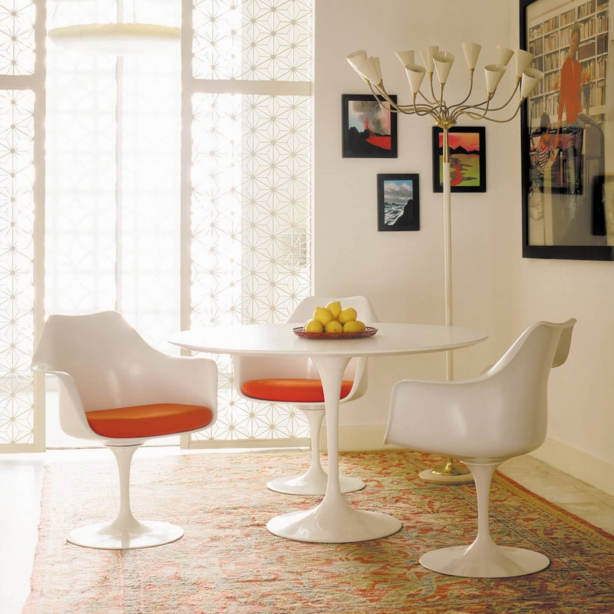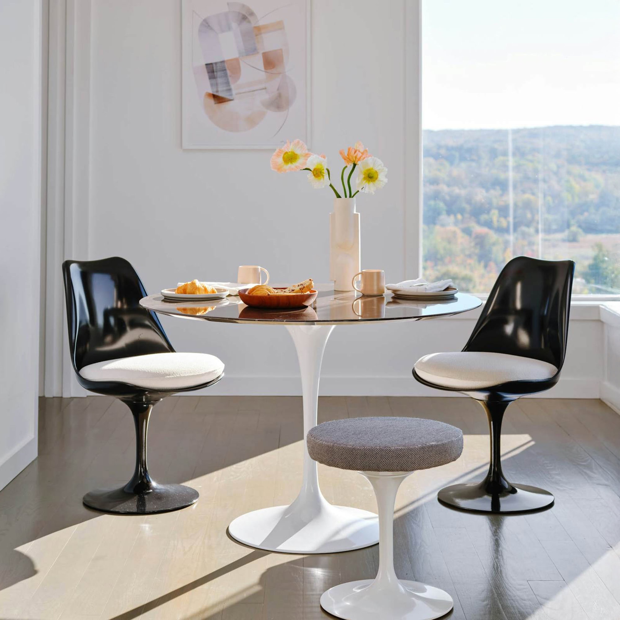 The Tulip Dining Chair, designed by Eero Saarinen, is an enduring icon of mid-century modern design and part of the celebrated Pedestal Collection. In his quest for a cleaner, more harmonious aesthetic, Saarinen sought to eliminate the “slum of legs” found beneath traditional tables and chairs. The result was a groundbreaking one-legged pedestal base that flows seamlessly into a sculpted seat, creating an elegant silhouette that feels as fresh today as it did upon its debut. Its organic form pairs beautifully with both modern and classic interiors, making it a versatile and timeless addition to any dining space.