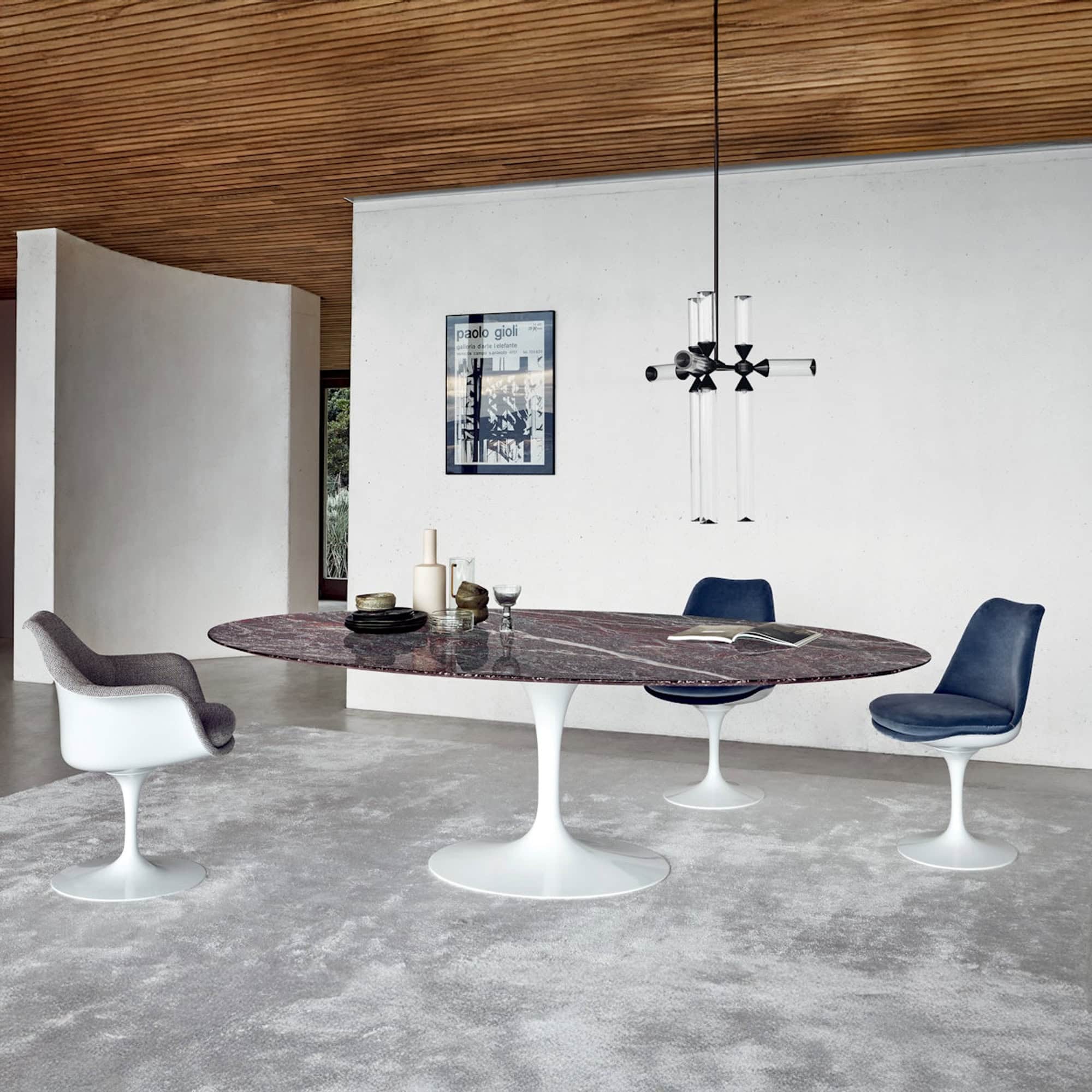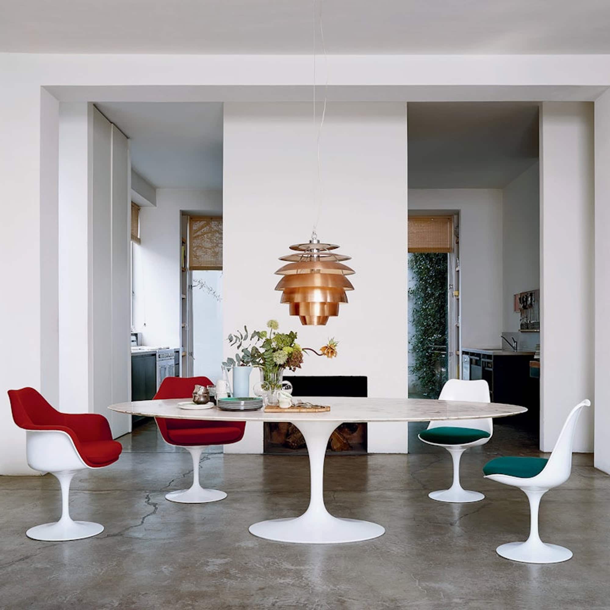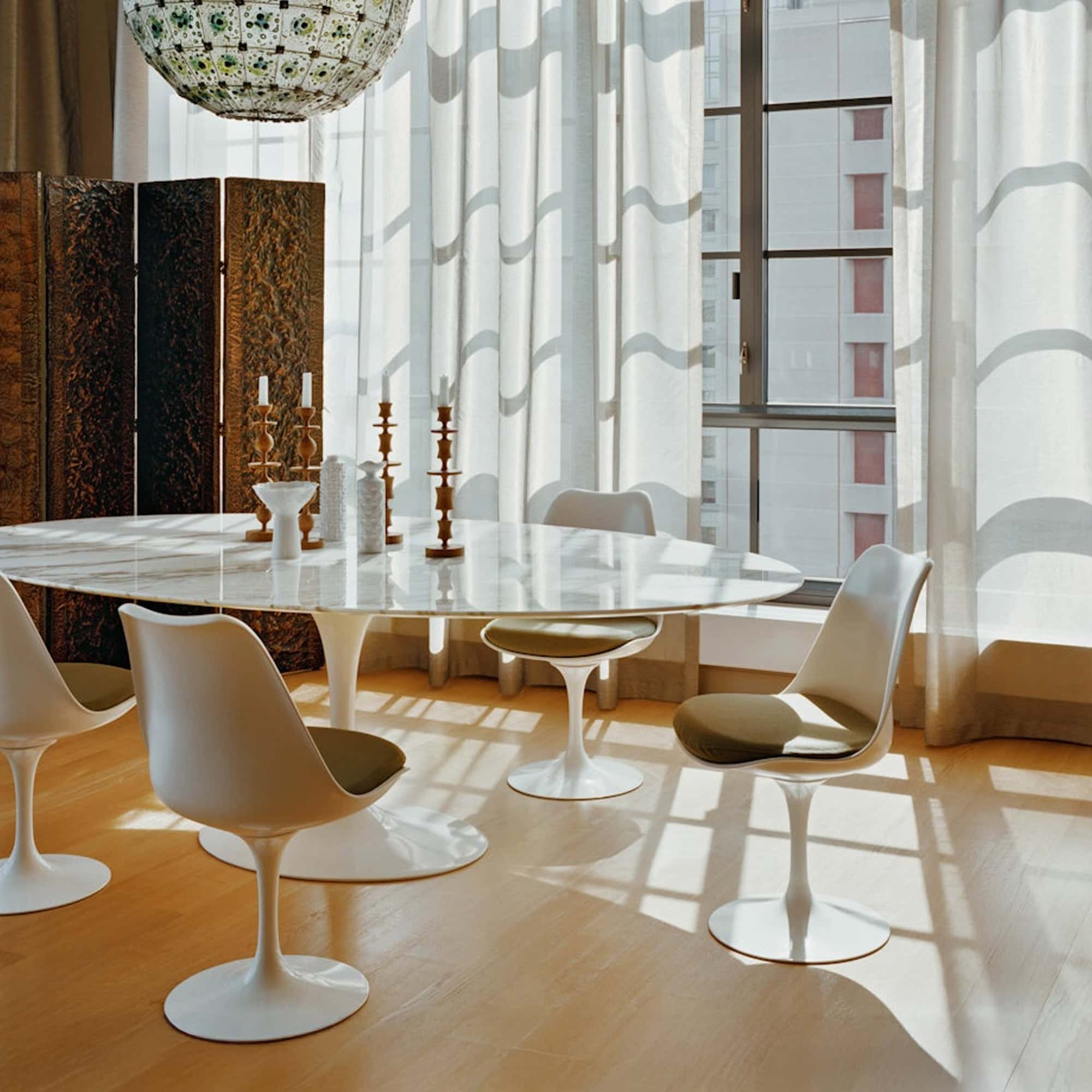 [vc_row][vc_column][vc_column_text css=""]Each Tulip Dining Chair combines refined design with functional comfort. The sturdy cast-aluminum base ensures stability while the molded fiberglass seat shell offers lasting durability. A subtle swivel mechanism allows for effortless entry and exit from the table, and the collection’s Greenguard Indoor Air Quality Certification guarantees low-VOC emissions, making it an eco-conscious choice. Available in both side and armchair versions, with options for an upholstered seat or fully upholstered design, the Tulip Chair invites you to tailor its style and comfort to your home.[/vc_column_text][/vc_column][/vc_row]