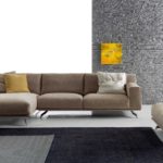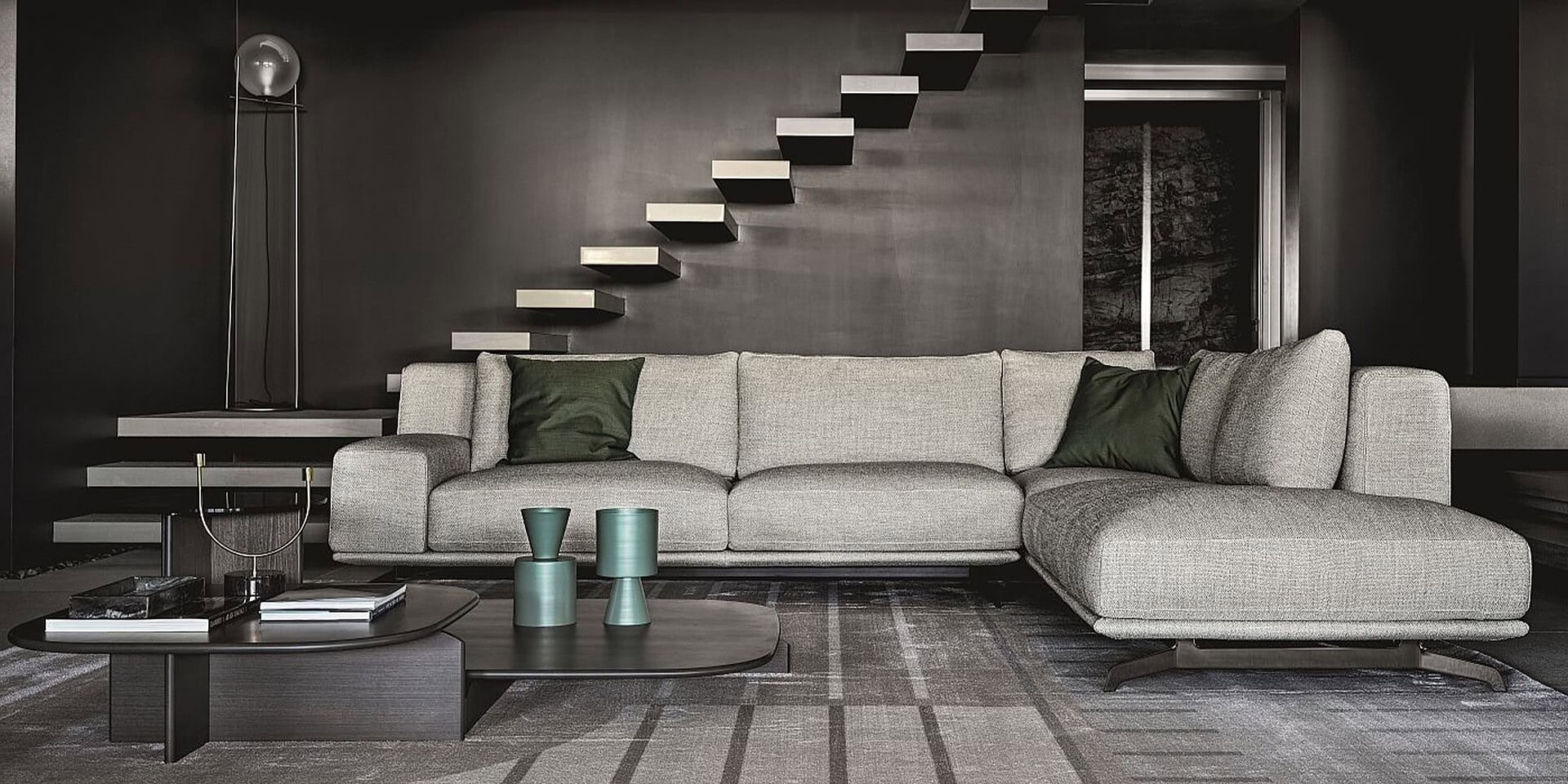 The Dalton Sofa and Sectional is available in two versions upholstered entirely in fabric, with removable leather or eco-leather cushion options.