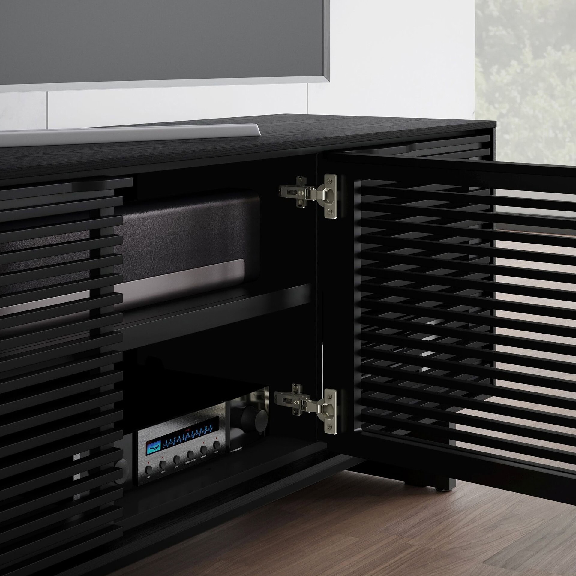 The Align 7479 Media Storage Console is built from the inside out to seamlessly integrate technology into the way that we live. Innovative performance features abound, simplifying your initial setup, maximizing your ongoing enjoyment, and protecting your investment over the life of your system. This fully functional and low-profile design combines remote and audio-friendly louvered doors with the base style of your choice, either media or console.