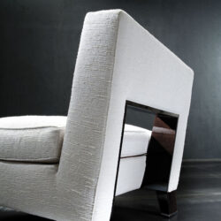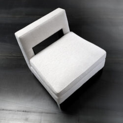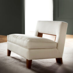 This comfortable chair features a generous seat and soft yet firm padding on its solid beechwood frame. It is perfect for a contemporary formal style, with a sophisticated back detail where the geometric shape of a rectangular opening is framed with decorative trim in solid beechwood.