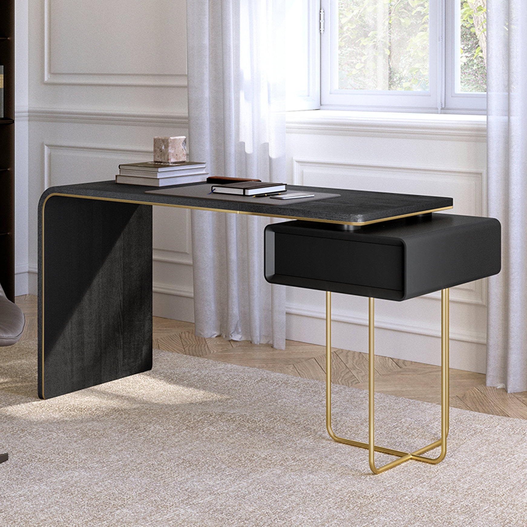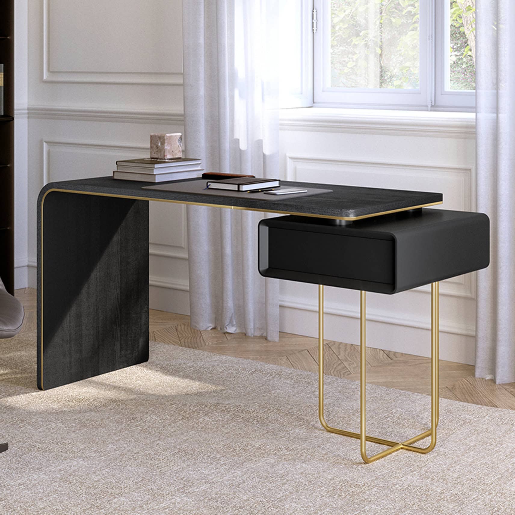 Similar in construction to the Auri Vanity, this piece is an elegant desk with a drawer attached to a painted metal base. The top and structure of the table are made of veneered wood with a lacquered profile.