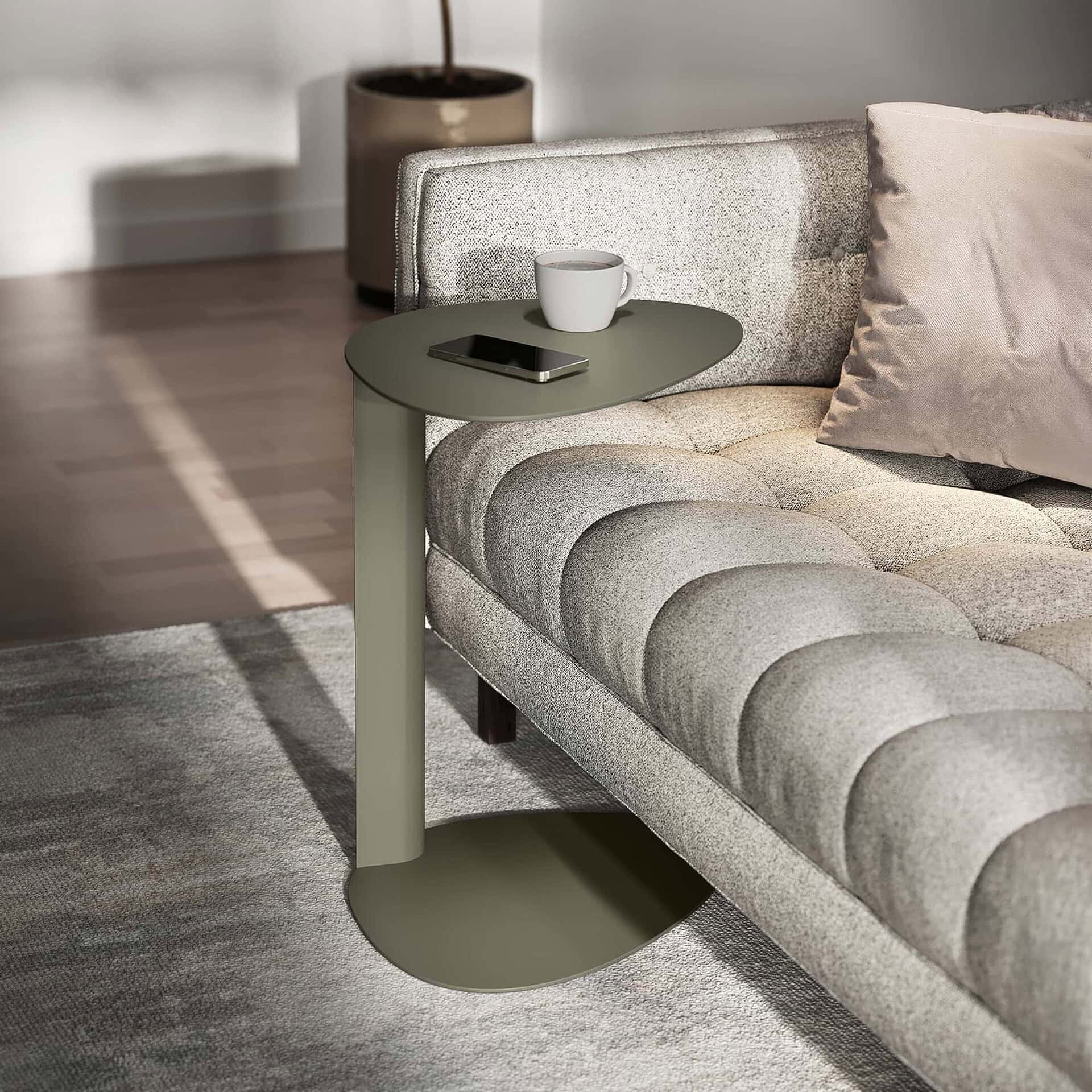 A silver laptop and a white coffee mug on a dark wood C-table next to a brown leather sofa with a faux fur pillow.