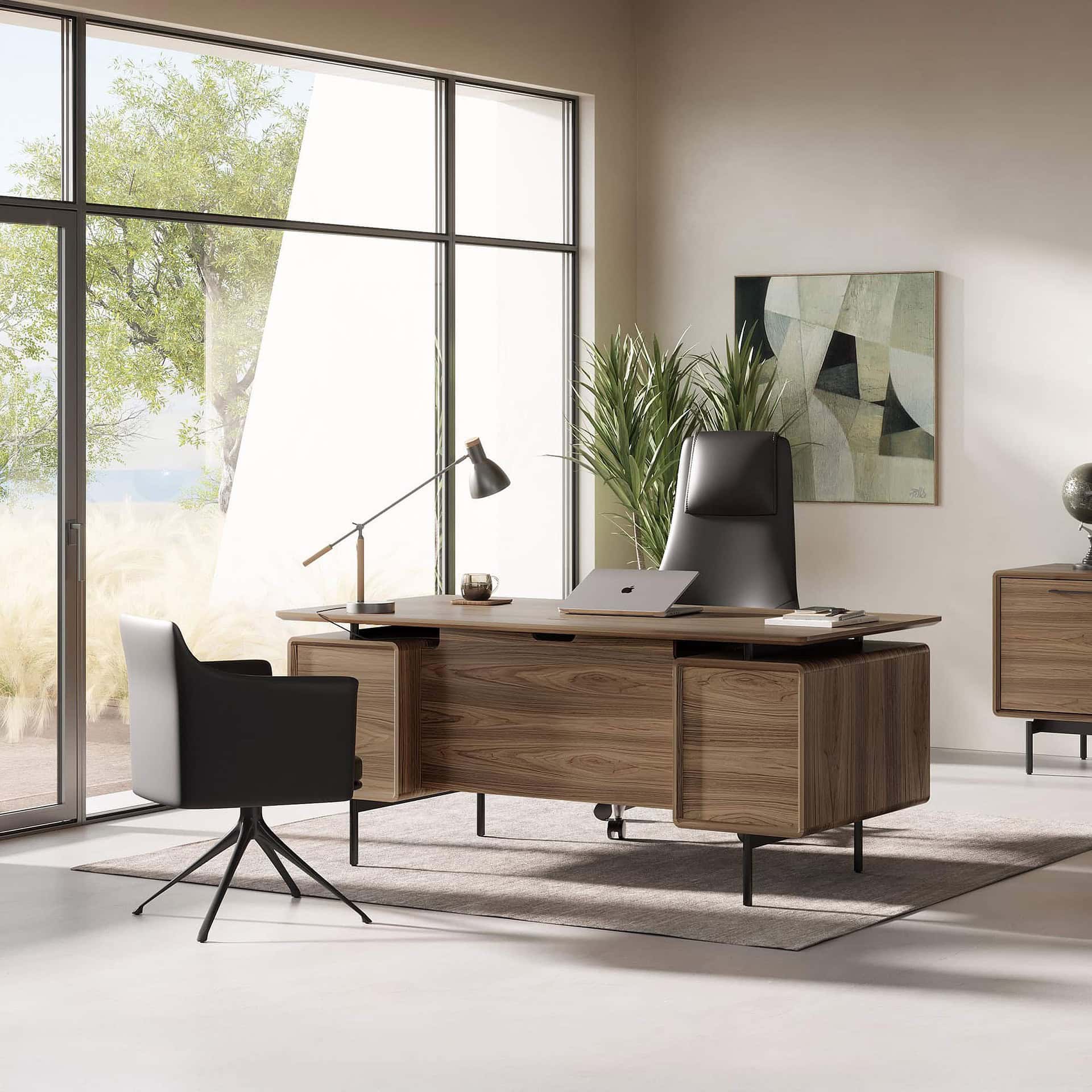 Swan Desk in natural walnut with drawer cabinet, styled in a modern office interior.