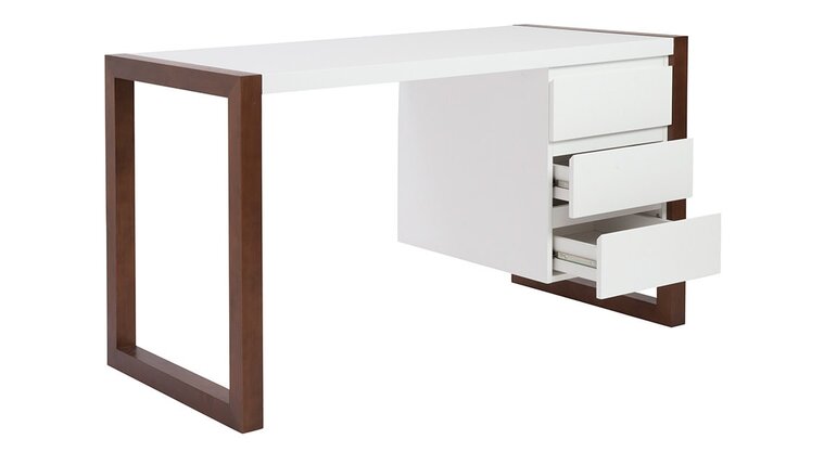 Featuring three, same sized pull out drawers that are attached to the right side of the table, the Manon Desk understands the importance of organization when working from home. The wide desktop is lacquered and the frame is solid ash wood stained in dark walnut.