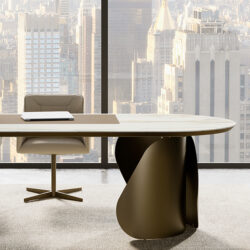 A refined desk with a drawer, with an elegant design thanks to the metal base with soft and rounded shapes that tighten in an enveloping embrace that supports one side of the ceramic top and the lacquered structure. An elegant emery leather pad is available upon request.