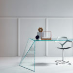 Designed by Isao Hosoe the Tonelli Penrose glass desk is original and asymmetrical in shape with a blunt oblique wielding on one its right side, making it a great fit either in the centre of a room or against a wall. The piece is made from fifteen millimetre thick sheets of bonded glass.