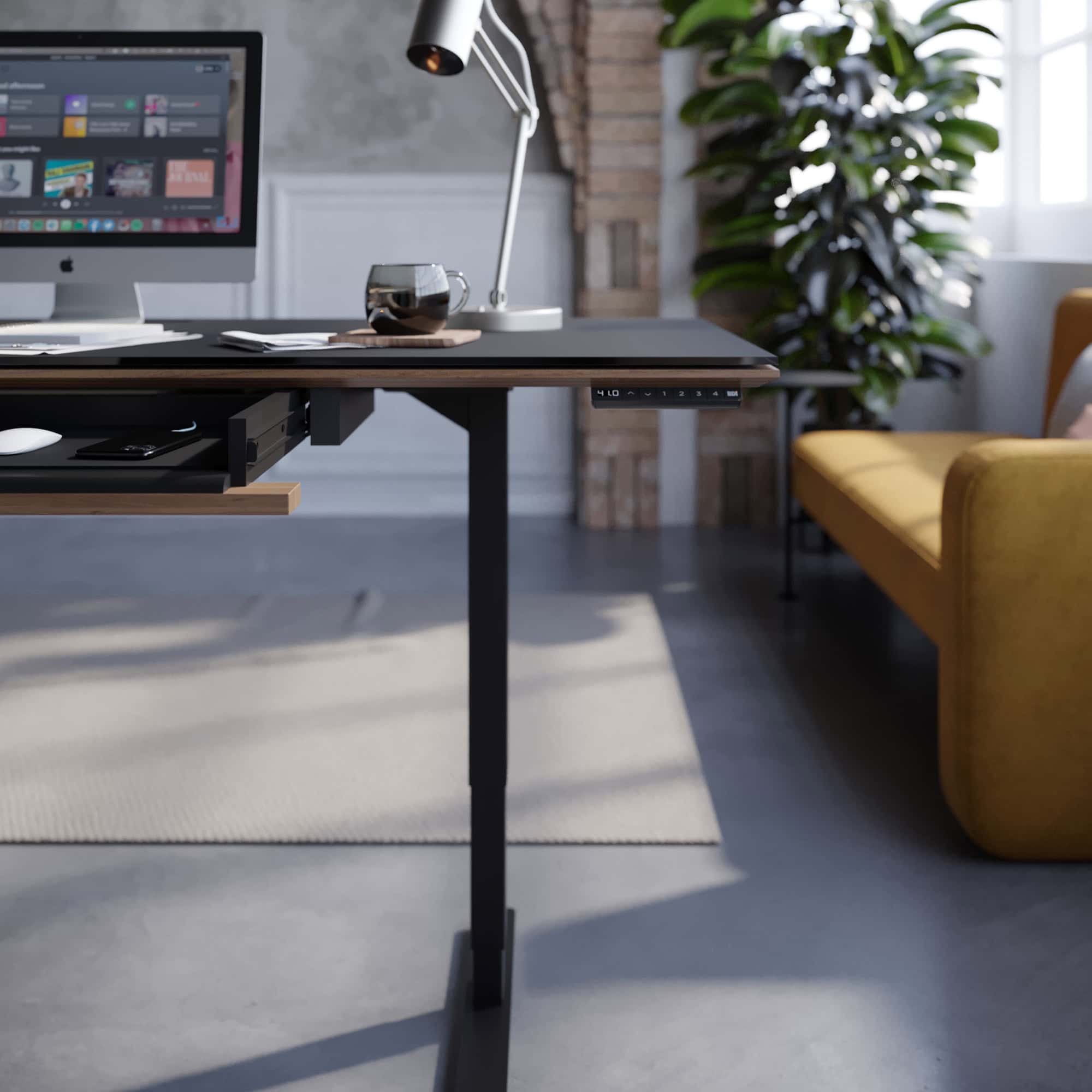 Designed with executive-grade materials and craftsmanship, the Sequel 6152 features a satiny-etched tempered glass top that resists scratches, fingerprints, and everyday wear. The sturdy yet refined appearance is complemented by a hardwood frame and steel legs for impeccable stability at any elevation—from 24.75″ to an elevated 49.75″. These refined details and thoughtful engineering make it an ideal centerpiece for luxurious, health-conscious workspaces.