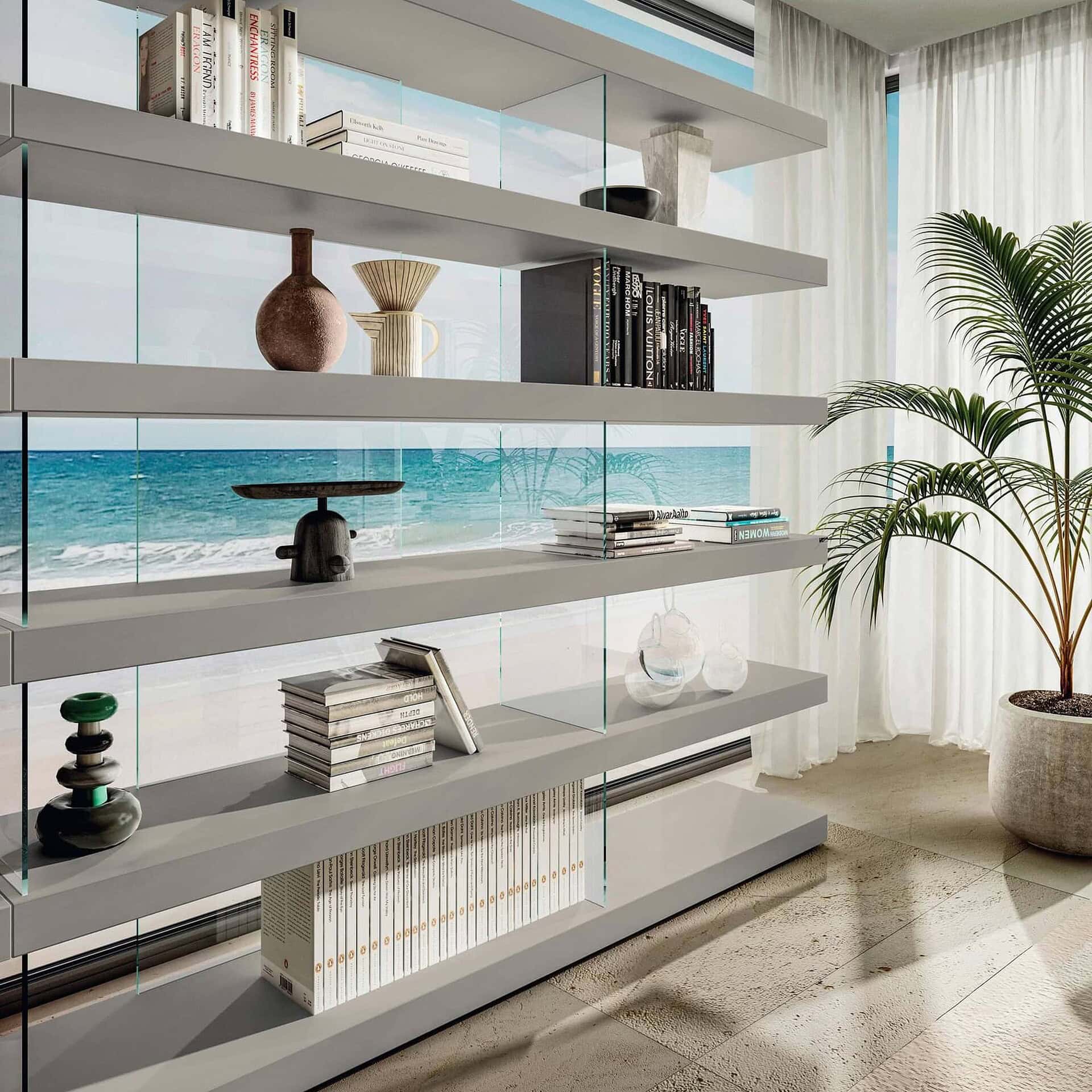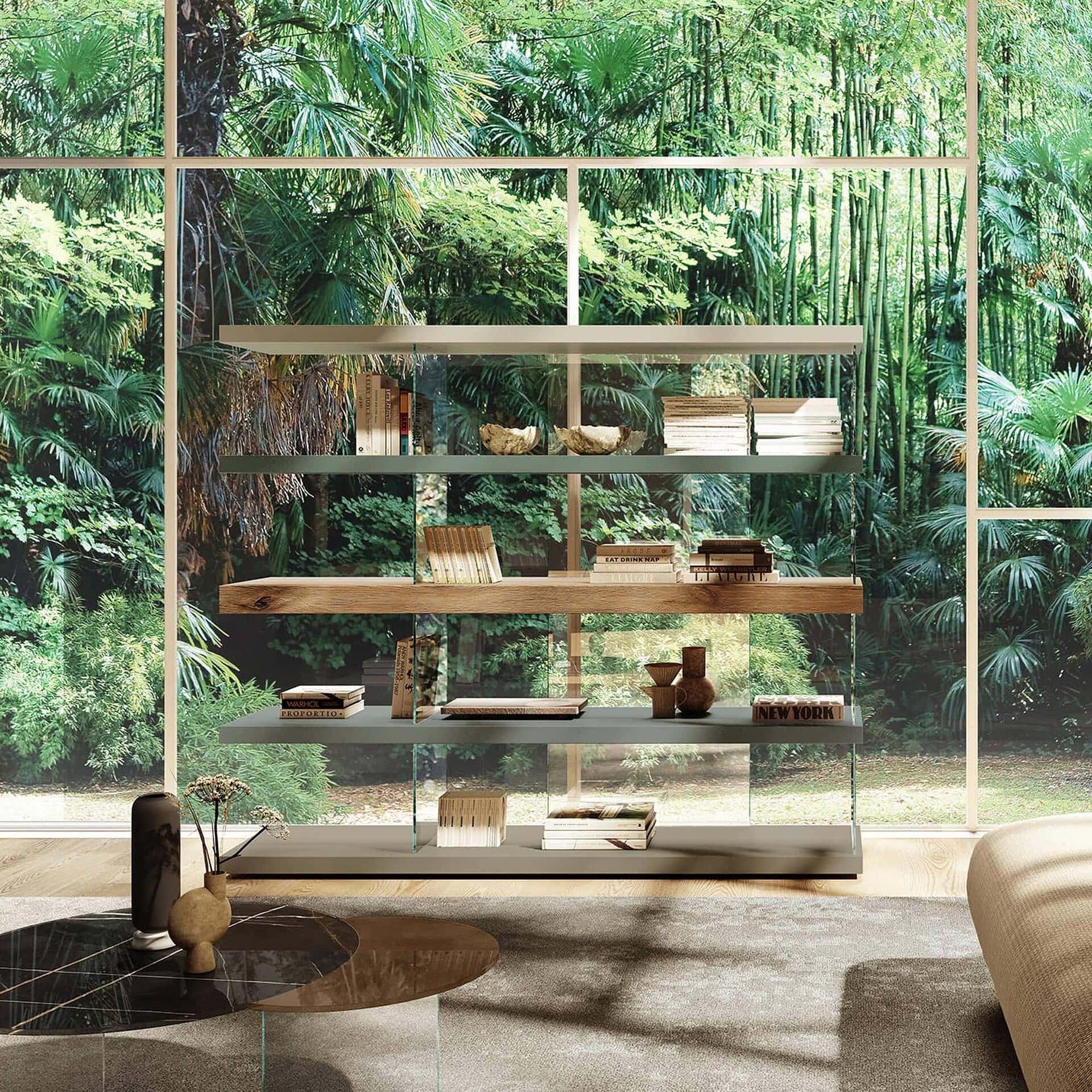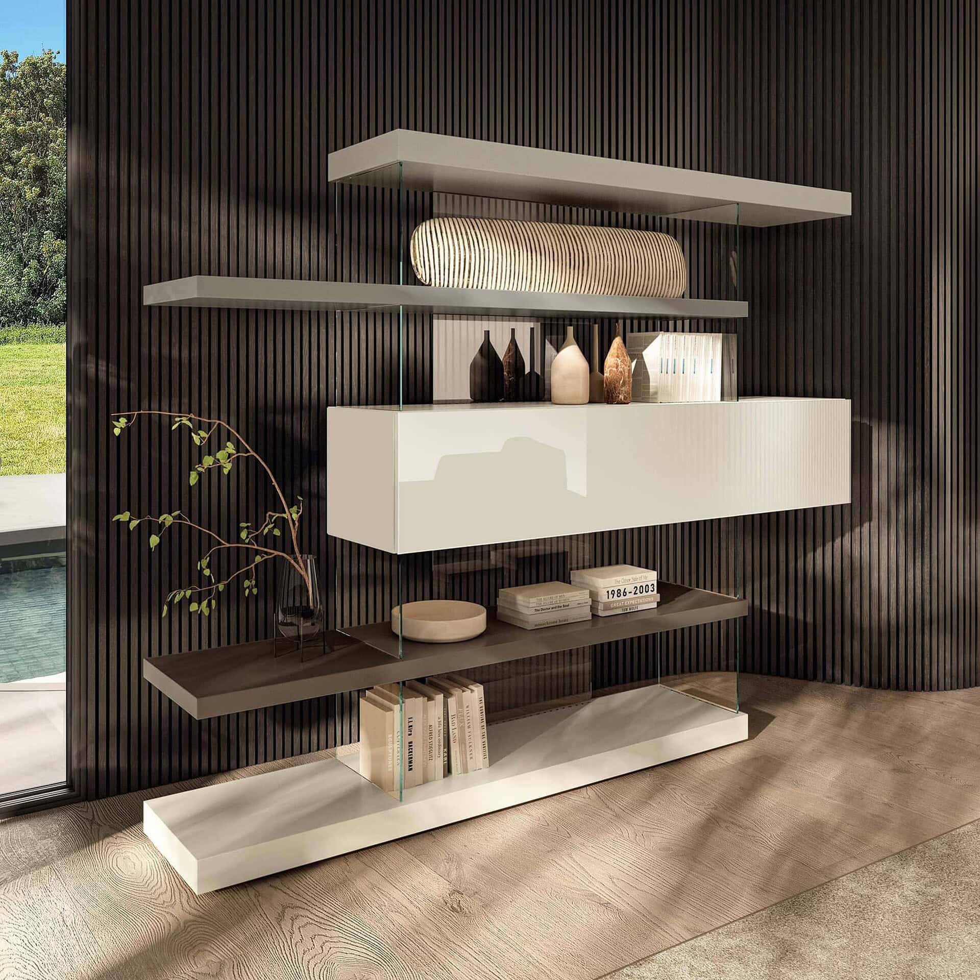 Shelves and storage elements available in lacquered wood, Wildwood, XGlass, and lacquered glass