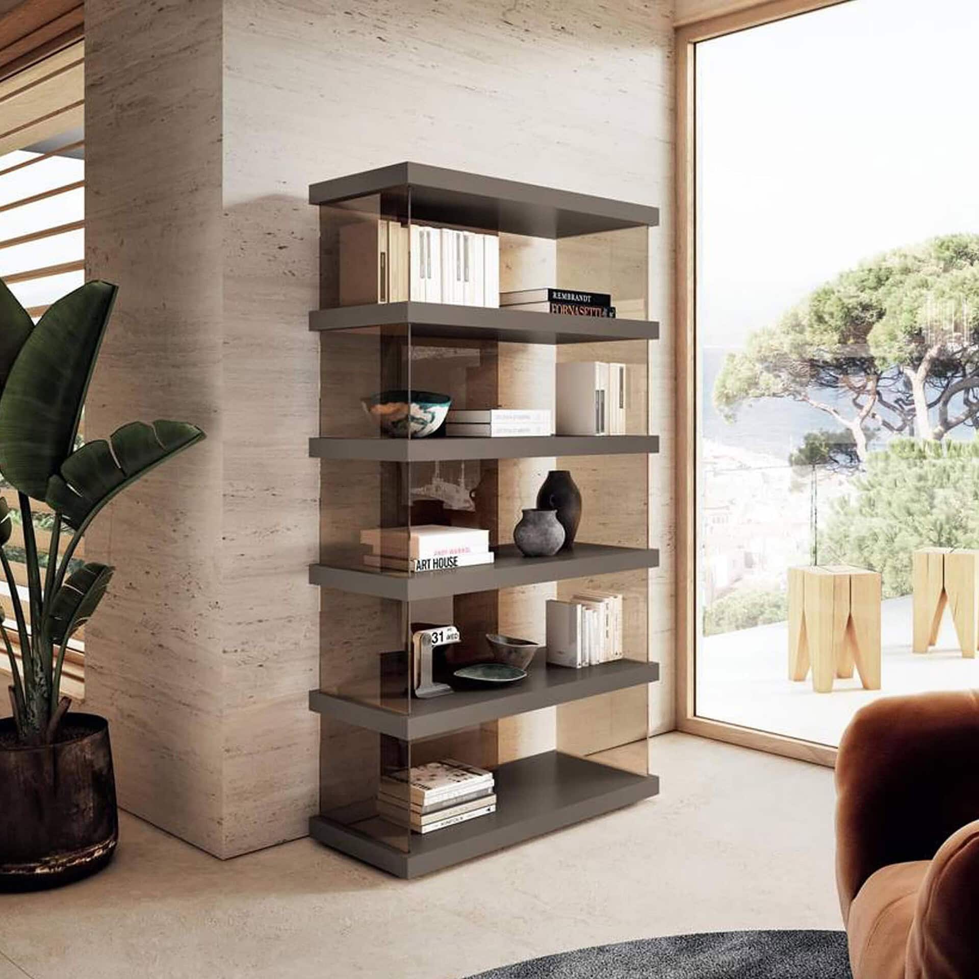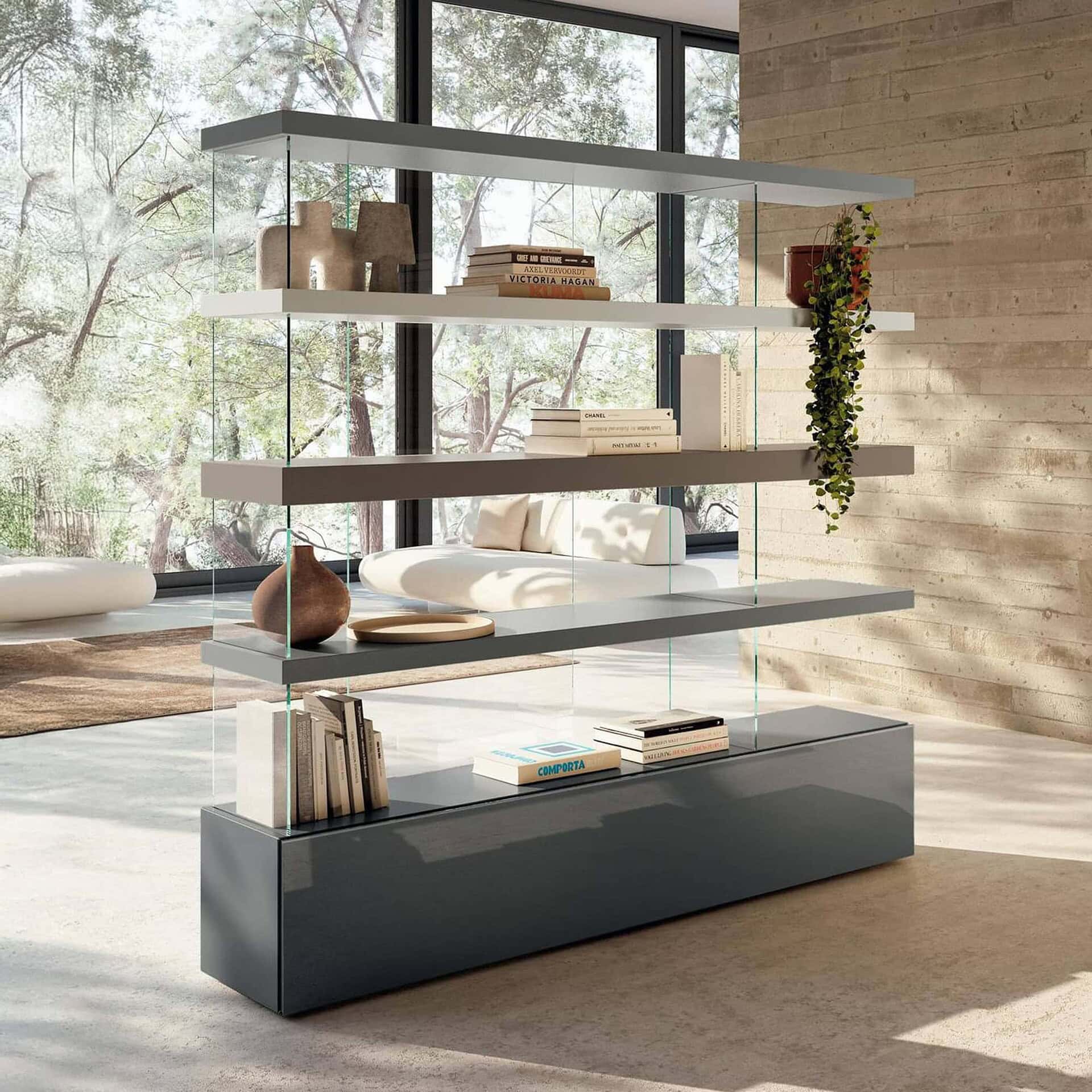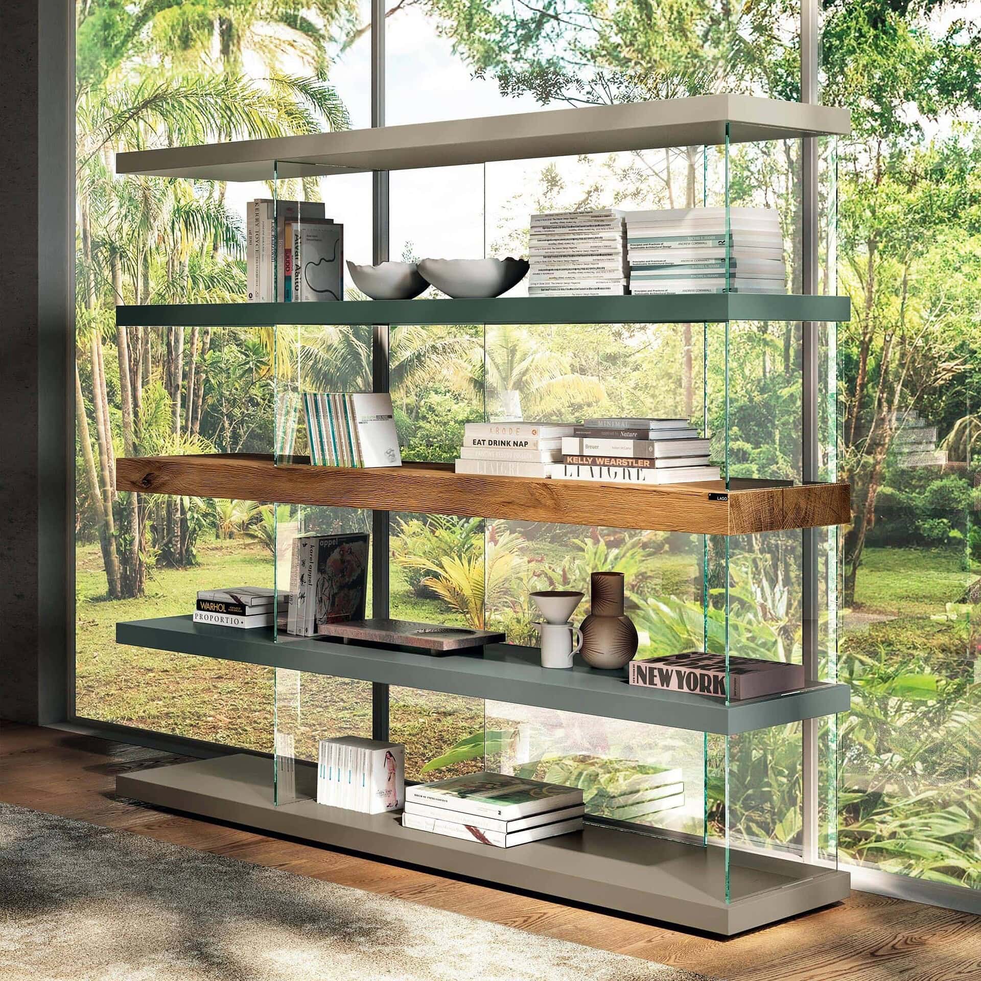 Shelves and storage elements available in lacquered wood, Wildwood, XGlass, and lacquered glass