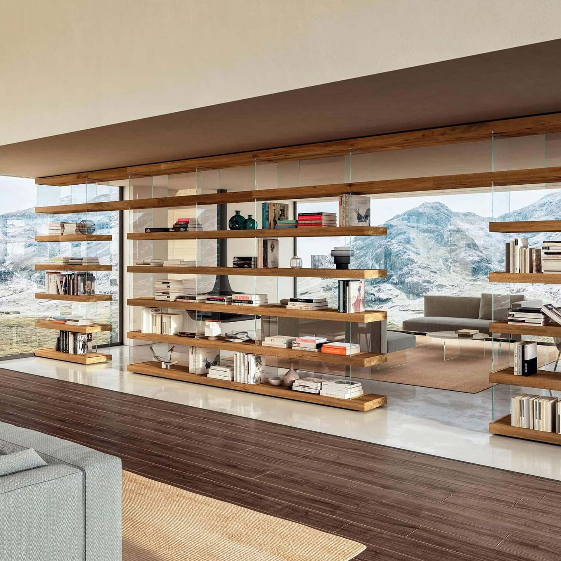 Pianca Spazioteca Modular Wall Unit with wood finish and open shelving in a modern living room