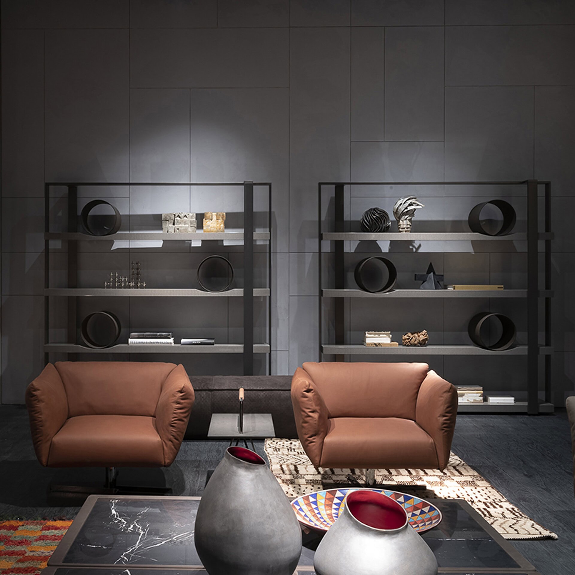 Stylish modern living room featuring a large shelving unit with decorative items and a cozy seating area.
