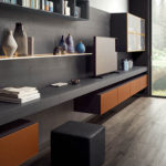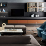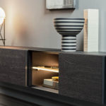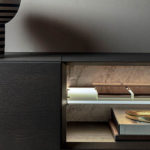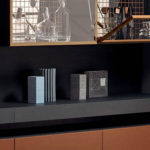 Sophisticated geometry meets elegant design. Rediscovering everyday beauty begins with elegance. People's modular system is the ideal solution for those who love to customize their home interiors in a truly unique way. With its mitre-folding carcass and lack of handles, this piece has a flowing, subtle design, with contrasting luxurious accents, such as its spacer elements, backlit glass shelves, and new hard leather fronts and back panels in materico marble.