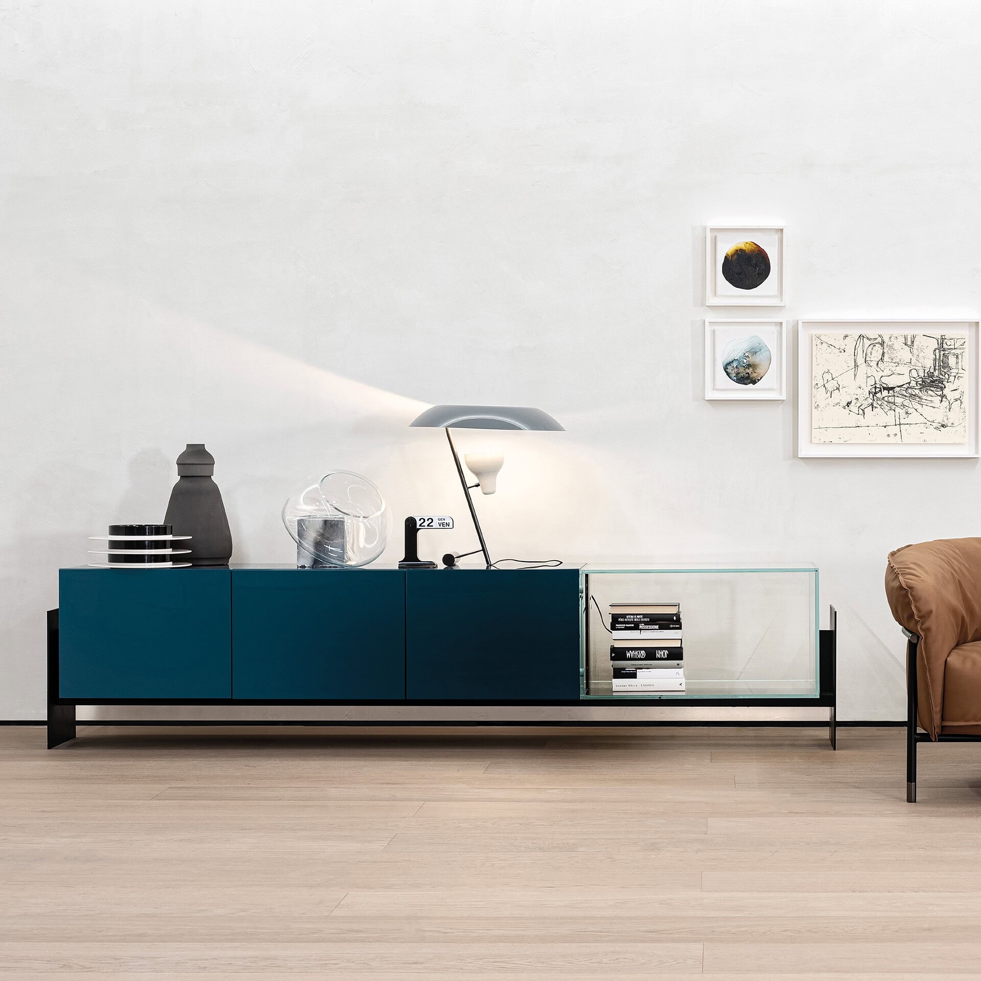 There is a little jewel of functionality hidden behind the glossy lacquered doors. Fly is a big container that serves as a shelf, a display case, and a useful container all at once. It is possible to choose between the left or right version of the glass compartment of this modular cupboard so everyone can choose according to their preference.