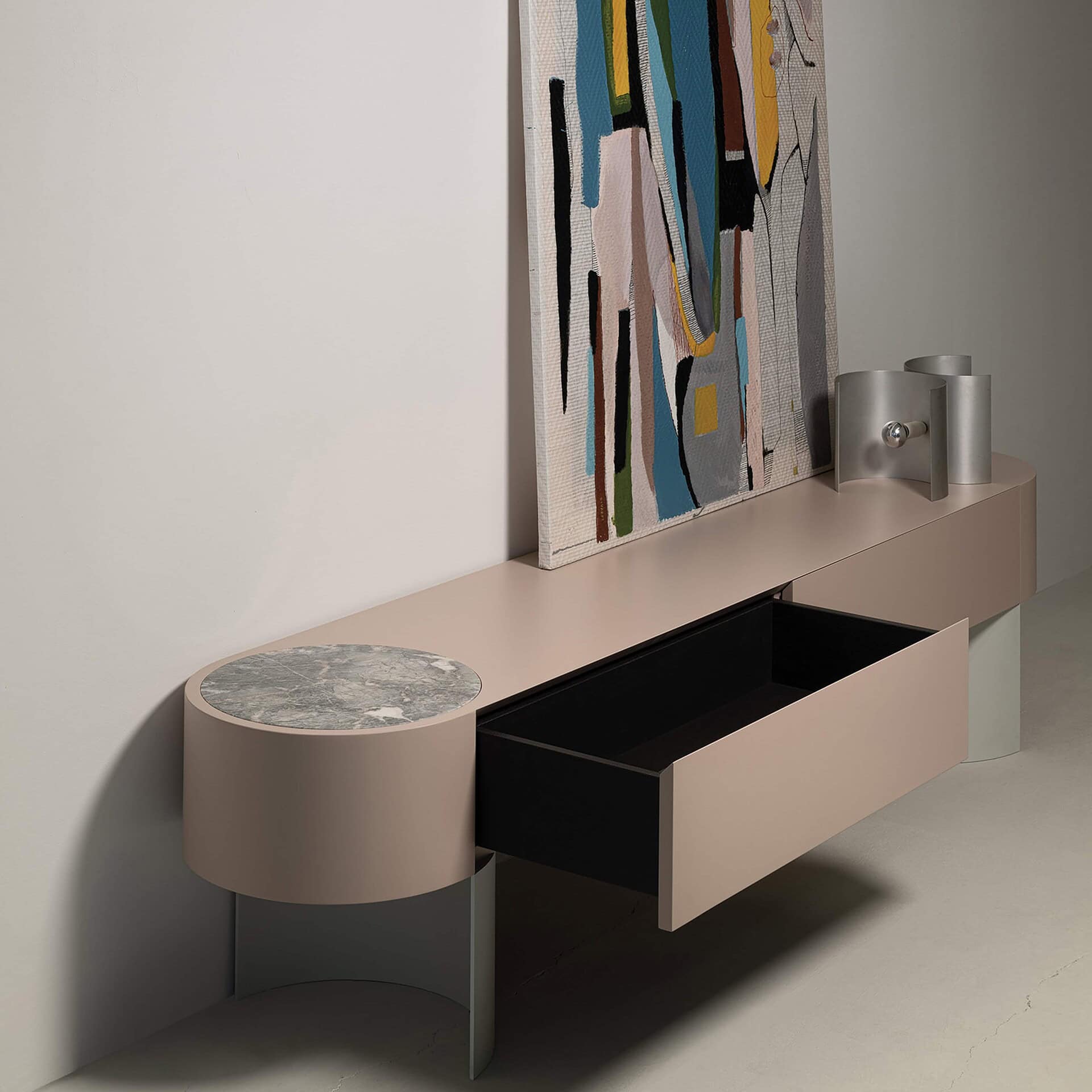 A large supporting structure gives the Lip Sideboard a sense of hospitality, a welcome addition to any home. It comes with a lacquered base, and both the inner and outer design are made up of a combination of lines and circles. In addition to the round arches that support the entire structure, the square drawers contrast with the circular marble top, making the entire structure stand out in any room.