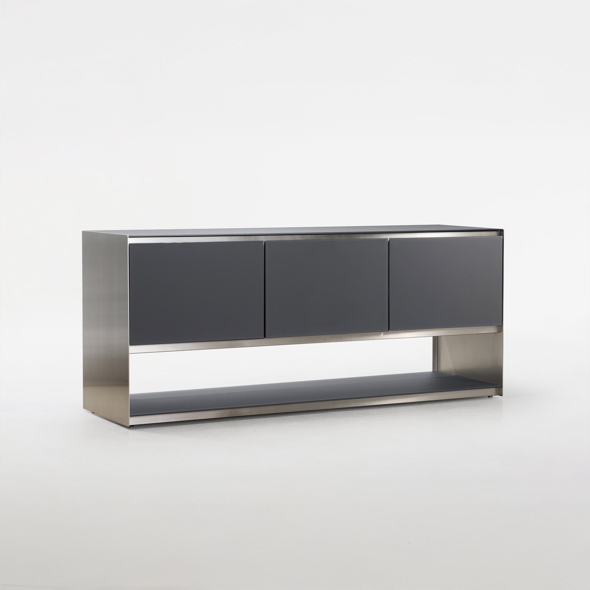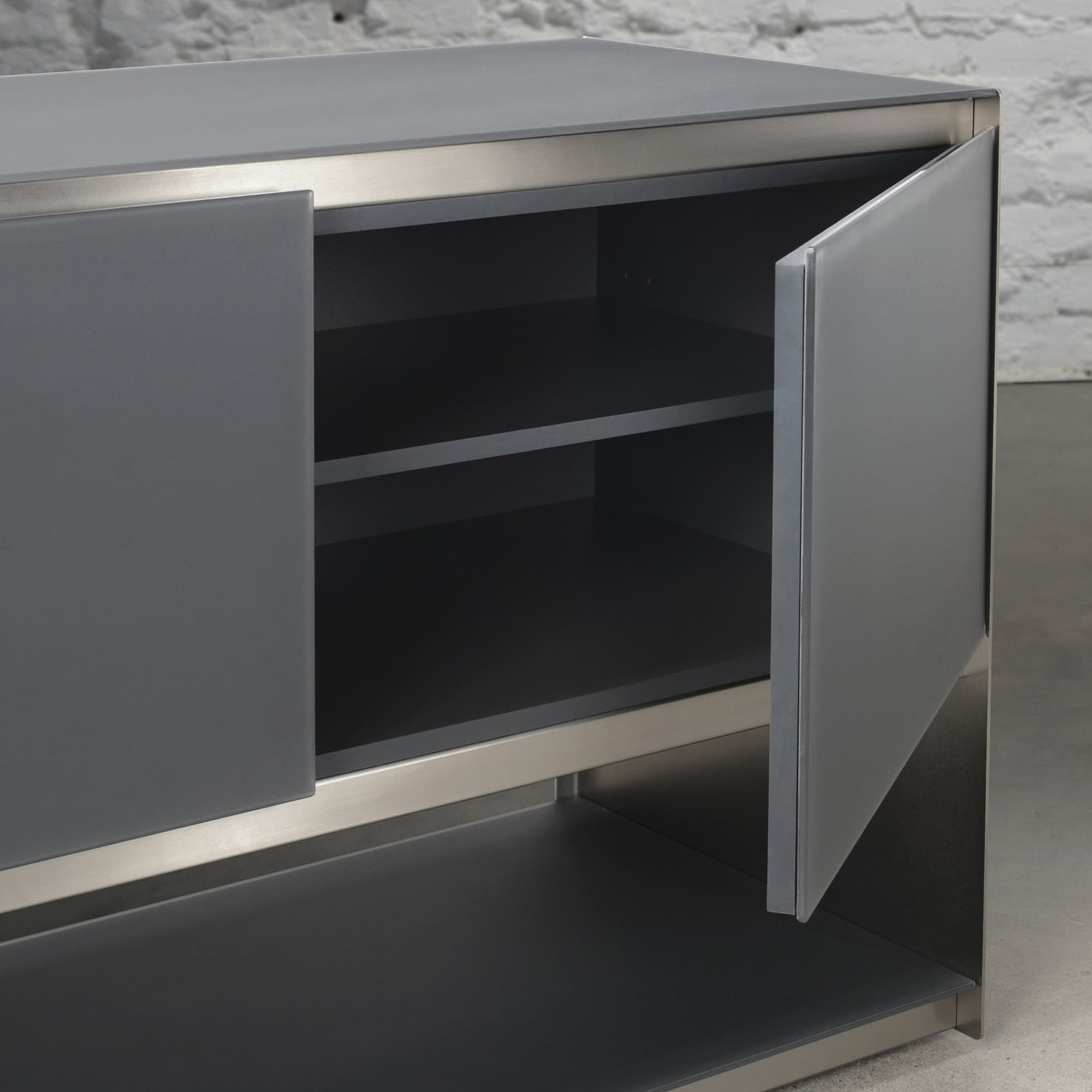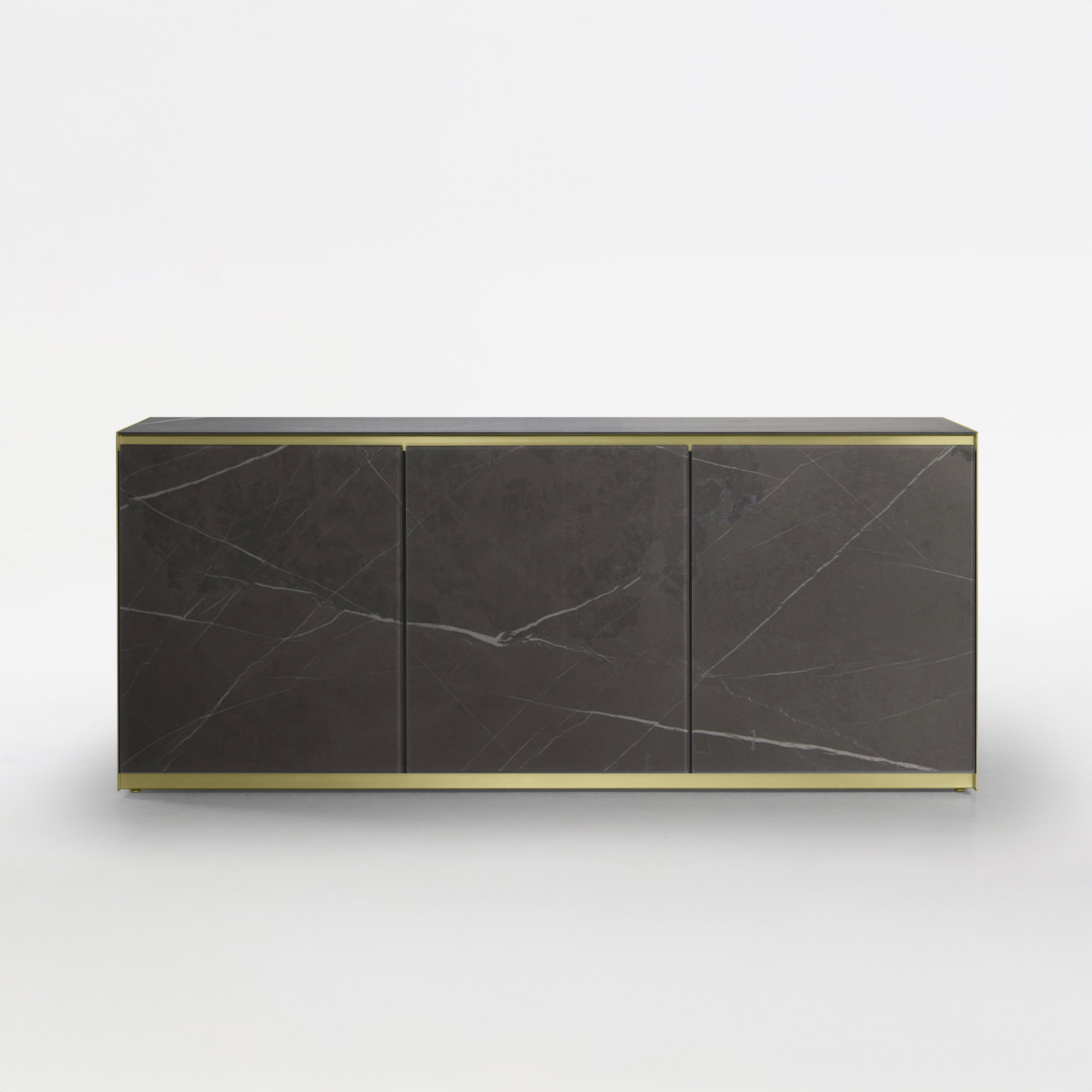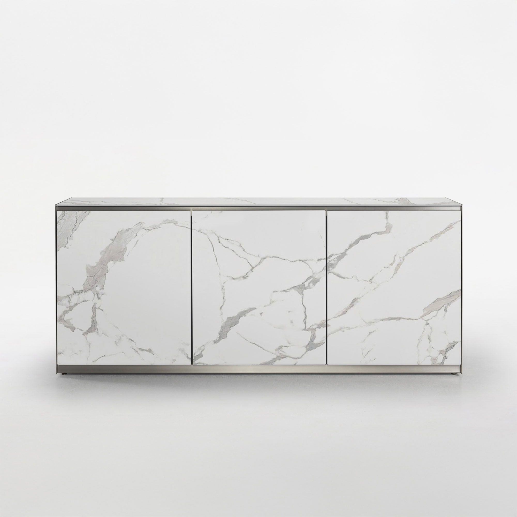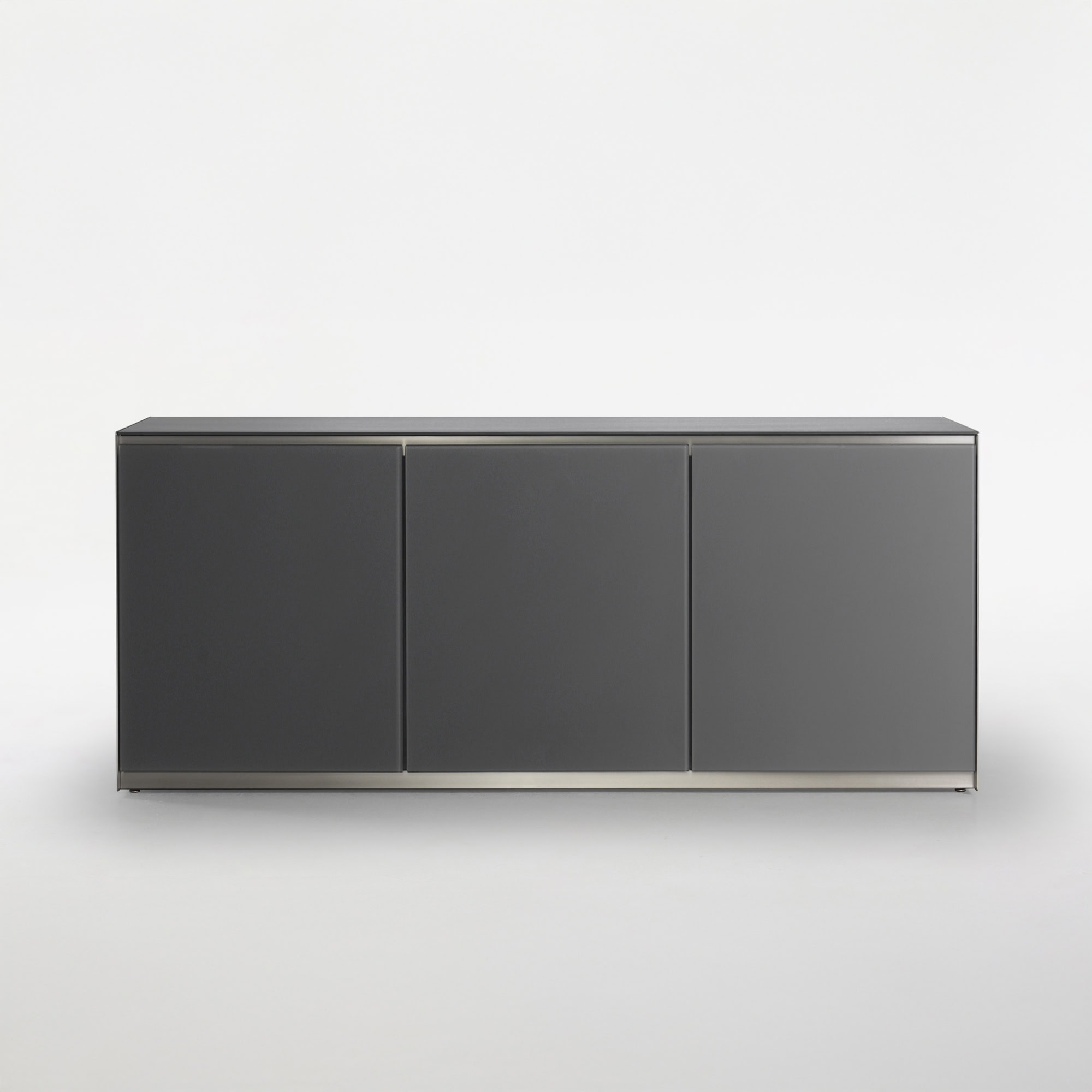 Minimalism meets precision in the Absolute Buffet — a modern storage solution defined by clean lines, exceptional materials, and architectural simplicity. Its fully welded steel frame and soft-closing doors provide both durability and elegance, while the etched tempered glass or optional porcelain finishes add a sophisticated textural contrast. The buffet is offered in two configurations: standard doors with a visible lower panel, or full-length doors for a seamless façade. Its versatile design allows it to anchor a dining room, hallway, or living space with subtle refinement.