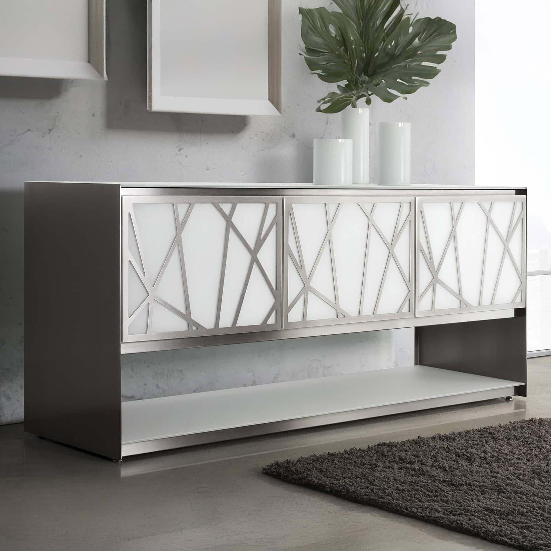 The Apero Buffet is a luxurious display and storage piece from Canadian manufacturer Trica, designed to appeal as a both functional storage piece with plenty of space and an complement to your home's aesthetic. The piece is built with a brushed steel accent available in a variety of powder coated finishes, combined with wood veneer (on particle board) in a range of water-based UV-cured finishes. The buffet also features a starphire tempered glass with a flat polishes edge, as well as anti-glare and anti-fingerprint etched tempered glass. The doors are built with a soft closing mechanism, and adjustable cam shelves line the insides of the piece. Warranted to meet or exceed industry standards.