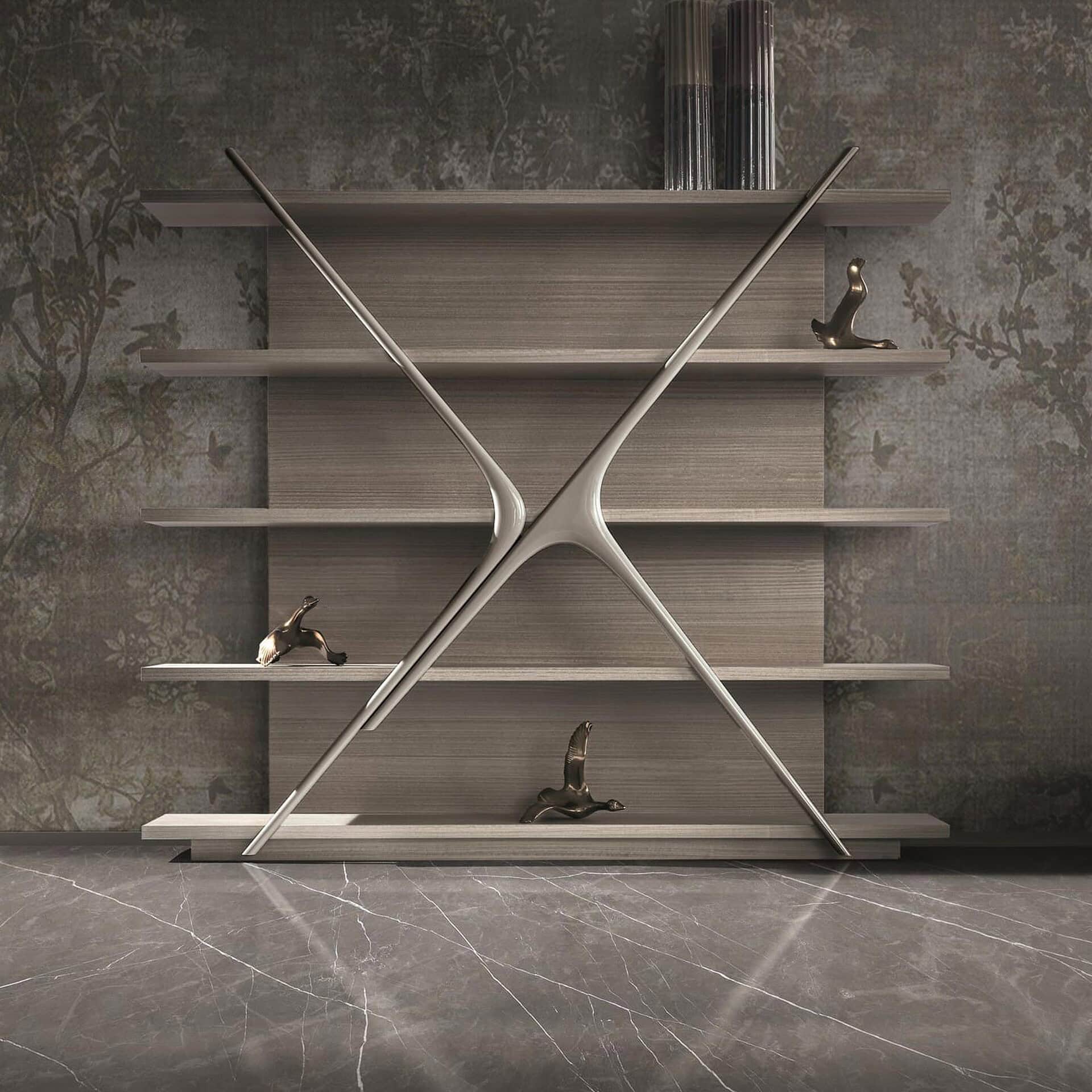 Called Eden, the piece is a beautiful bookcase with shelves and back panel available in all Costantini lacquer finishes. The modern piece has been studied in detail, as highlighted by the characteristic boomerang element made of solid beech available in a wide range of finishes. Natural tones and shades of grey, anthracite black and even a surprising dash of green have been combined to create an elegant, light and welcoming atmosphere.