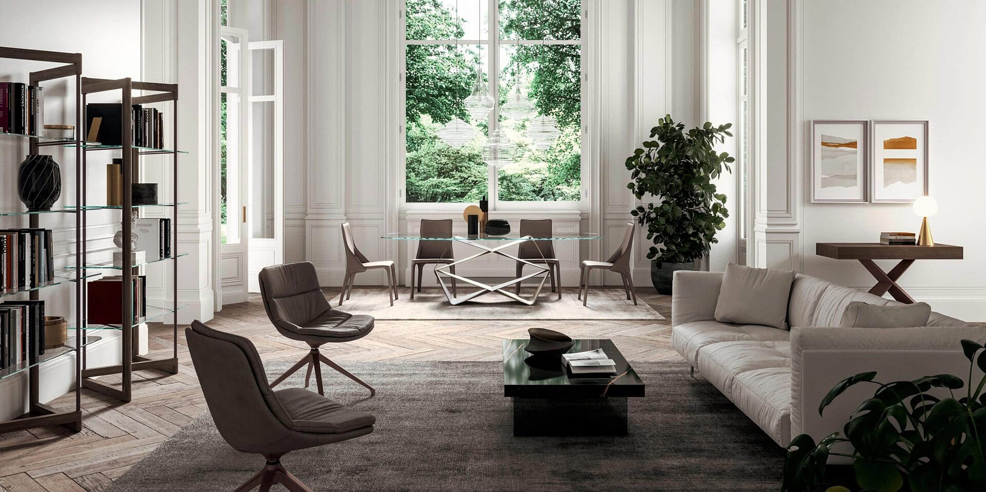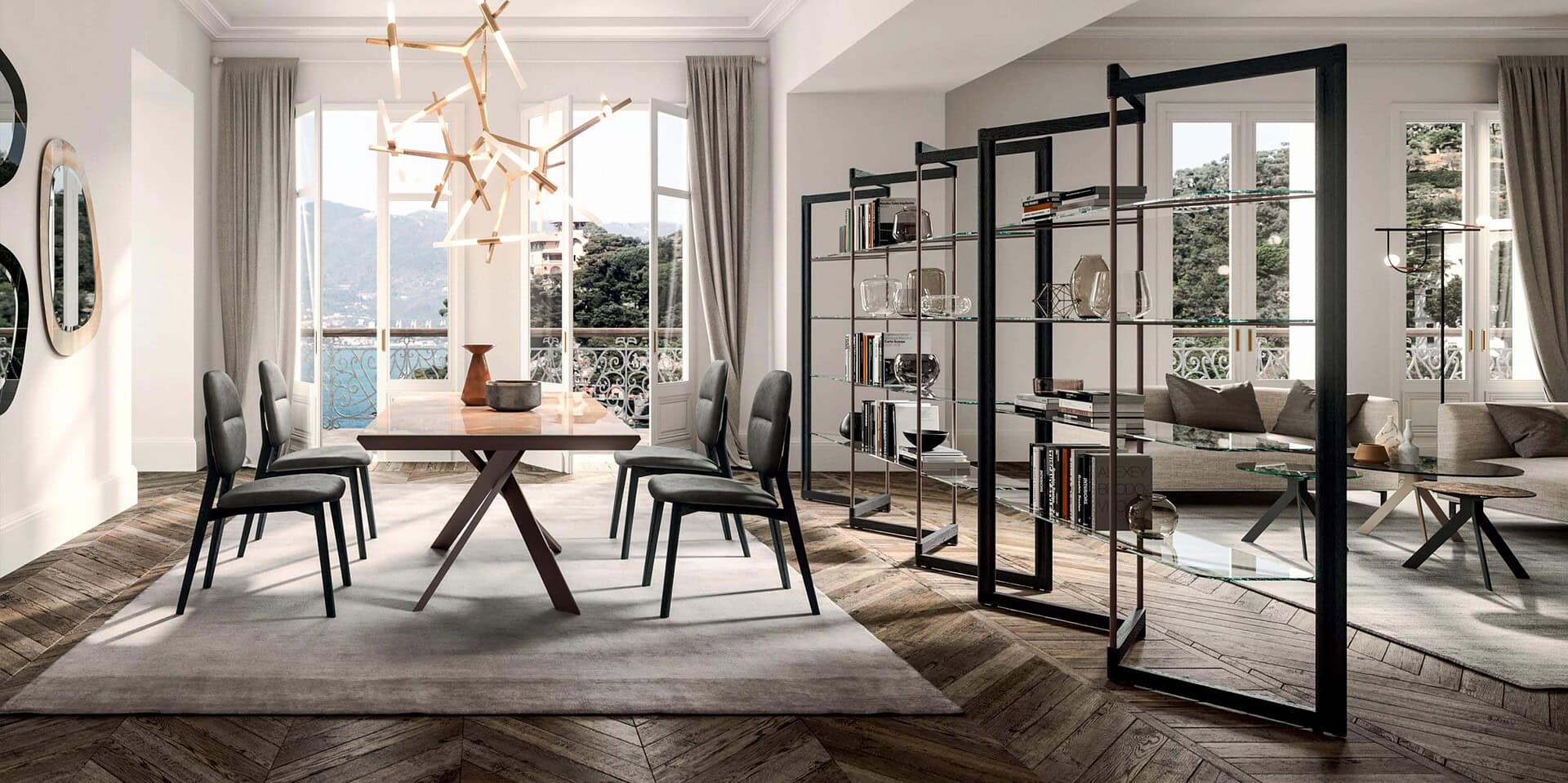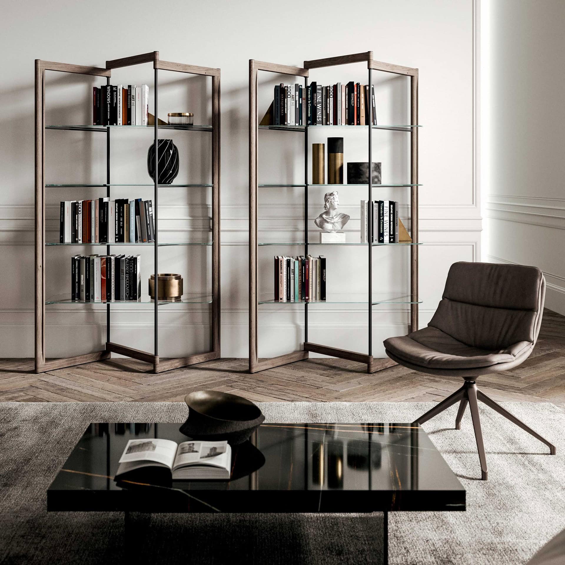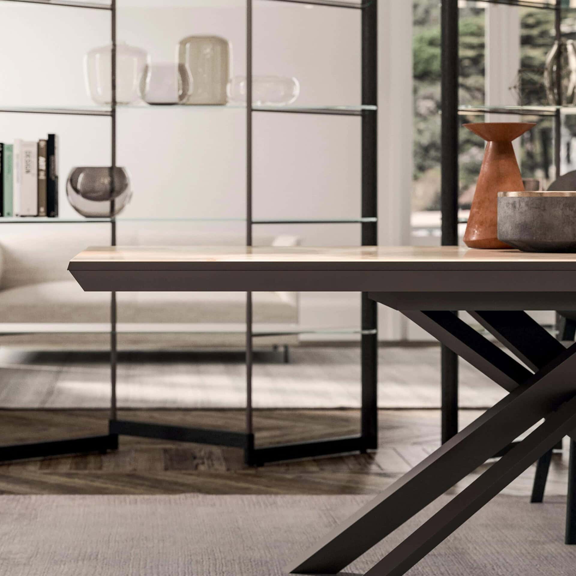 The Ozzio Italia Panto Shelf derives from the symbolism of the Pantograph, versatile, modern, and sophisticated.