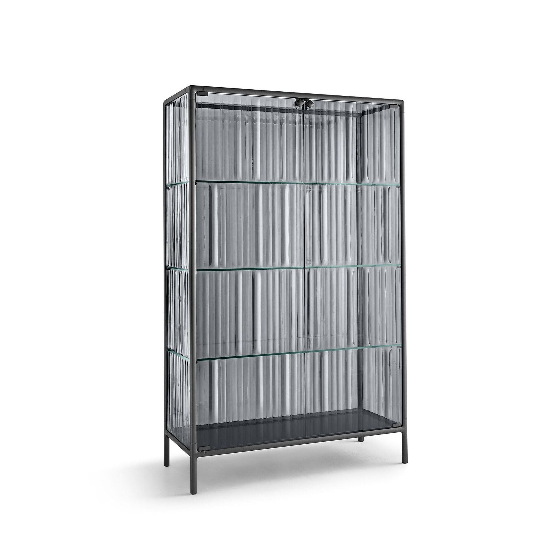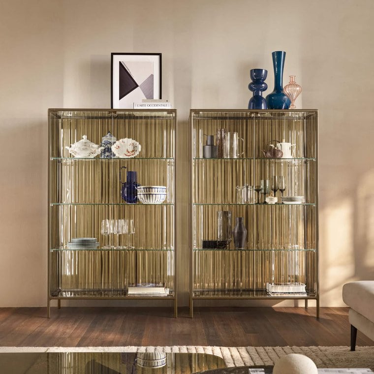 Available in a range of finishes, the Echo Line Showcase offers configurations in either fused or flat (non-fused) glass, with profile options in Metallic Champagne, Metallic Greige, or Vulcan Grey. Glass options include extralight, smoked, semi-reflective, and bronze hues to suit varying design palettes. Its versatility in size—from compact to full-length configurations—makes it ideal for living rooms, dining areas, or curated office spaces seeking a refined storage solution.