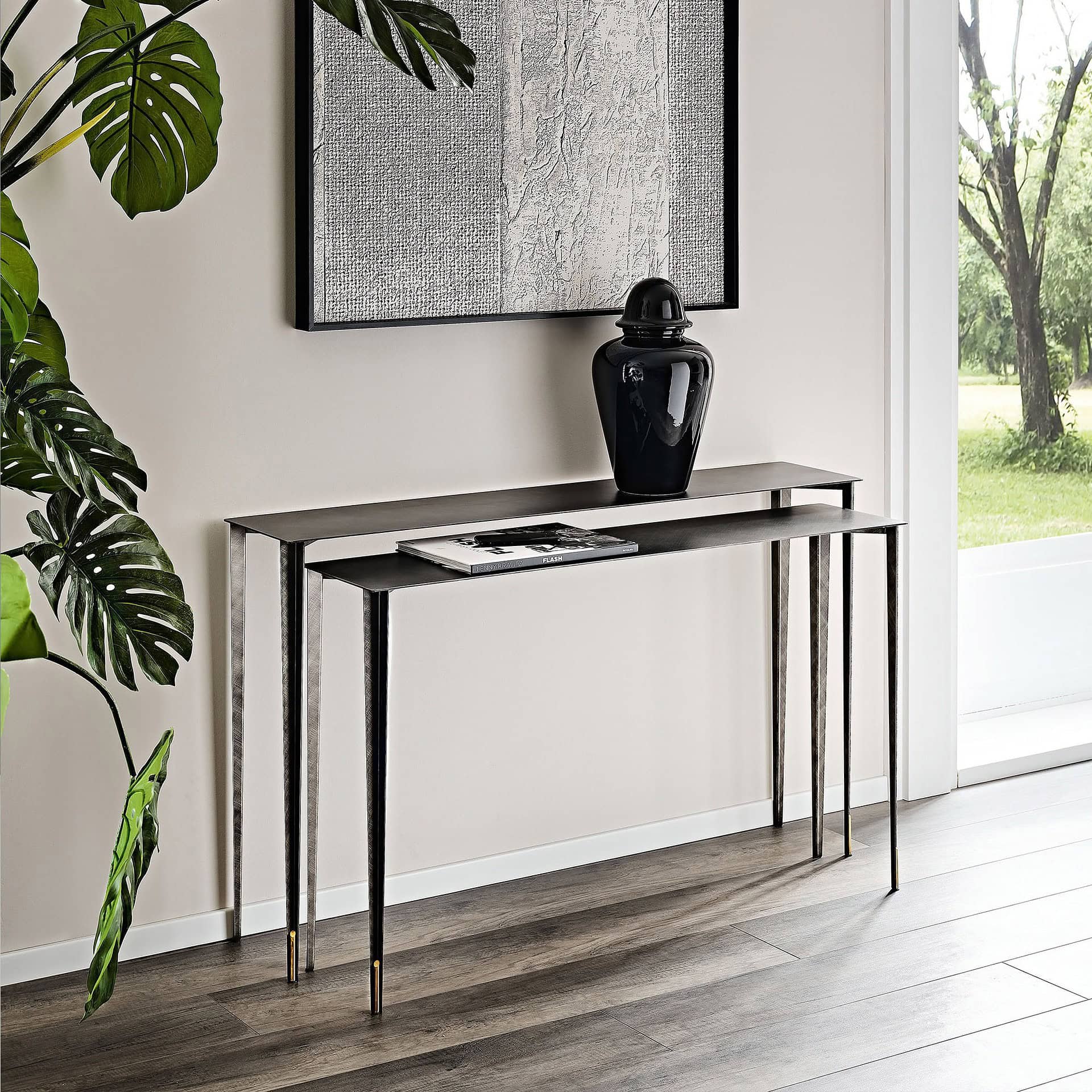 The Echo display cabinet by Fiam Italia adds a gorgeous, sculptural style to a modern home. The sophisticated design features a glass structure imprinted with a textured, diamond print for a bold, geometric touch. Around the eye-catching and multi-dimensional glass, there is a sturdy metal frame that creates a stylish juxtaposition that makes the cabinet stand out.
