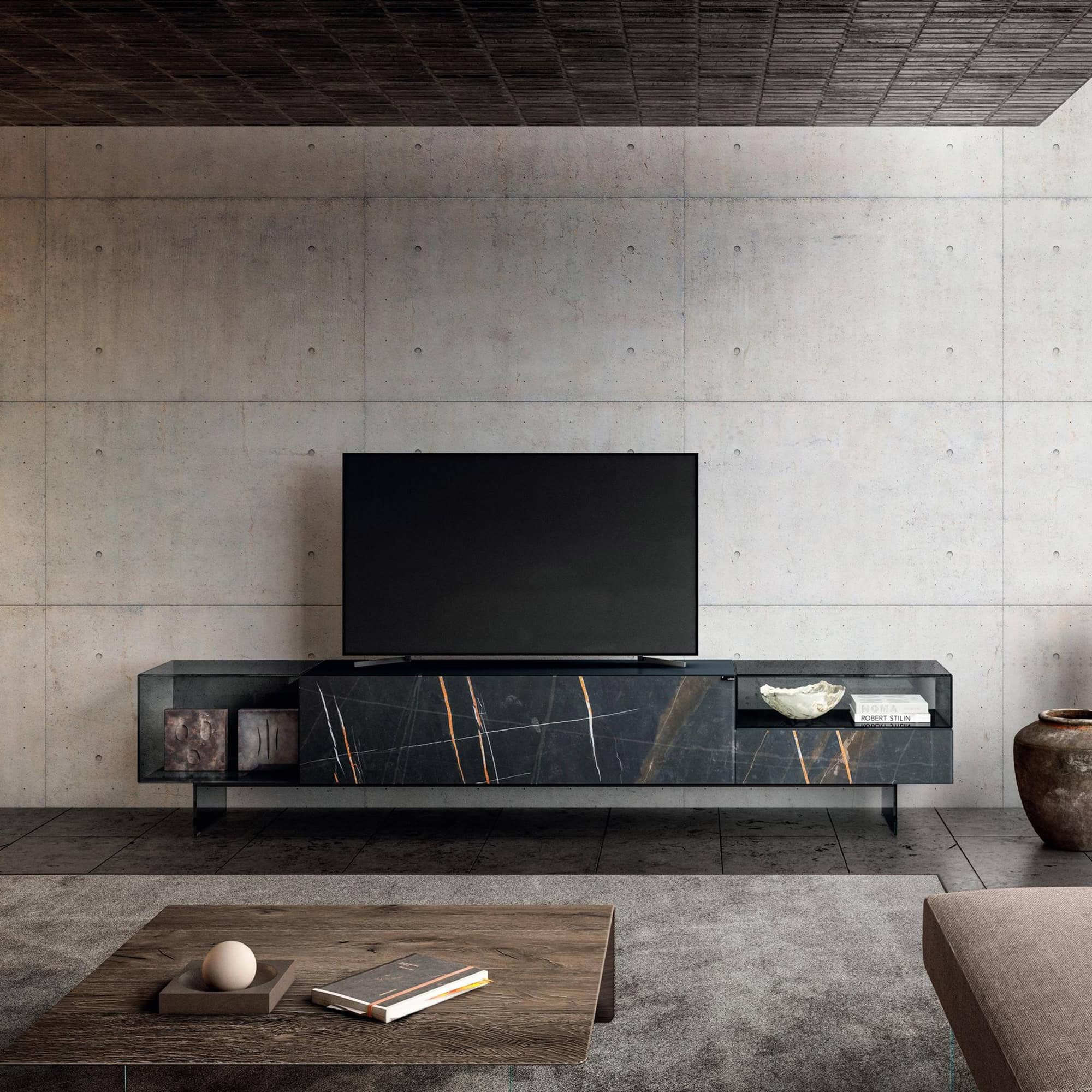 A bold fusion of transparency and texture, the 36e8 Glass TV Unit makes an unforgettable impression with its elegantly suspended glass storage elements and refined material contrasts. Featuring 45°-cut extra-clear, smoked grey, or smoked bronze tempered-glass units, this media console blends innovative Italian craftsmanship with modern sophistication. Whether used to anchor a minimalist setup or to highlight more expressive decor, the see-through compartments add a sense of lightness while keeping devices and essentials organized and visible.
