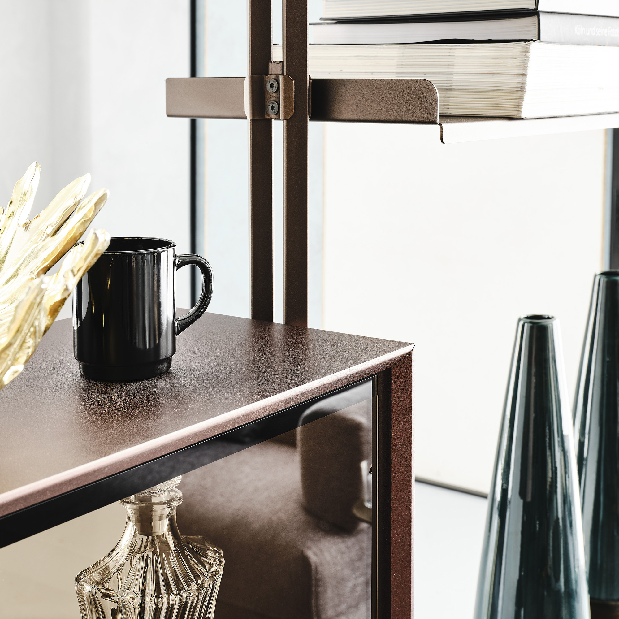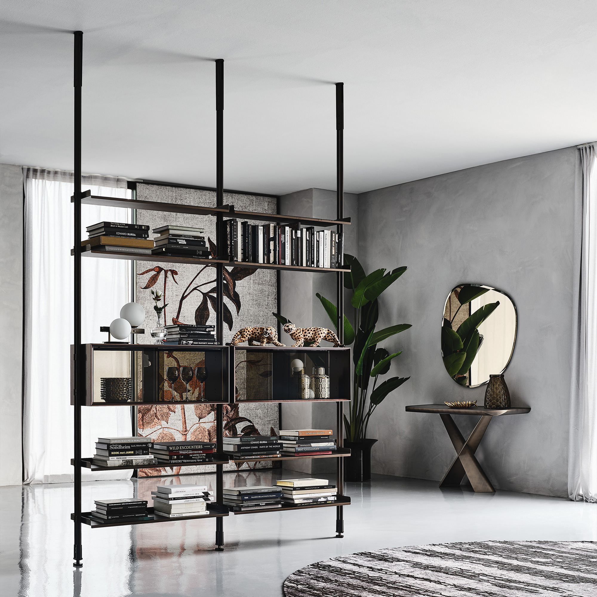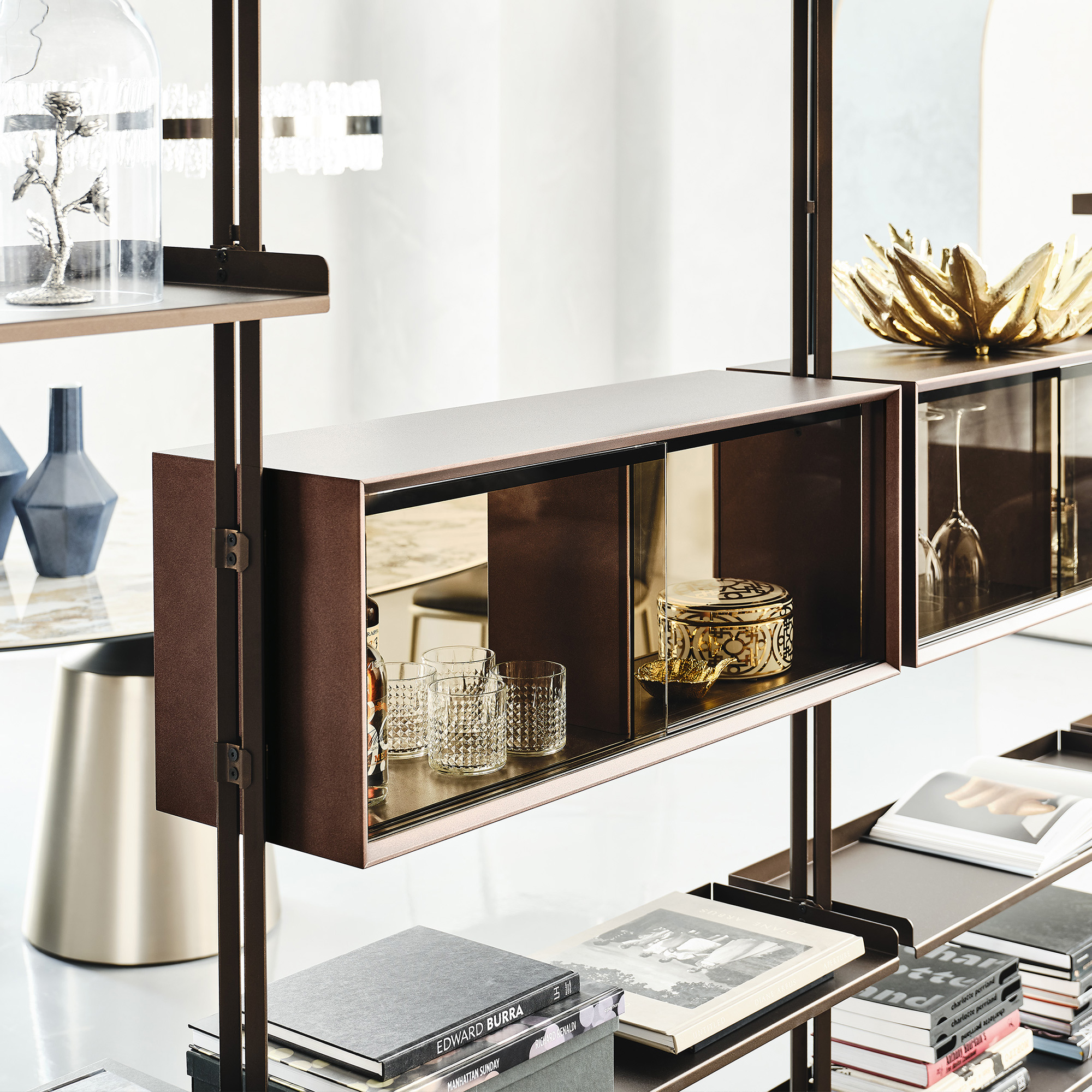 Designed to adapt seamlessly to your space, the Freeway Modular Bookcase offers variable shelf and box lengths that allow for irregular, customized layouts. Metal shelves and integrated storage boxes introduce both visual contrast and everyday functionality, while a refined palette of embossed metal, lacquered wood, and bronze glass elevates the composition. Whether placed against a wall, in a corner, or freestanding as a divider, Freeway delivers a sophisticated solution that balances form, function, and personal expression.