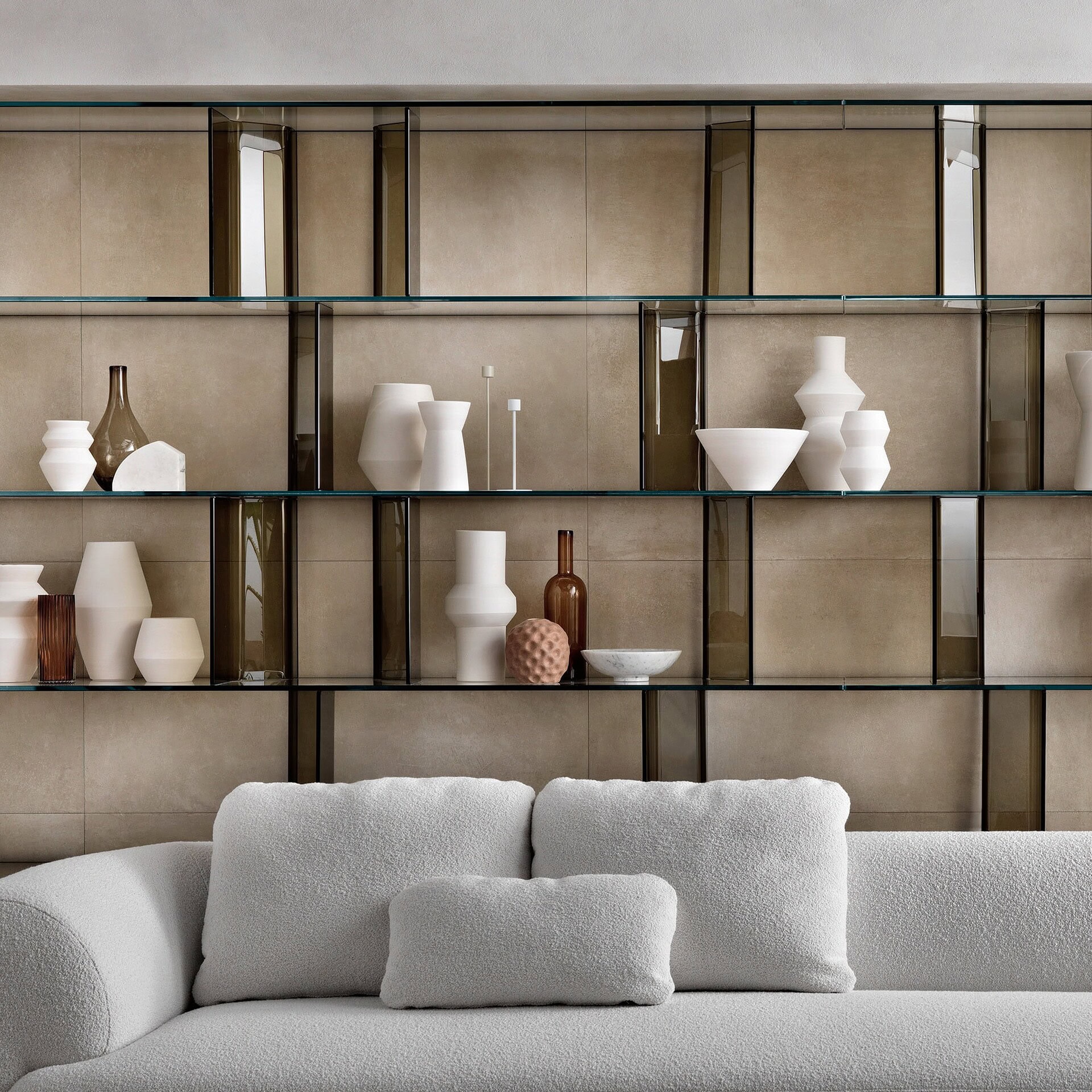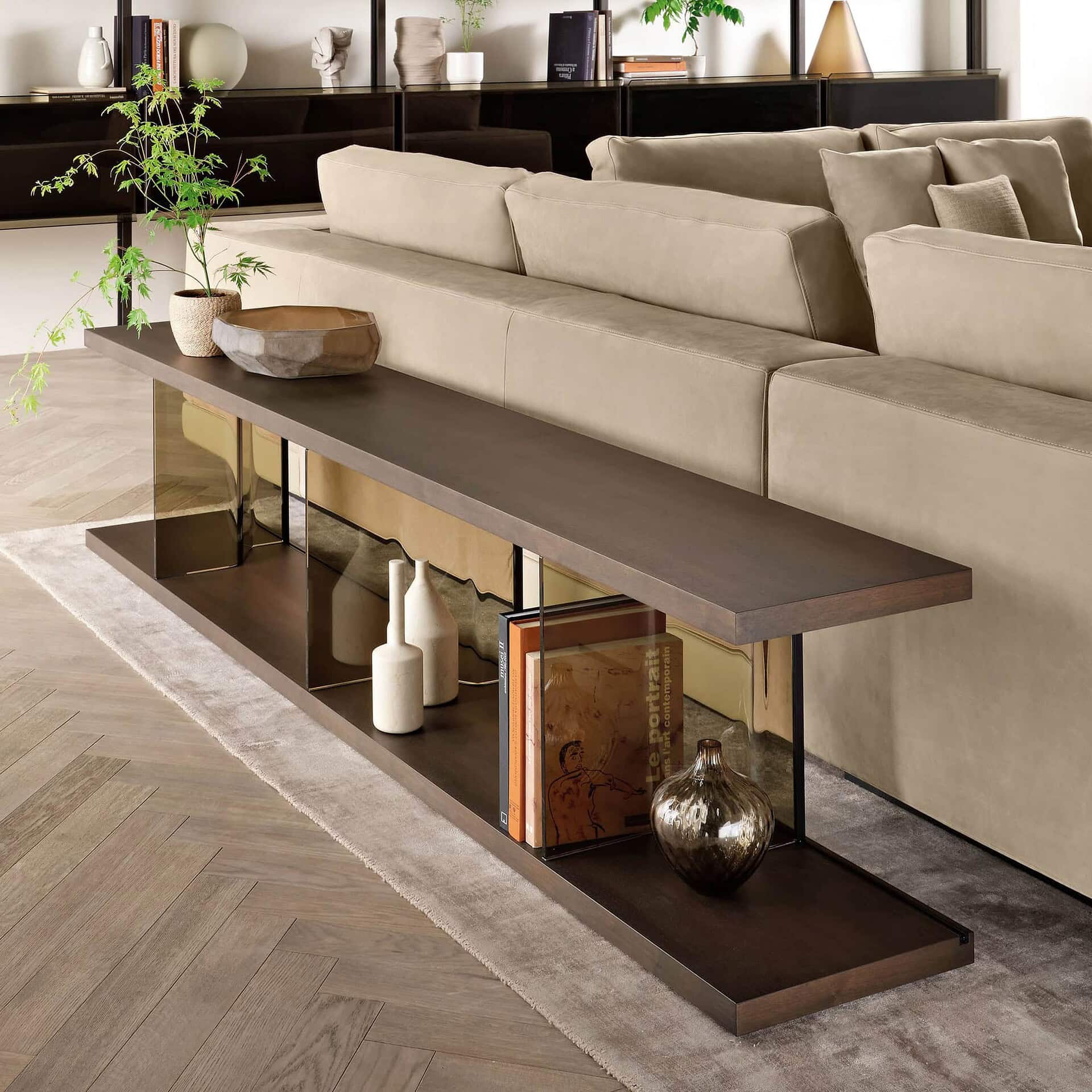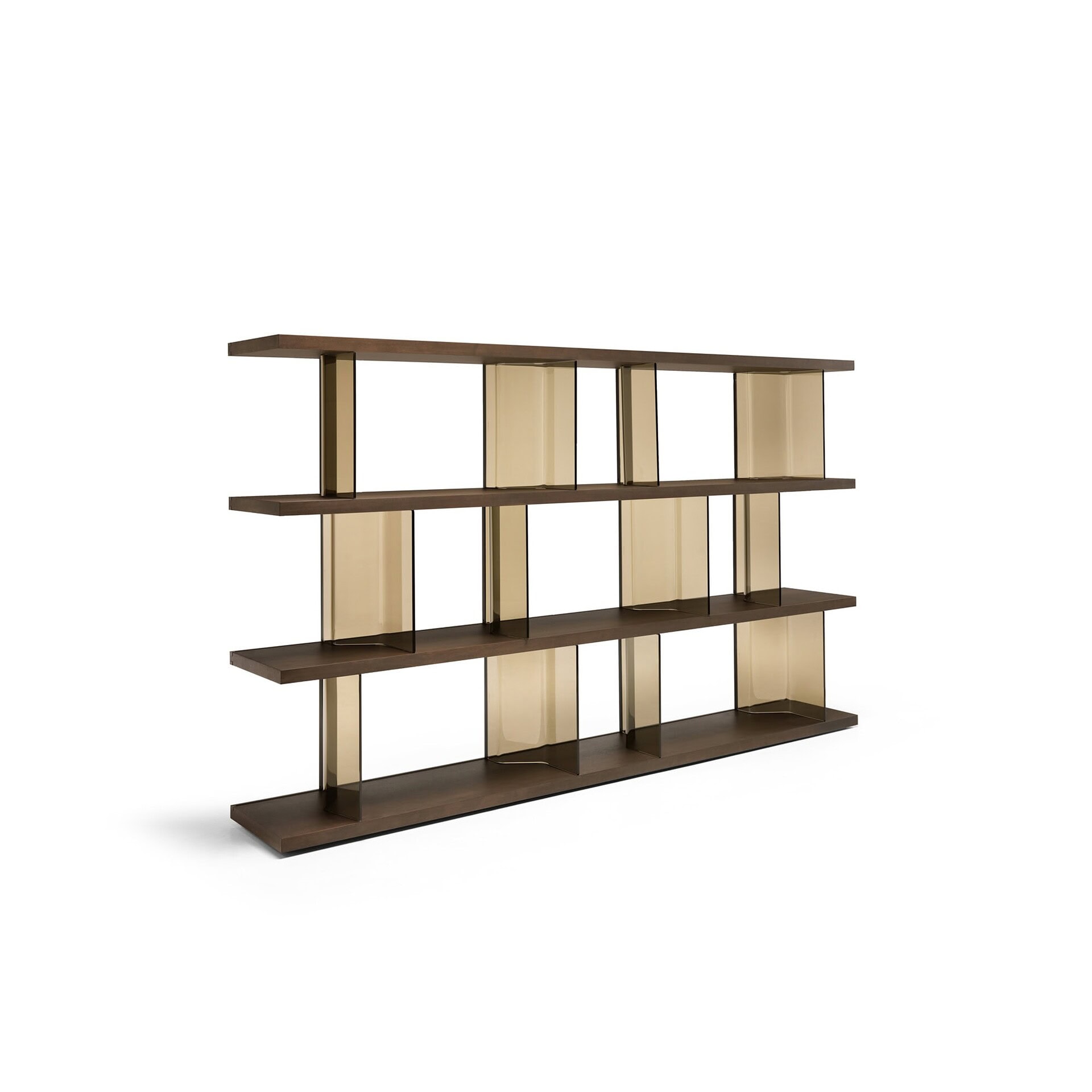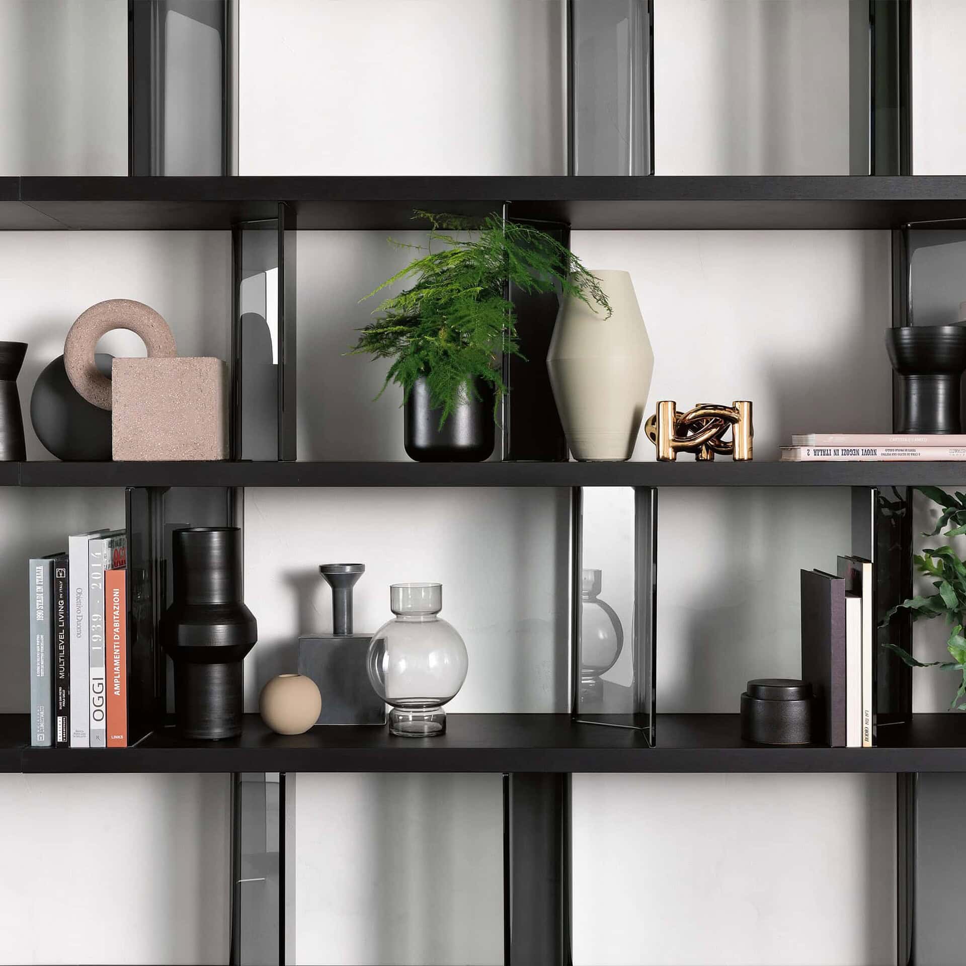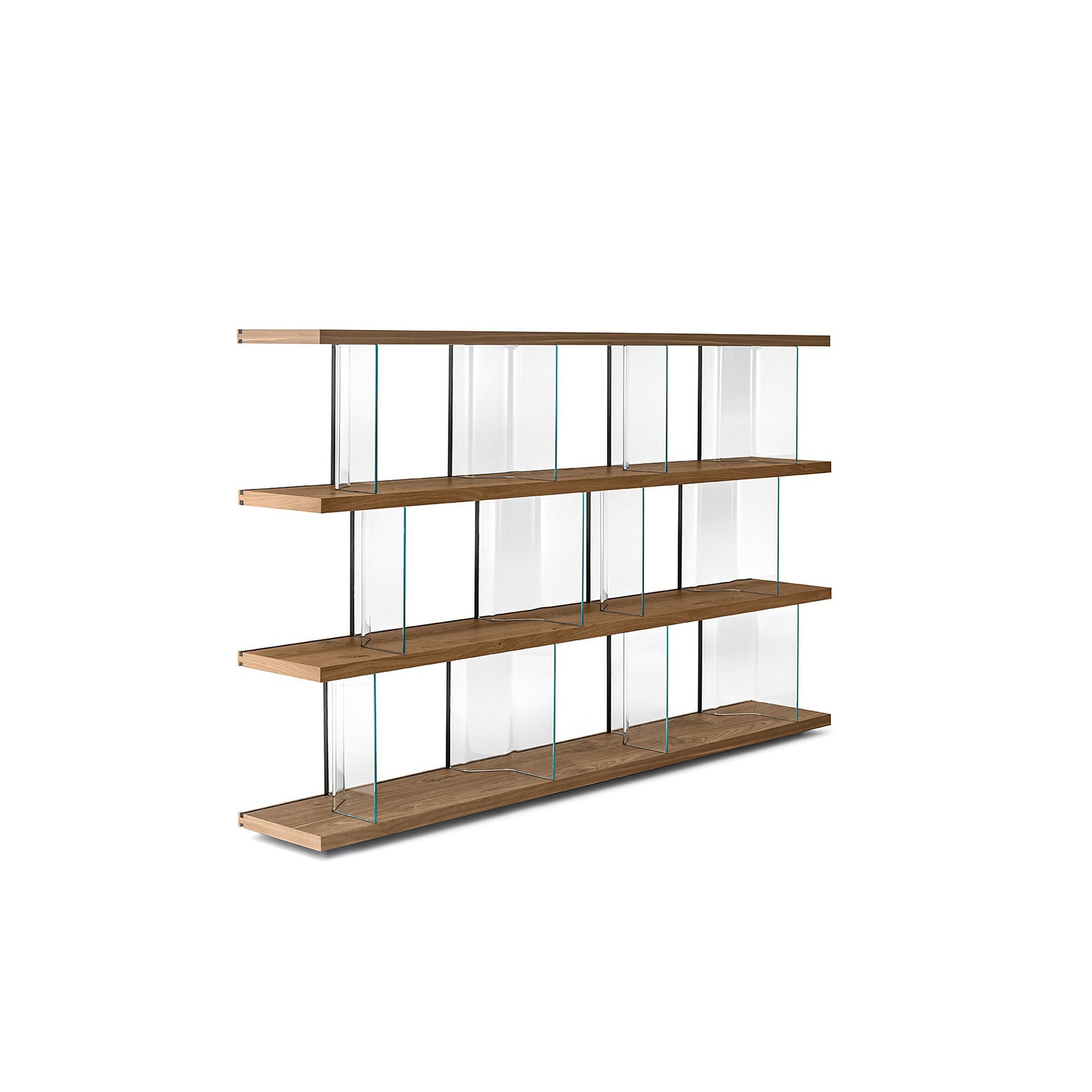 Shelves & Bases: Available in 12mm tempered glass (transparent, smoked, extralight, or back-painted in white or black) or 40mm wood (Old Style oak, Canaletto walnut with tobacco finish, or heat-treated black walnut).
