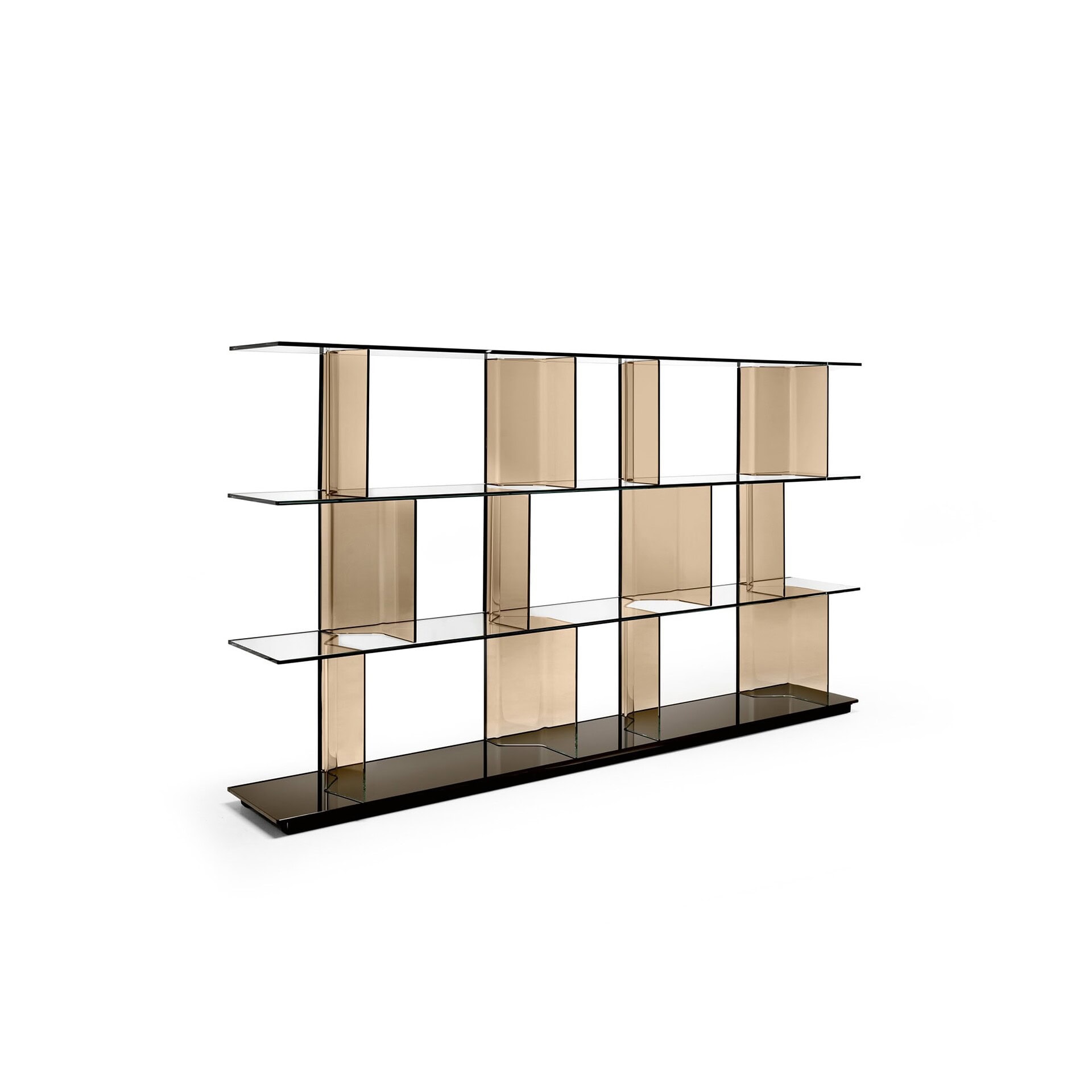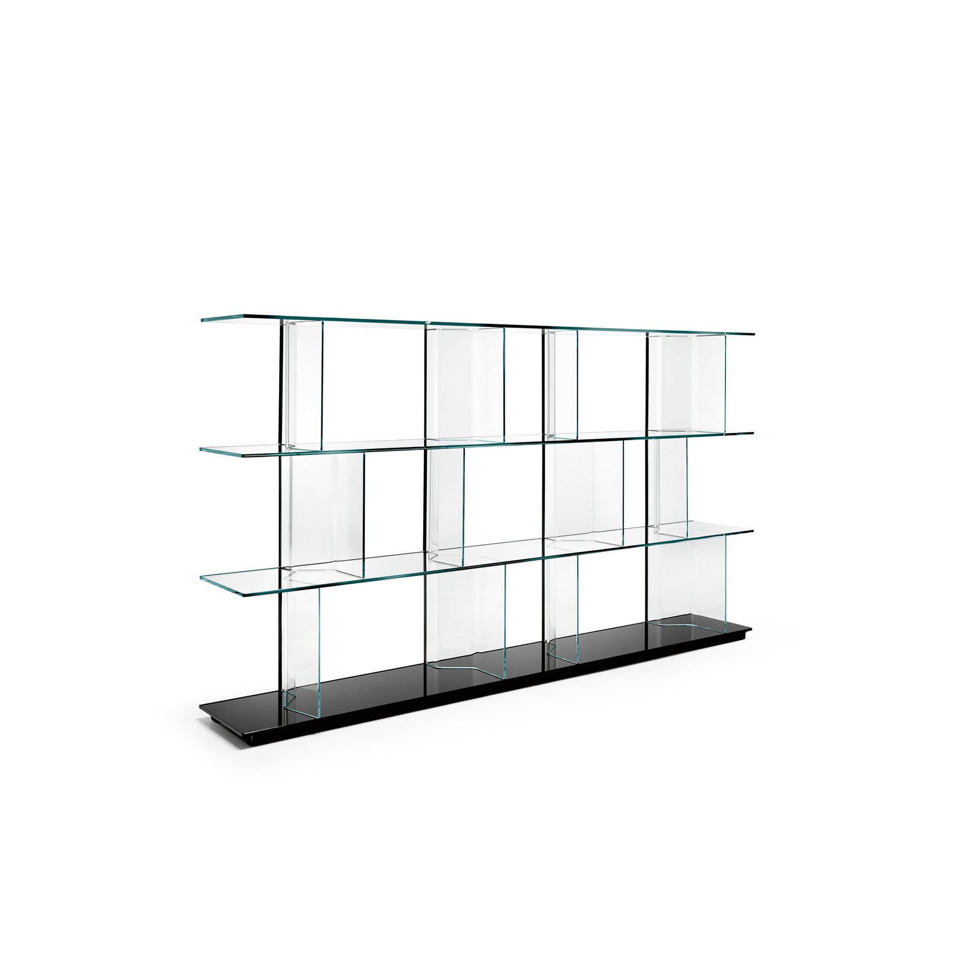Every component of the Inori system is meticulously considered: shelves and bases available in various glass or wood finishes, and curved glass uprights that can be positioned freely thanks to an innovative sliding track system. With generous weight capacity and a wealth of dimensional options, Inori is as practical as it is visually compelling—an elegant stage for books, collectibles, and media essentials alike.