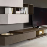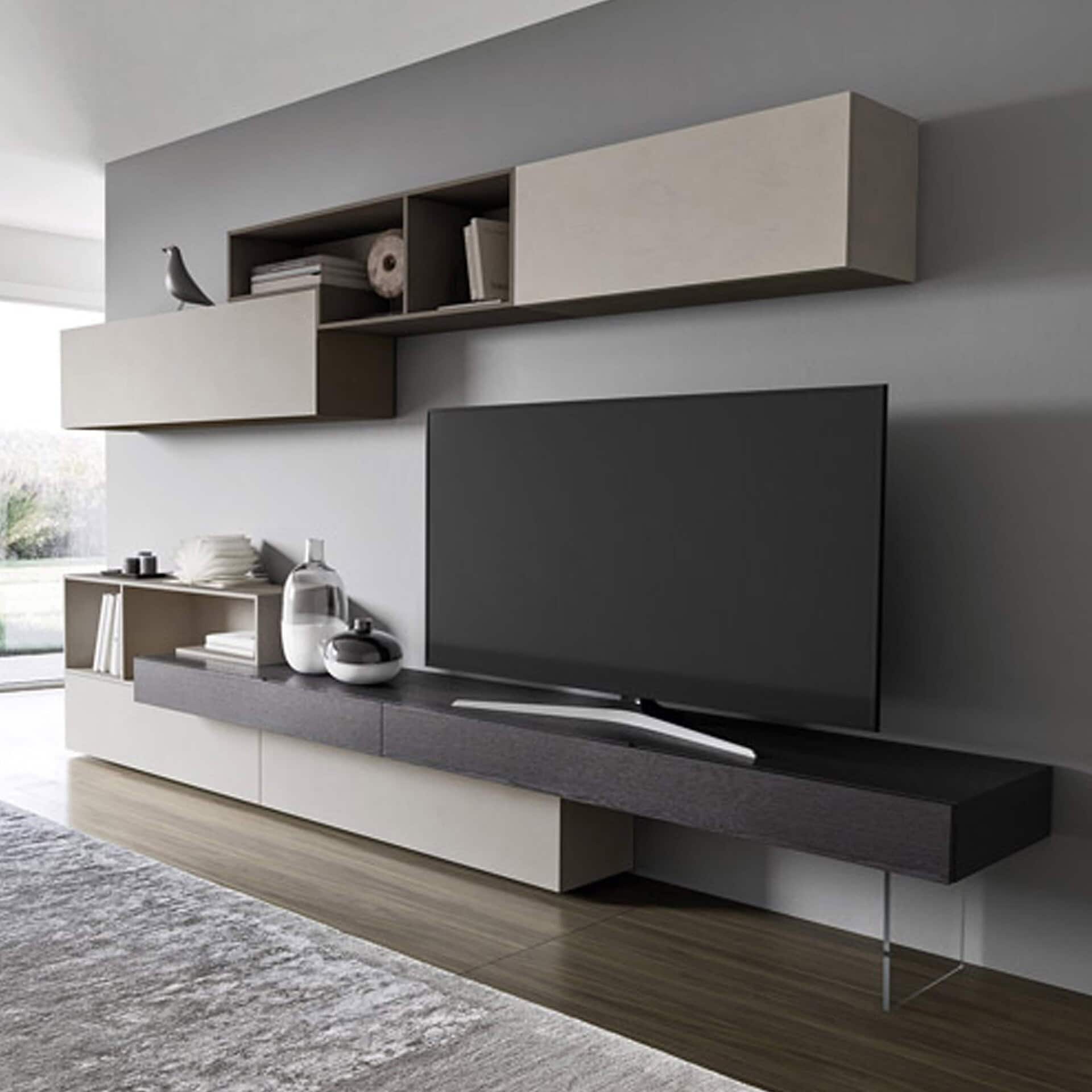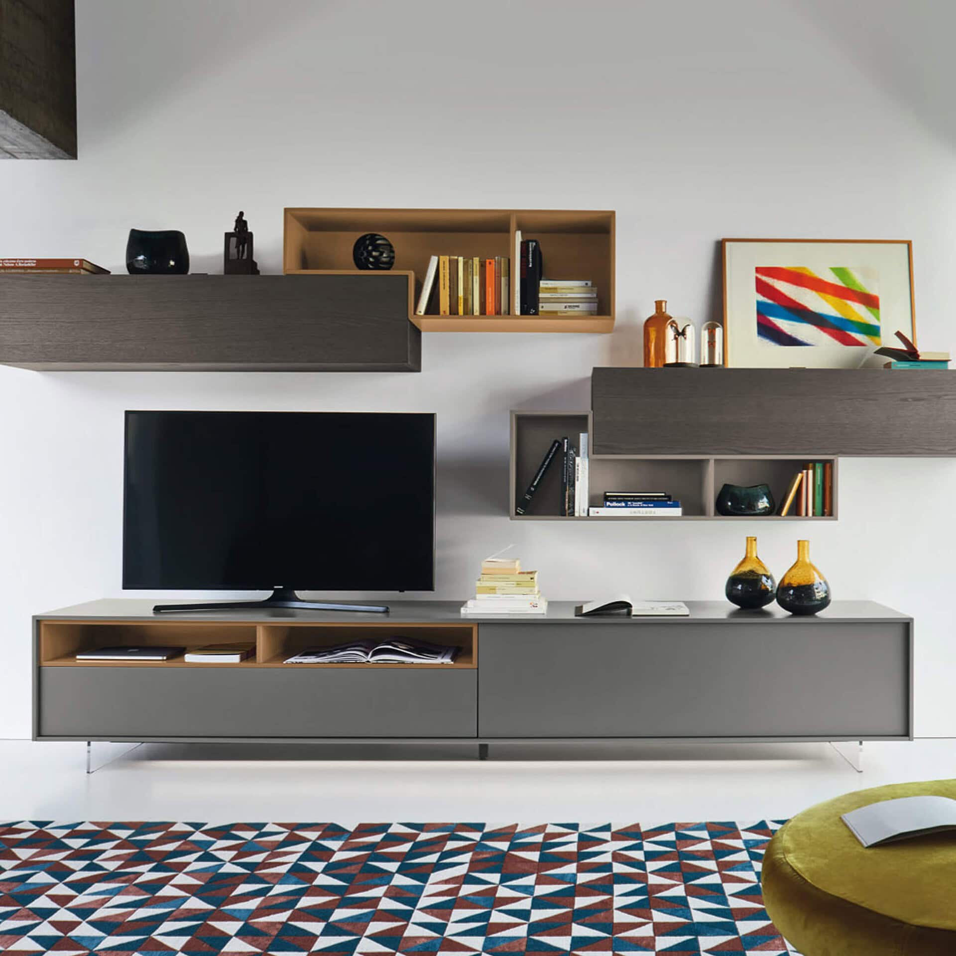 Geometrically inspired, the upper shelves mounted to the wall are reminiscent of a staircase for a unique touch. With Methacrylate legs, the base has room for a TV, and closed compartments allow electronics to be stored and organized. By contrast, the Lampo Wall Unit provides an eye-catching juxtaposition with its vibrant finishes and shapes. Made in Italy, it can be customized to suit your needs. There are also versions with and without swivelling TV mounts, as well as LED lights. The LED lights without a remote require a receptacle to activate them, or they can be hardwired. Choose from laminate, lacquer, and wood finishes.