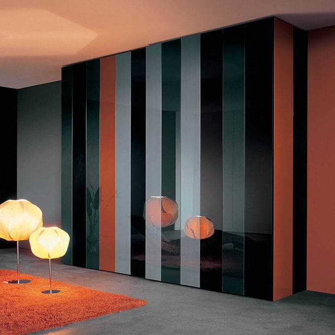 Maximized access to wardrobe contents combine with a magnetic closure system to make the N.O.W. Sliding Wardrobe a masterpiece in terms of functionality and style. Different configurations of lacquered, polished, or matte glass panels in various colors make the aesthetic options basically endless, allowing this unit to blend in or contrast any bedroom.