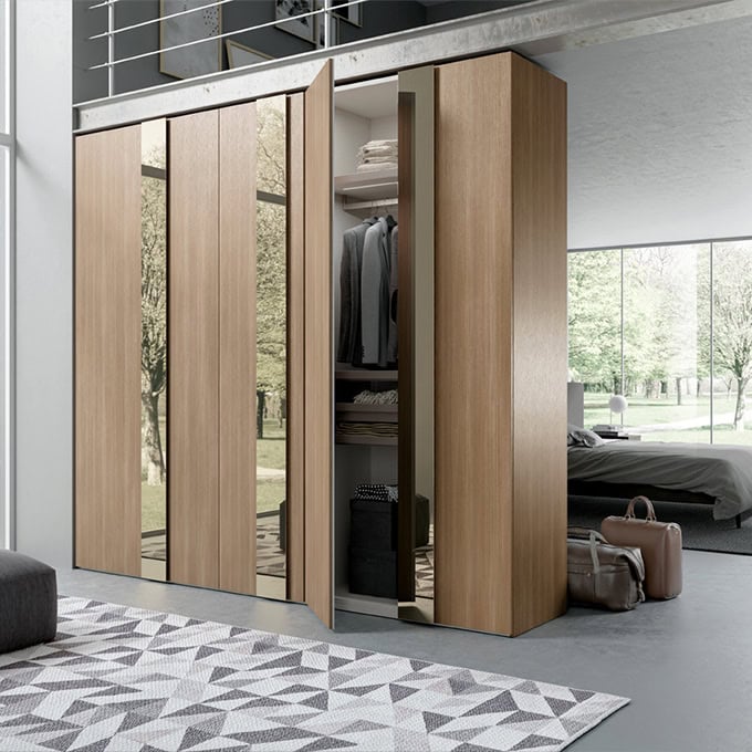 Hinged doors of classic, lovely textured wood are set against full length glass panels to create an interesting and inviting effect. Visually intriguing, the Tumidei Wardrobe Configuration 375 uses the Armadi wardrobe system and ensures that the focal point of your room possess a simple timeless quality, adding warmth and coolness in equal measure.