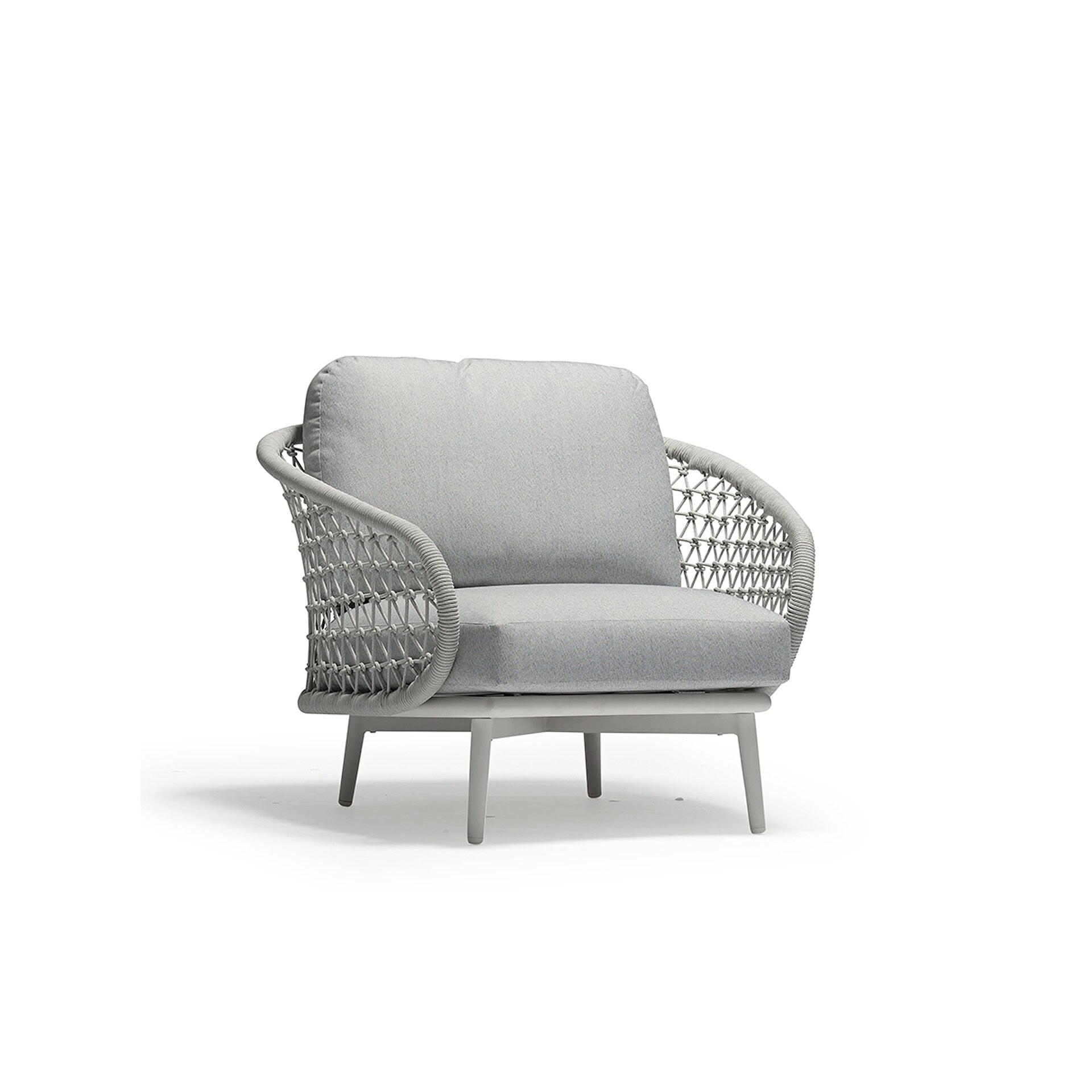 Crafted for durability and ease, the Cuddle Armchair features a contract-grade aluminum frame with a refined powder-coated finish. The open weave, made from UV-treated cord, adds visual lightness while maintaining structural integrity. Plush cushions filled with high-density foam are wrapped in weather-resistant COUTUREtex™ fabric, offering all-season resilience. Available in Greystock, with ample inventory for immediate delivery.