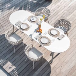 The Emma Cross Dining Chair draws inspiration from the graceful curves of a flower, providing an inviting and serene seating option. The unique design features an acrylic fabric band that beautifully contrasts with the rope weaving, creating a captivating pattern on the backrest. With its double weaving technique and vibrant color choices, this elegant armchair effortlessly adds a touch of freshness and sophistication to any indoor or outdoor space, making it suitable for both personal homes and commercial environments.