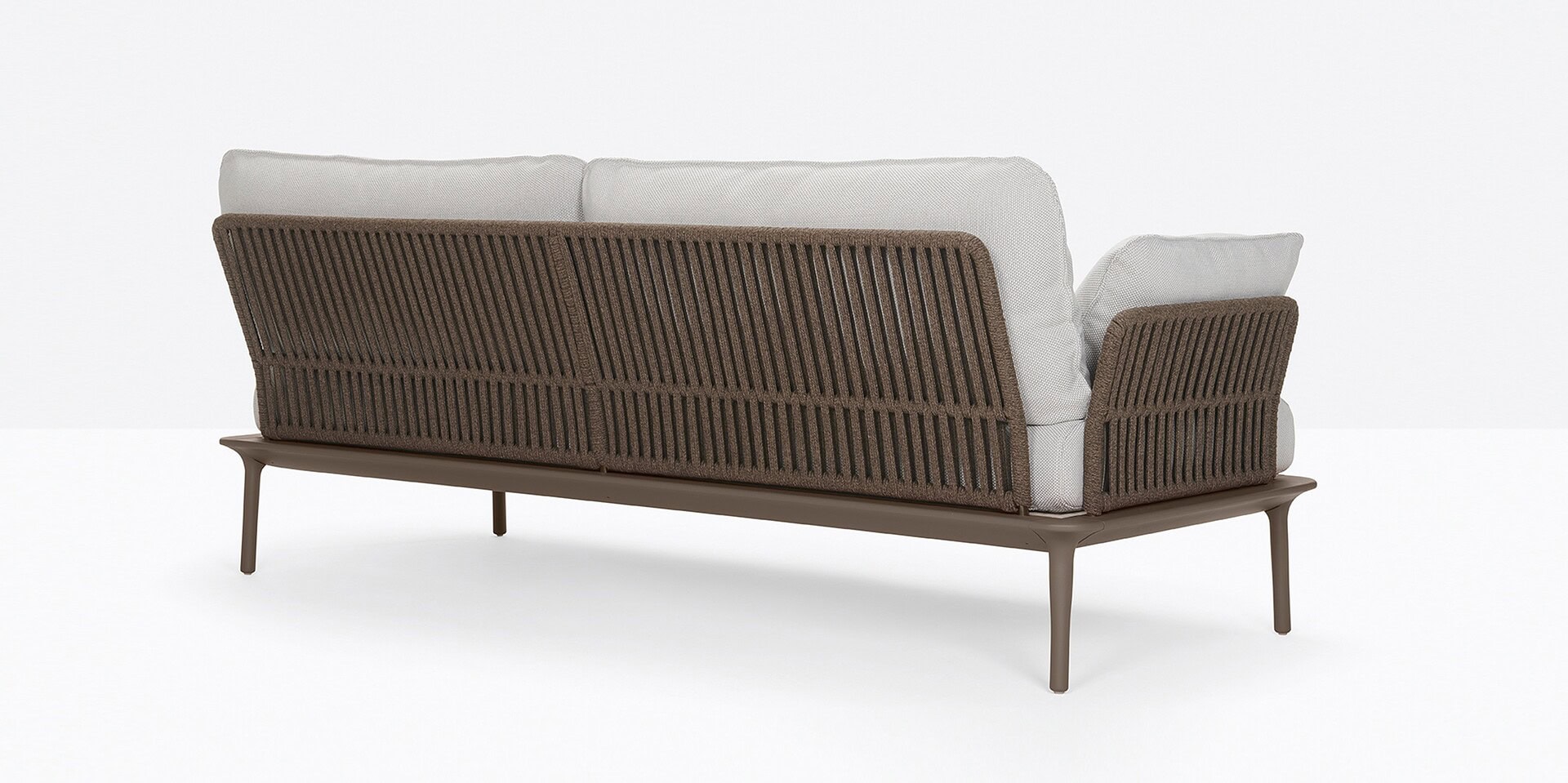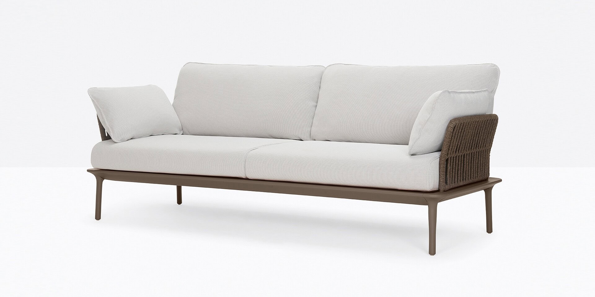 Reva Twist is an outdoor collection with smooth lines and generous sizes. Three-seater sofa with four tapered legs in die-cast aluminum placed at the extremities of the perimeter frame in extruded aluminum. The steel backrest and armrests are woven with a flat rope in weather-resistant polypropylene. Polyester cushions upholstered in fabric.