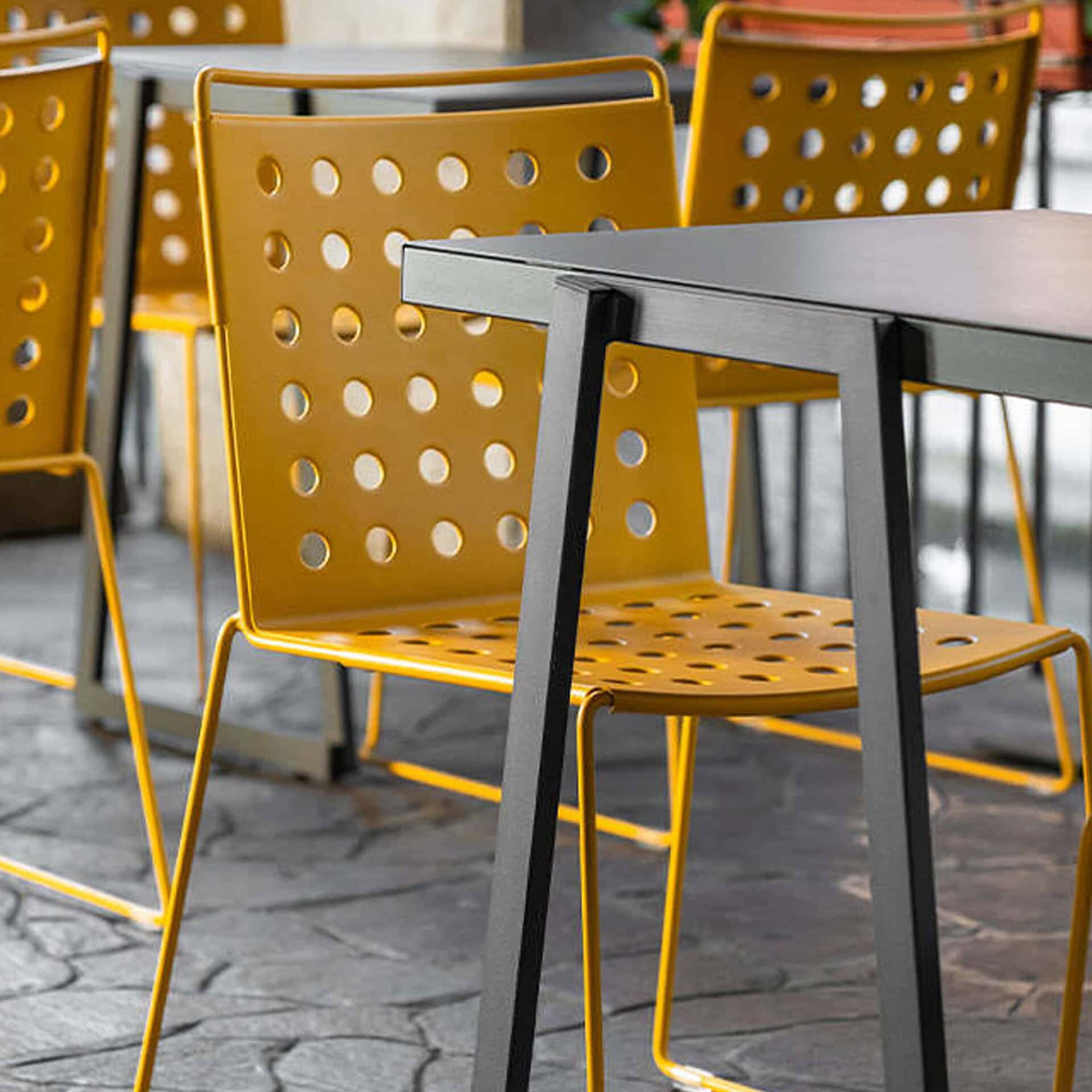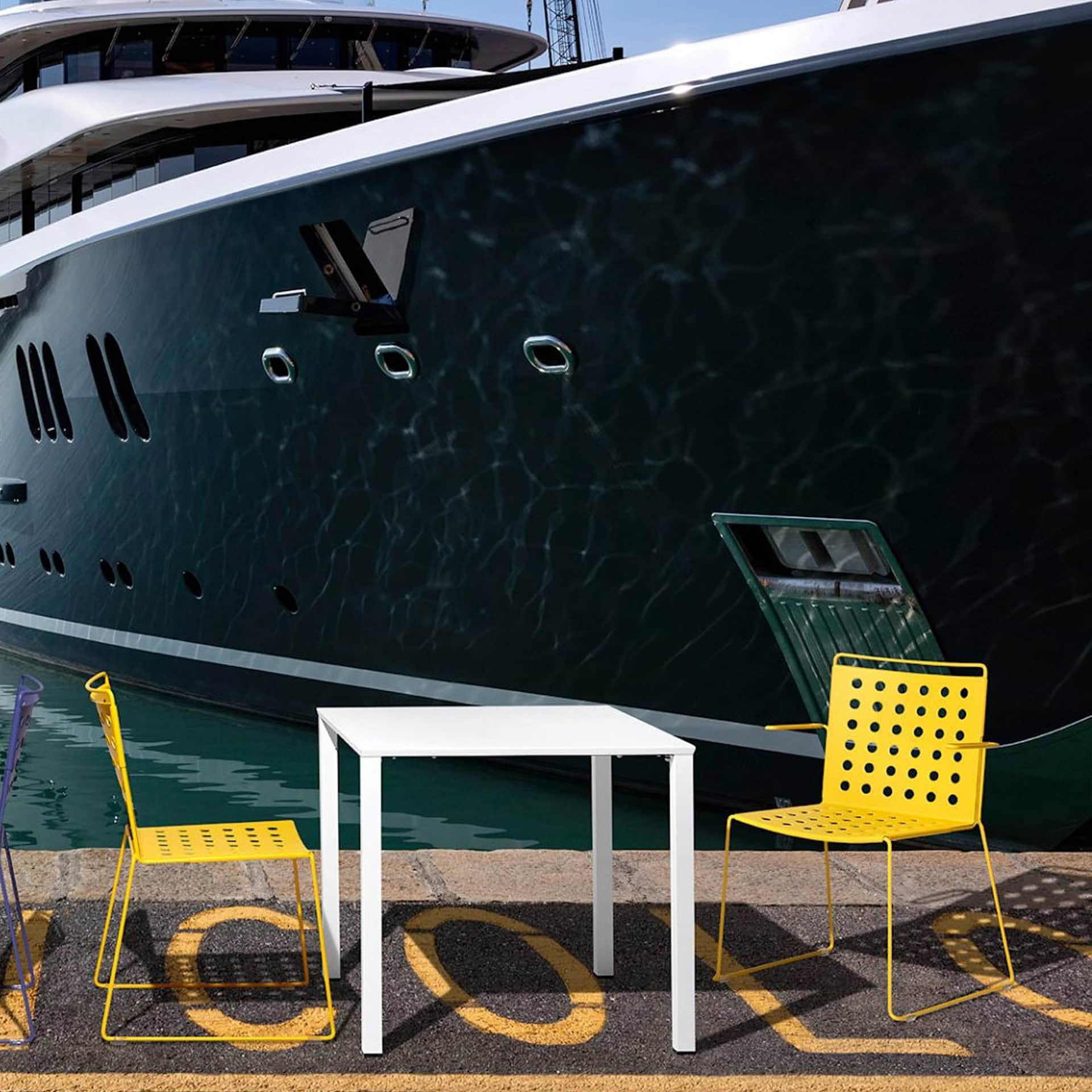 The Splash Air features a monocoque seat in molded aluminum and a frame constructed from galvanized steel wire. Both elements are coated in matte polyester powder for a durable, weather-resistant finish. Designed for indoor-outdoor use, these materials ensure lightweight structure and resilience against the elements.