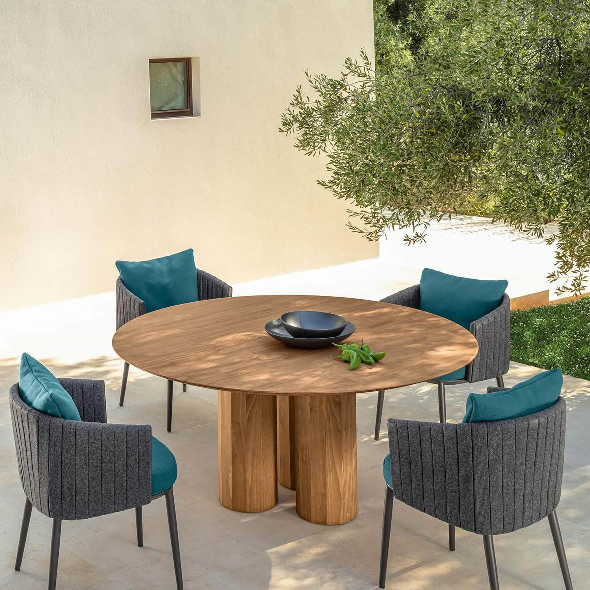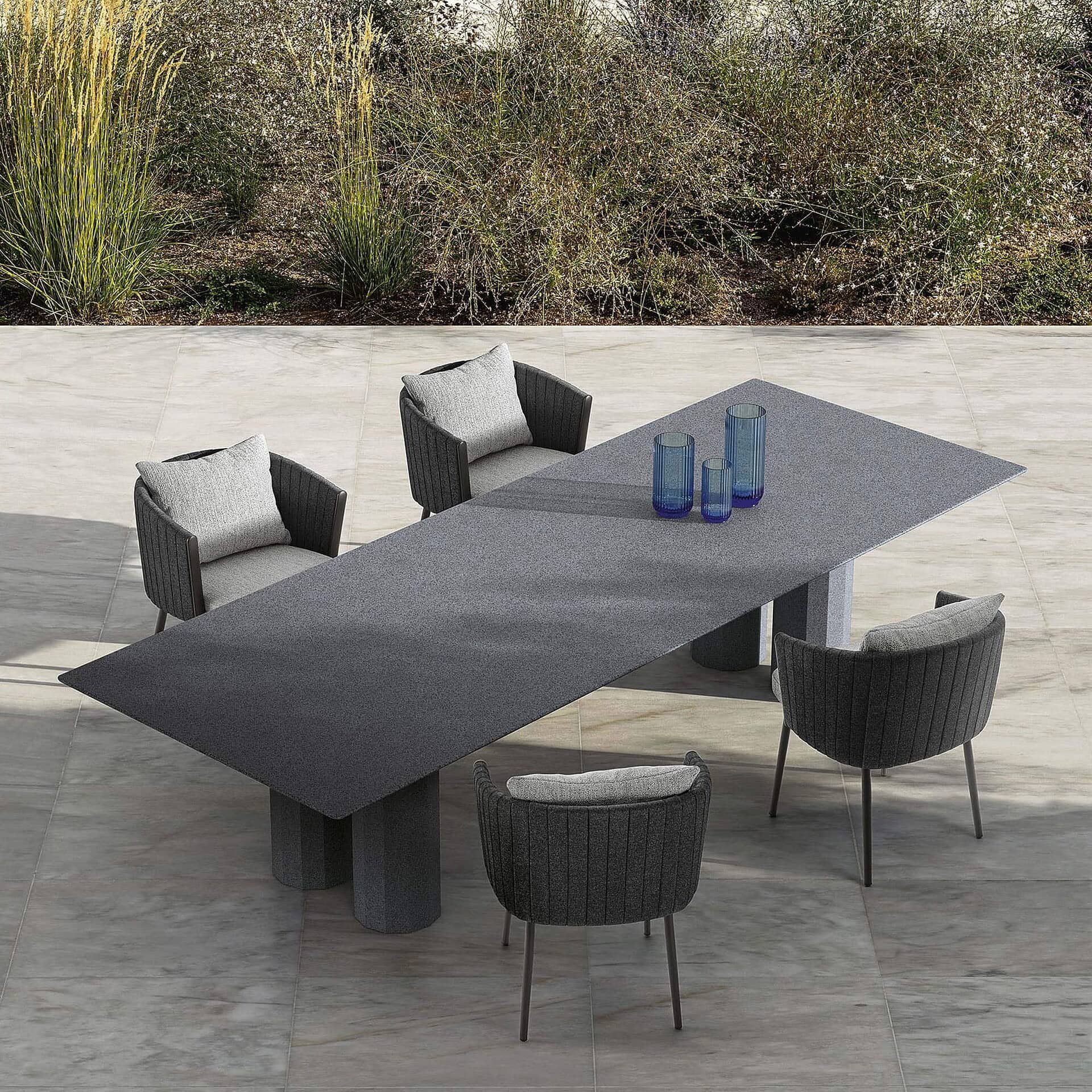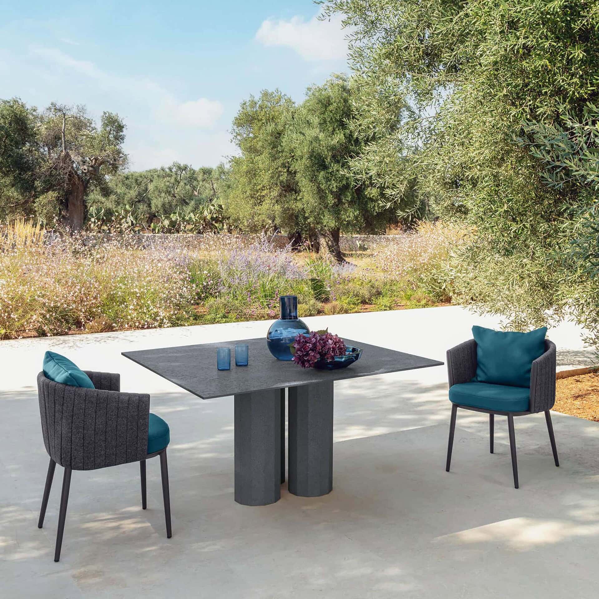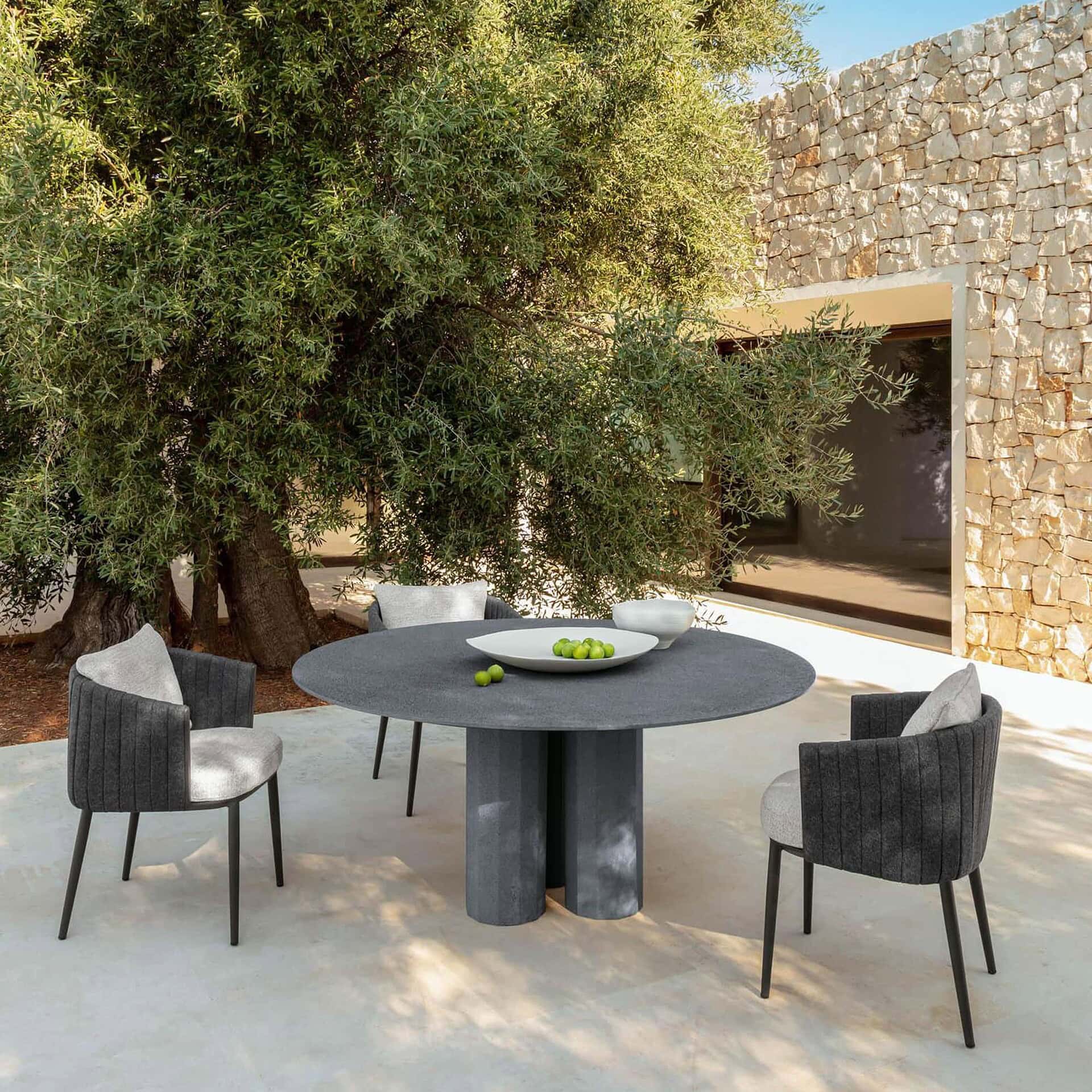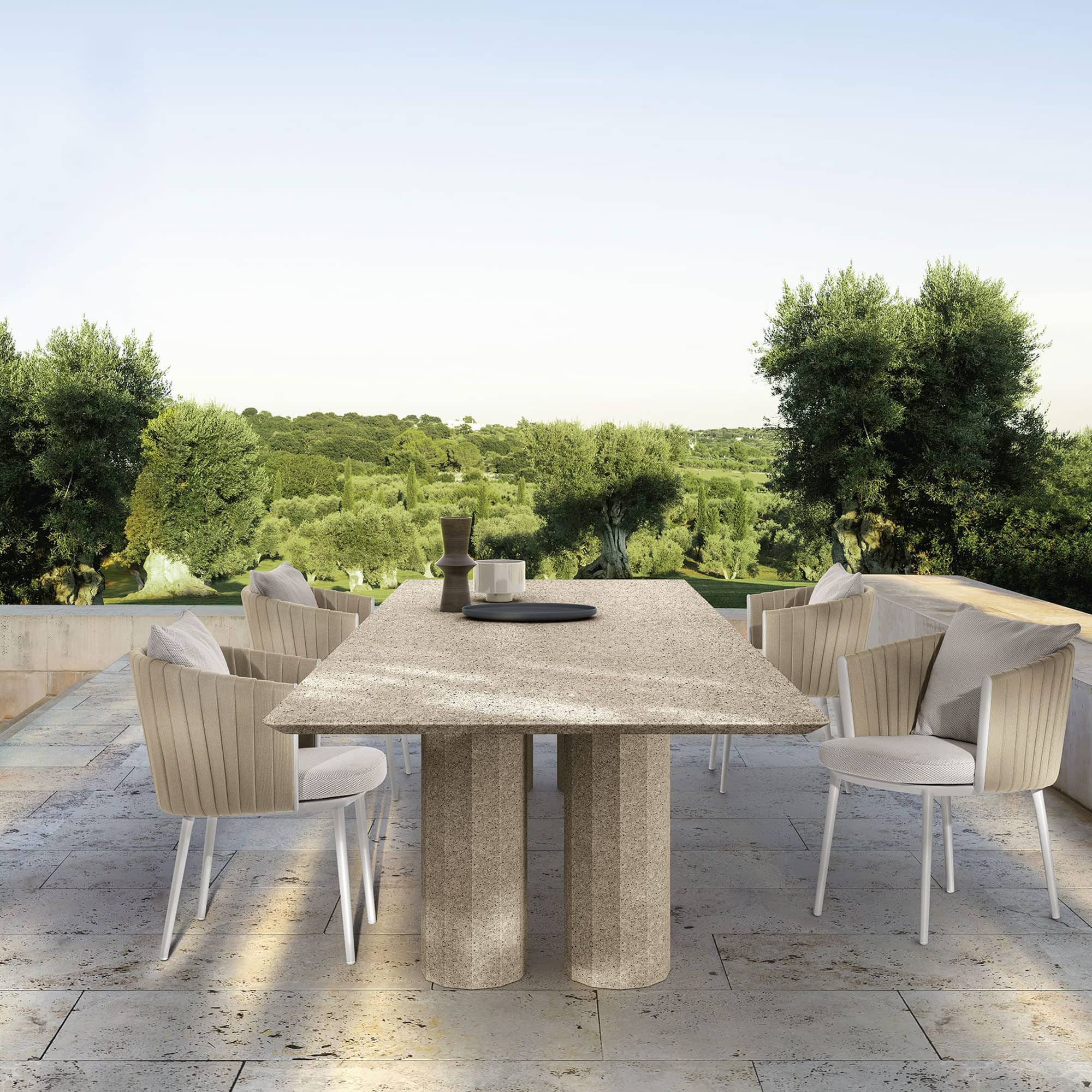 Designed to be the focal point of outdoor gatherings, the Salinas table is available in a range of shapes and finishes to suit diverse spaces. From rectangular tops to circular forms, each is supported by three or four sculpted columns that emphasize balance and timeless design. The table’s clean lines and tactile surfaces embody Talenti’s dedication to merging artistry with functionality—offering an invitation to dine in comfort and style, surrounded by nature.