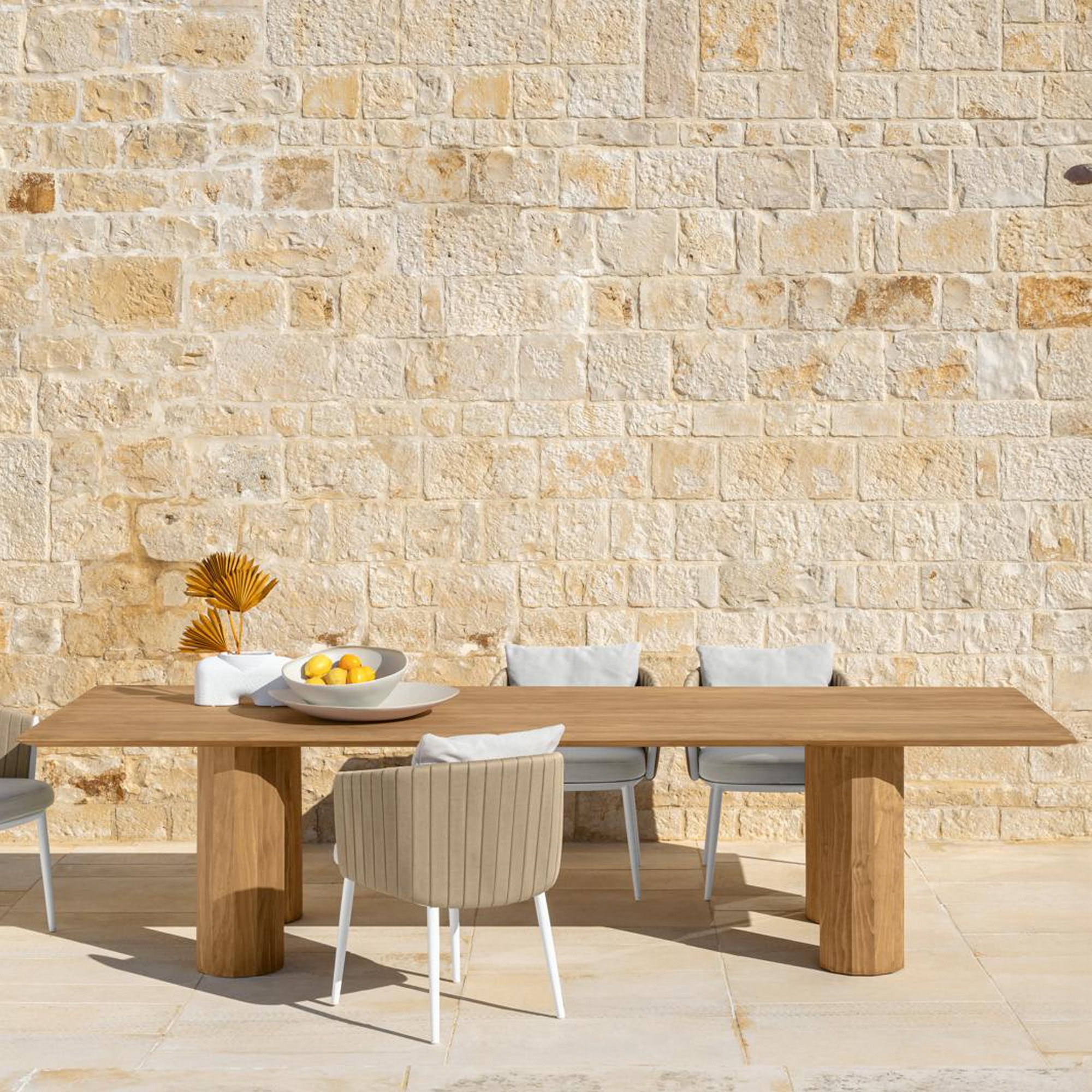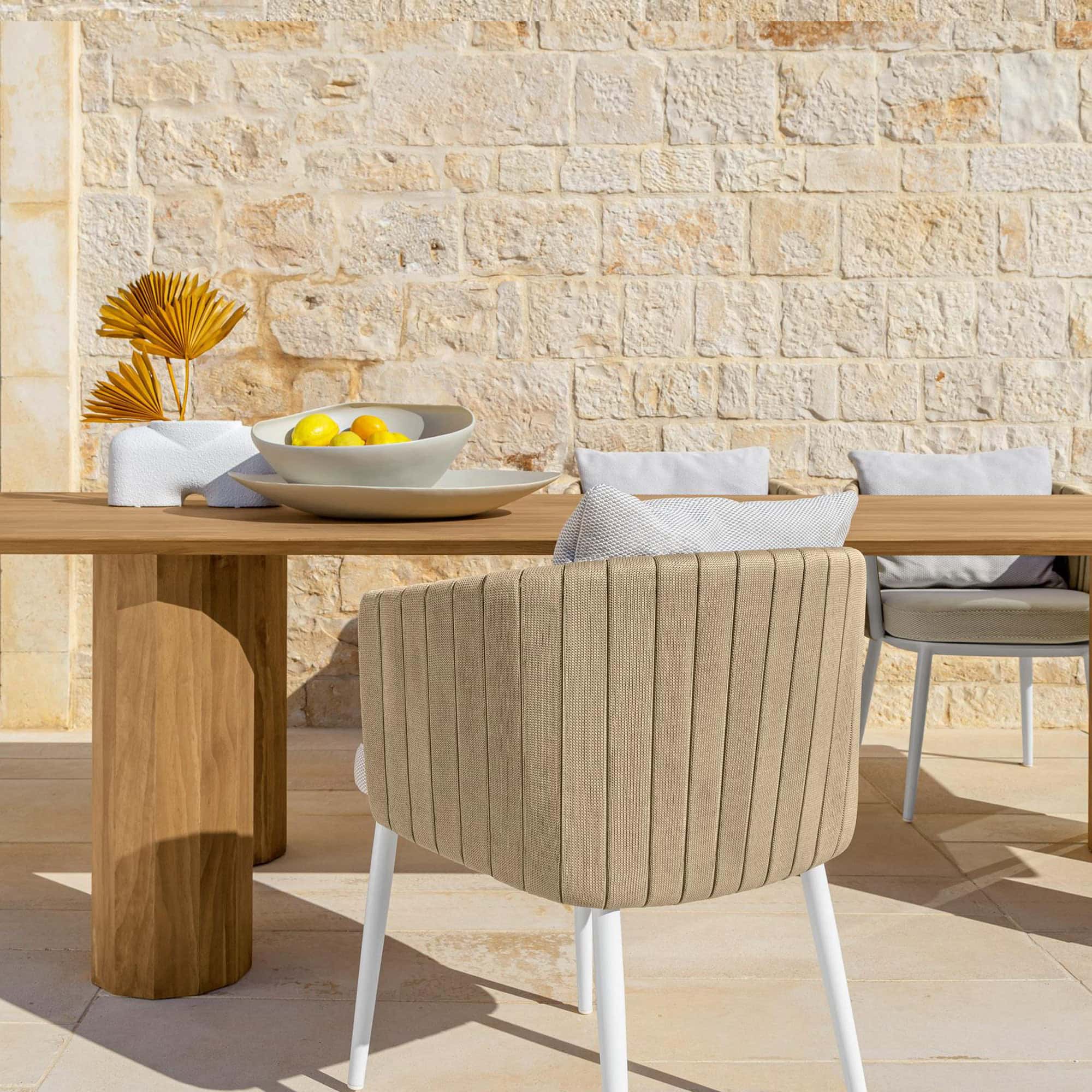 Inspired by the natural elegance of the Ibiza region, the Salinas Dining Table by Talenti brings indoor sophistication into open-air settings. Its refined silhouette is grounded by column-style legs, a nod to classical architecture, while its sculptural presence balances strength and grace. Whether in solid concrete or rich Accoya wood, each version highlights the raw beauty of its material, blending seamlessly into contemporary or rustic outdoor environments. The craftsmanship and thoughtful design elevate any patio or garden, evoking the quiet charm of Salinas itself.