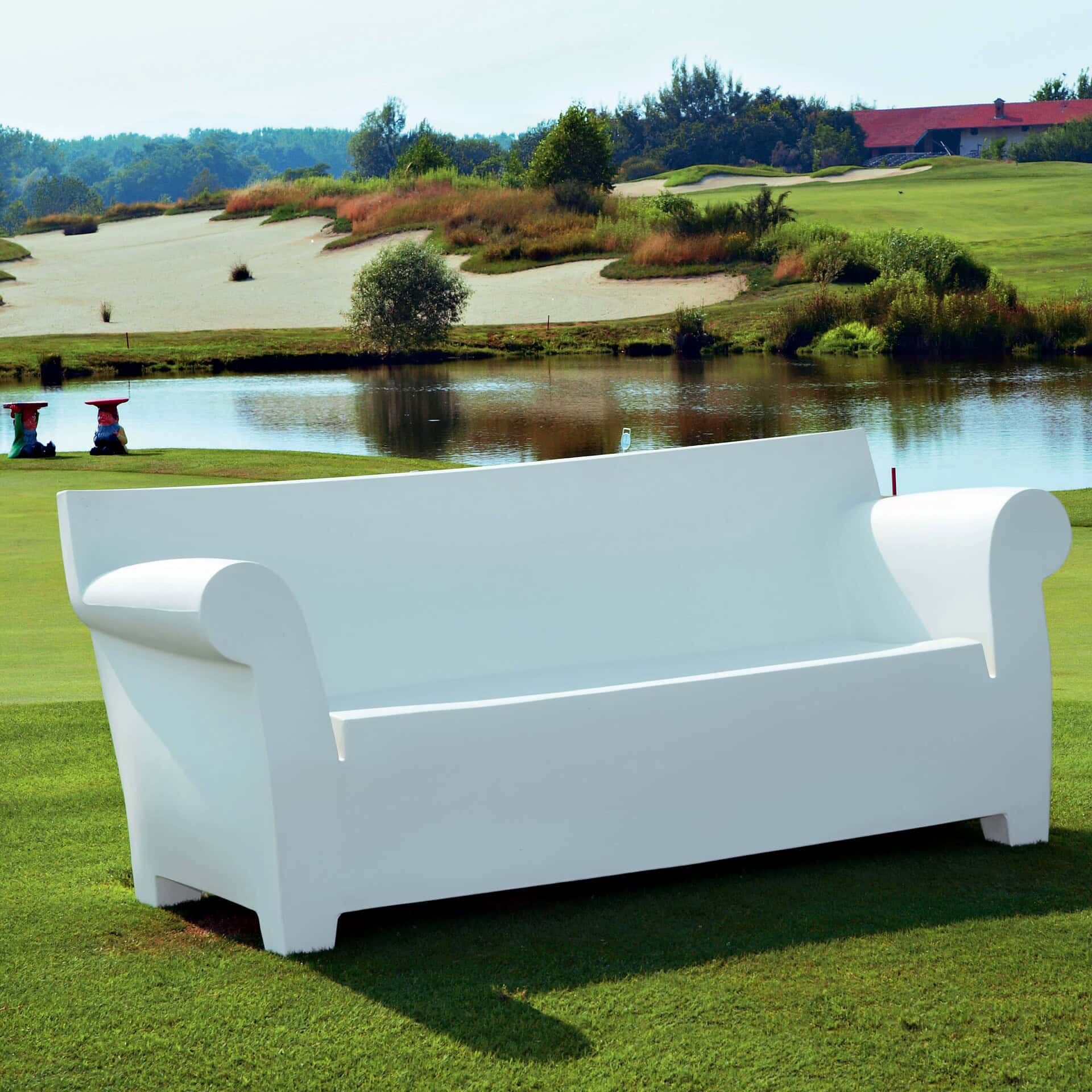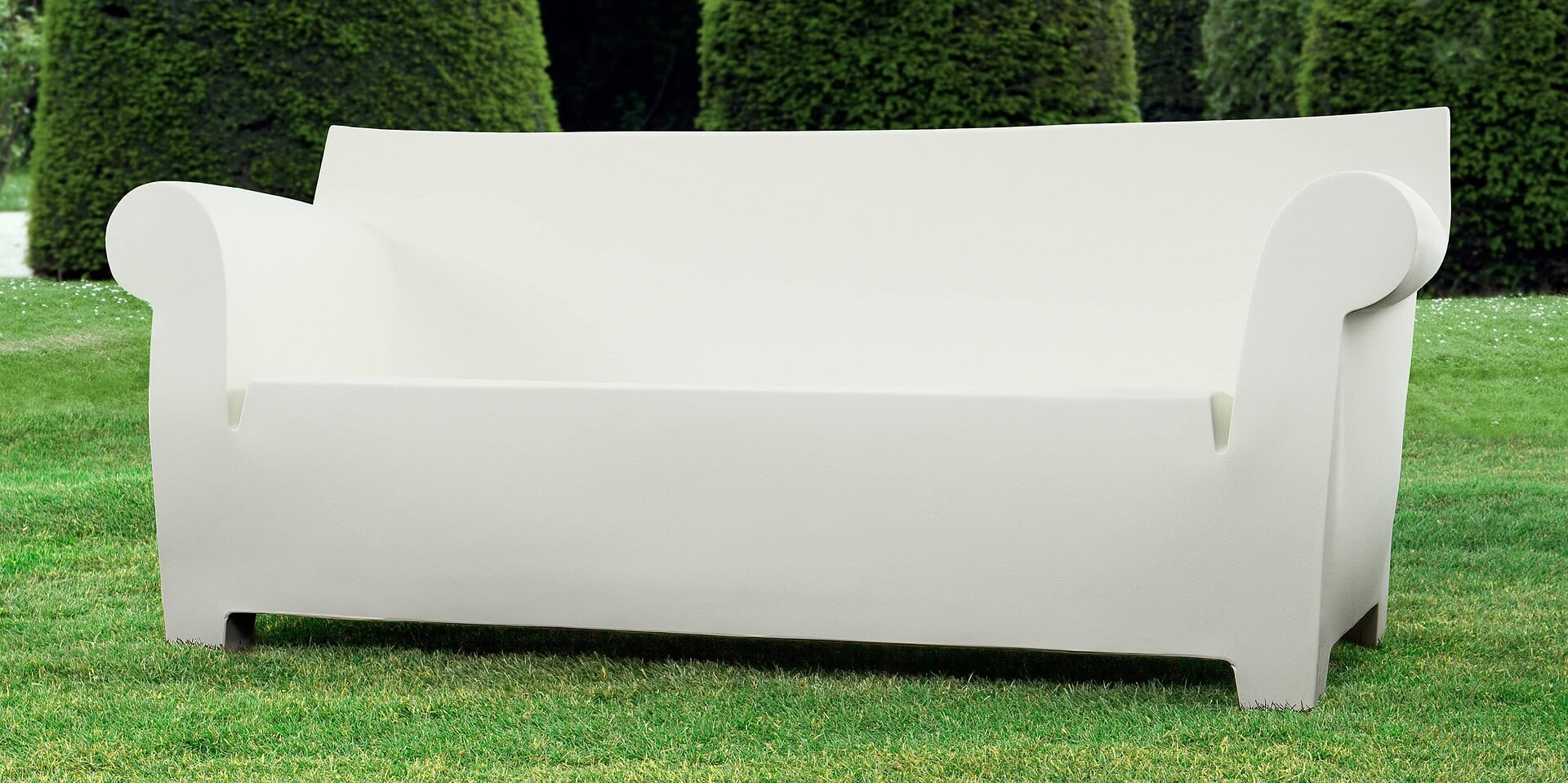 There is no doubt that the Bubble Club is the industrial sofa in which Kartell has been able to mass produce with rotational moulding technology. This large two-seater sofa is characterized by its soft armrests that contrast with the more rational backrest; a silhouette that reminds you of a grandmother's sofa, with its essential silhouette. As the Bubble Club armchair and occasional table are made in the same colours and finishes, they come together to form a real family, a "industrial lounge" for furnishing a garden, a poolside or a terrace.