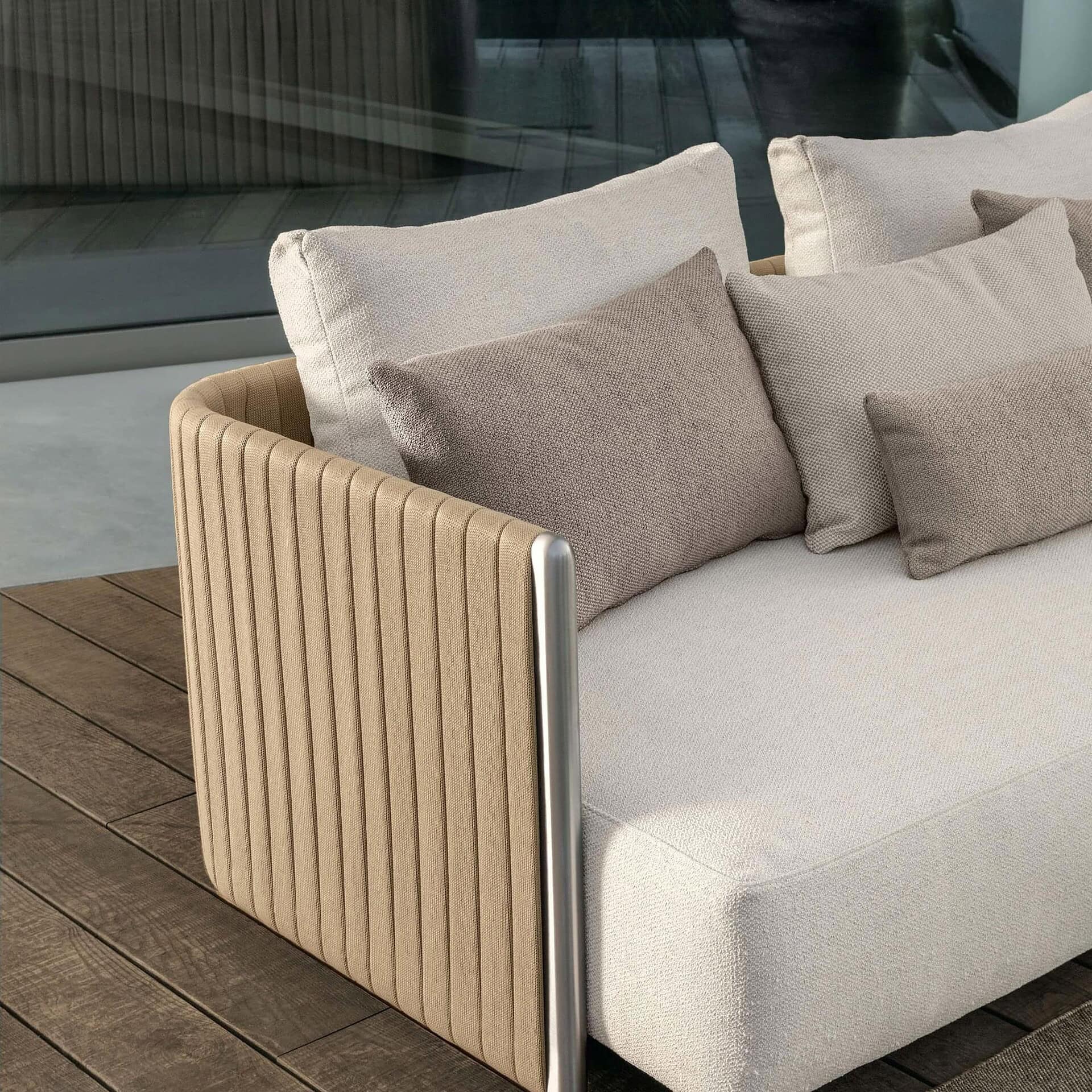The George Modular Sofa by Talenti is a sophisticated blend of durability, comfort, and refined outdoor design. With a structure crafted from exposed stainless steel uprights, its bold framework contrasts beautifully against the delicately padded synthetic rope that wraps the backrest in tactile rhythm. This interplay of structure and softness offers both visual lightness and enduring strength, ensuring the piece thrives in outdoor environments.