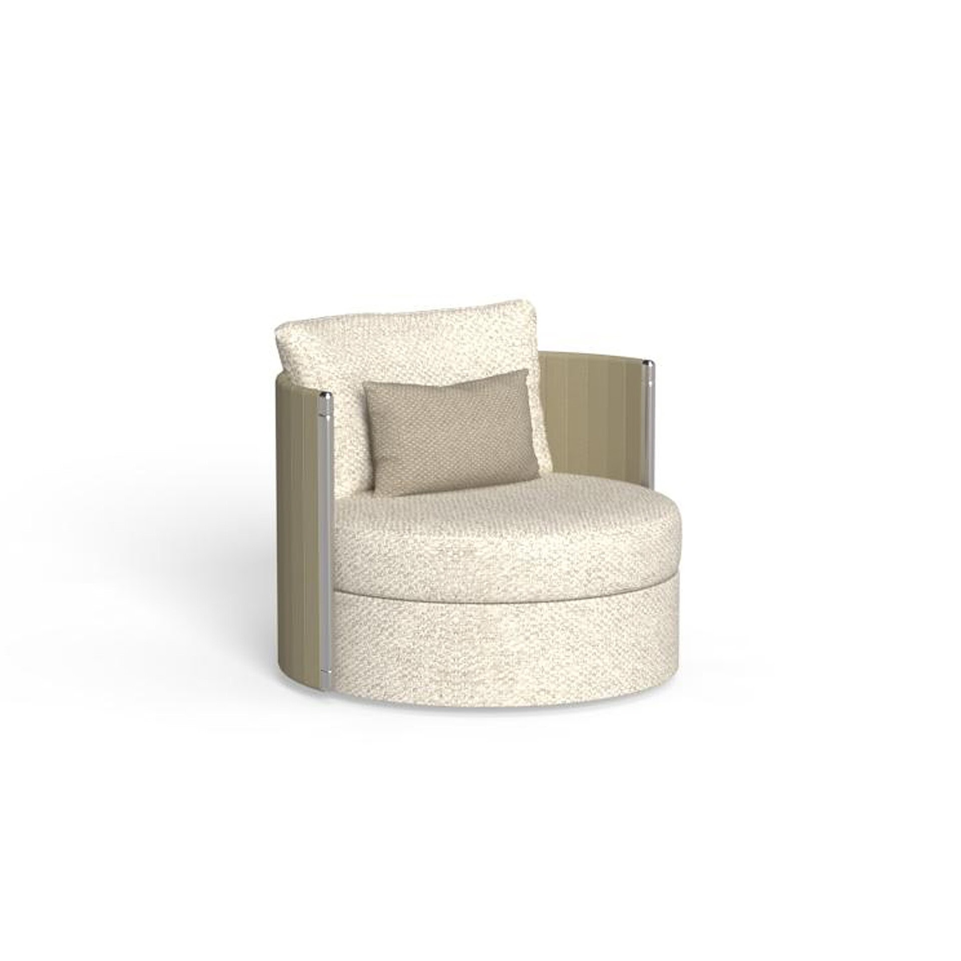 The George Swivel Outdoor Armchair brings sculptural softness to modern alfresco living. Defined by its enveloping curves and clean architectural lines, this generously padded armchair offers a refined yet inviting presence. The 360° swivel function enhances its relaxed sensibility, allowing effortless movement while maintaining a composed, contemporary silhouette — ideal for terraces, covered patios, and poolside lounges.