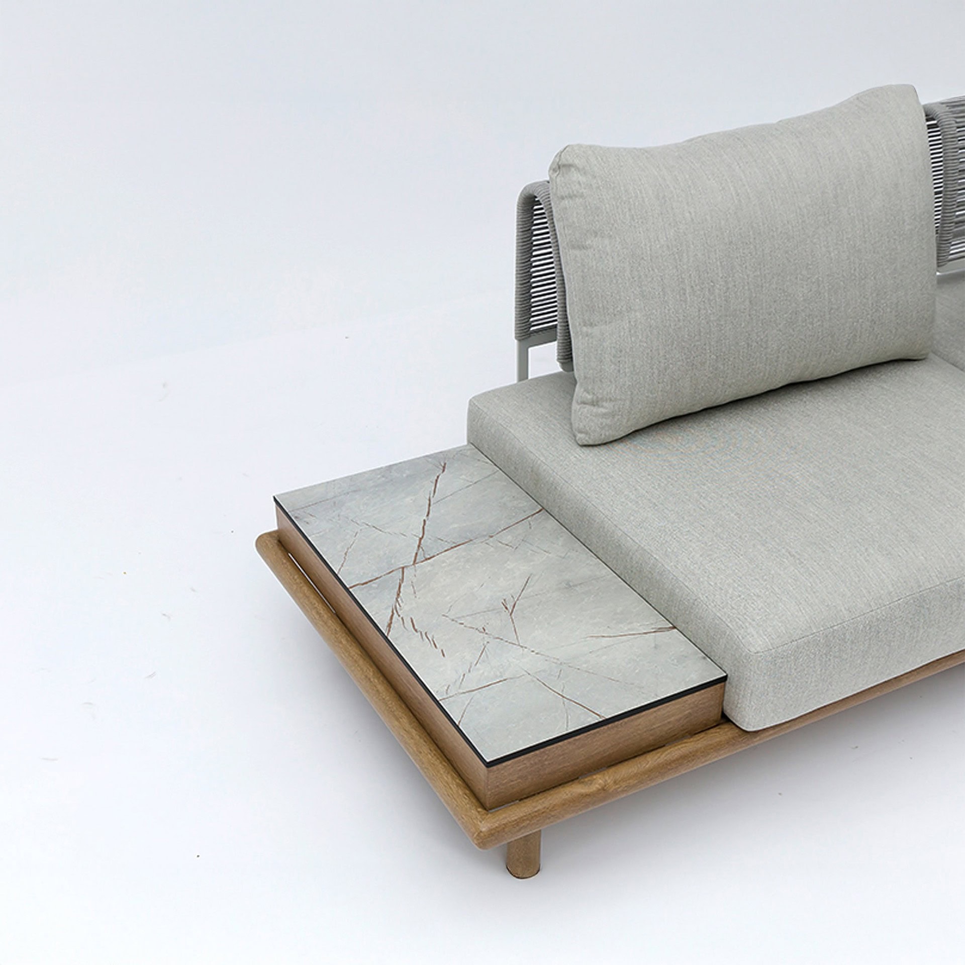 Crafted from a contract-grade welded aluminum frame with a durable Tiger brand powder coating, the chair is wrapped in UV-treated outdoor rope for added texture and resilience. Plush, high-density foam cushions are upholstered in waterproof-treated COUTUREtex fabric for lasting comfort and durability in outdoor environments. The matching side table features a durable surface that complements the chair’s finish, blending form and function effortlessly.