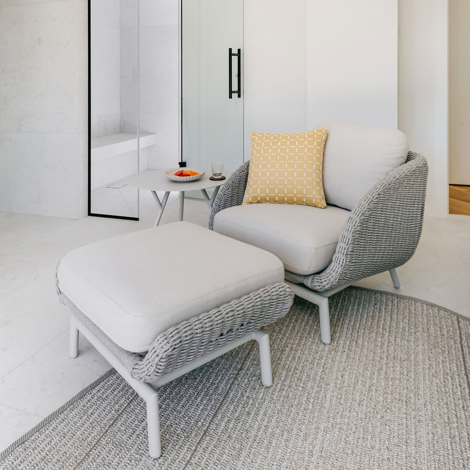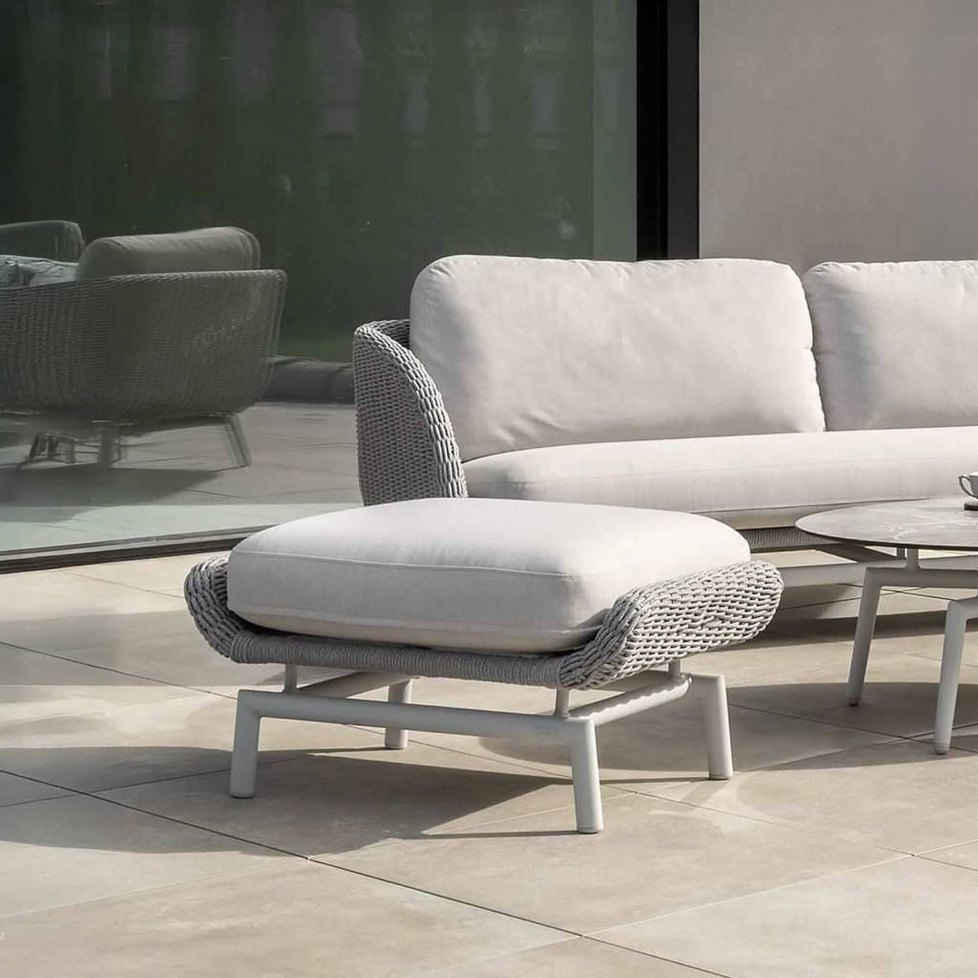 The Scoop Ottoman brings versatility and comfort to your outdoor space with its laid-back elegance and thoughtful design. Whether used as a footrest, an extra seat, or paired with the Scoop Armchair, this piece enhances both function and flow in any lounge setup. Its sculptural form and braided texture make it a stylish companion piece, perfect for relaxing poolside or unwinding on the patio.