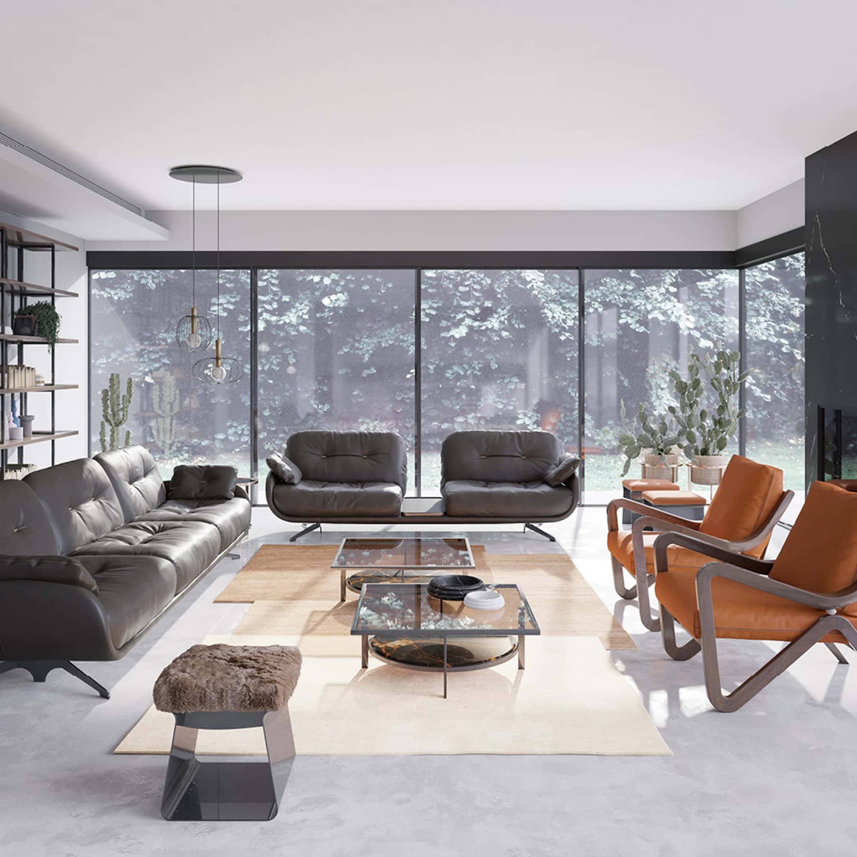 The Ayton seating system combines tradition and innovation to generate contrasting sensations: the sharp lines of the support contrast with the soft curves of the upholstery, the smooth surfaces combine with soft fabrics, and the most precious leathers are refined with fine yarns. The austerity of the frame is inspired by Nordic geometries from the '50s, but fades into contemporary comfort as it rises from the ground in a horizontal plane like a flying carpet. Ayton is a fully modular composition of seats and shields that naturally adapt to every space, from domestic to public.