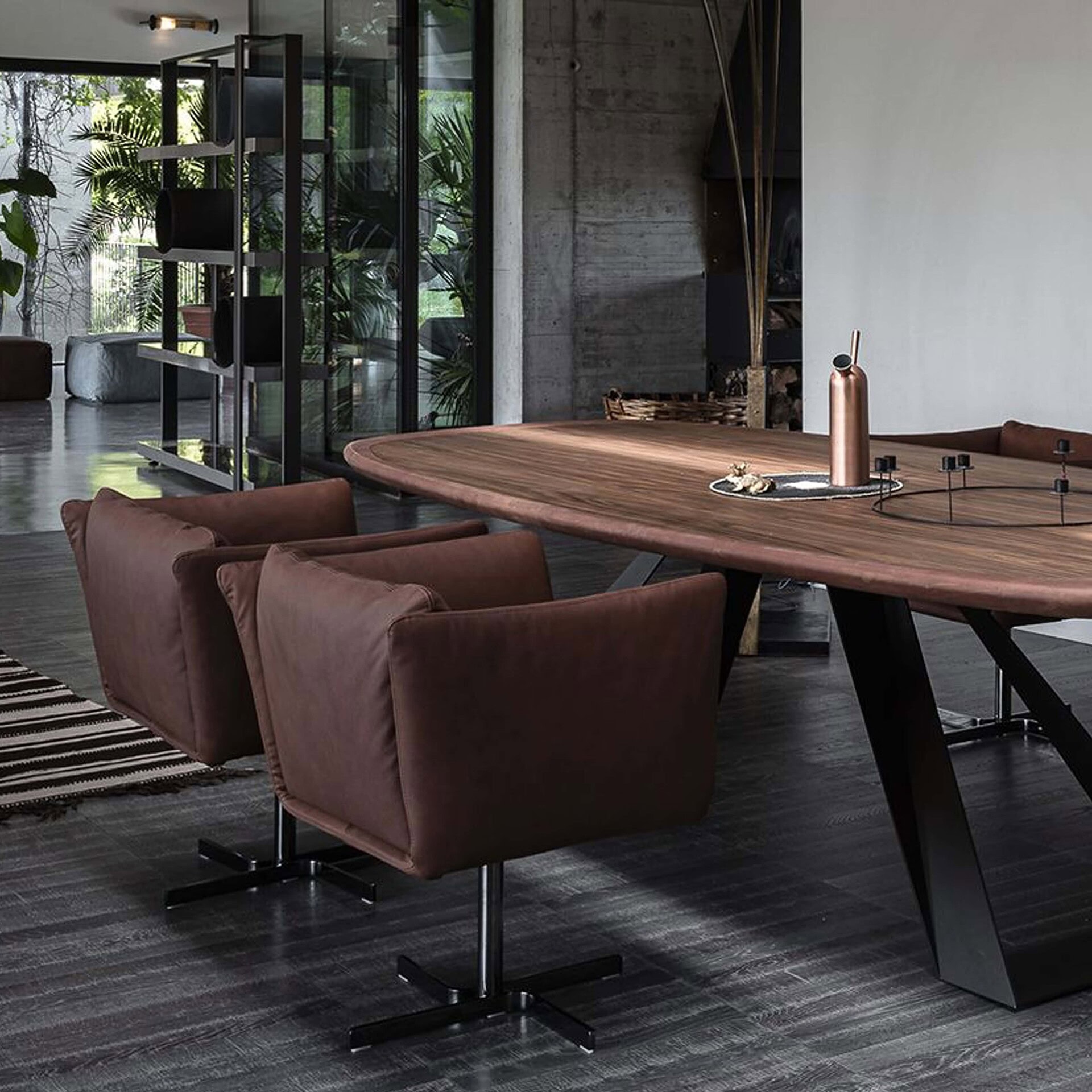 In addition to being sophisticated and practical, the Mademoiselle Swiveling Armchair by Cierre is a versatile seating solution for a modern home. The geometrically inspired silhouette of the chair features a square-shaped seat and pedestal base that complement one another. The chair has a soft upholstery and cushioned lining, so it is comfortable for extended periods of time. Not only that, but it is a great choice not only for a dining room, but also for a living room. Its swivels easily for convenience. The Mademoiselle Swiveling Armchair is handcrafted in Italy to ensure quality, and is easily customized. You can choose from a variety of luxurious leather and fabric upholstery options, as well as stitching colors that match, become lighter, or become darker as you desire. The base is finished in black chrome.