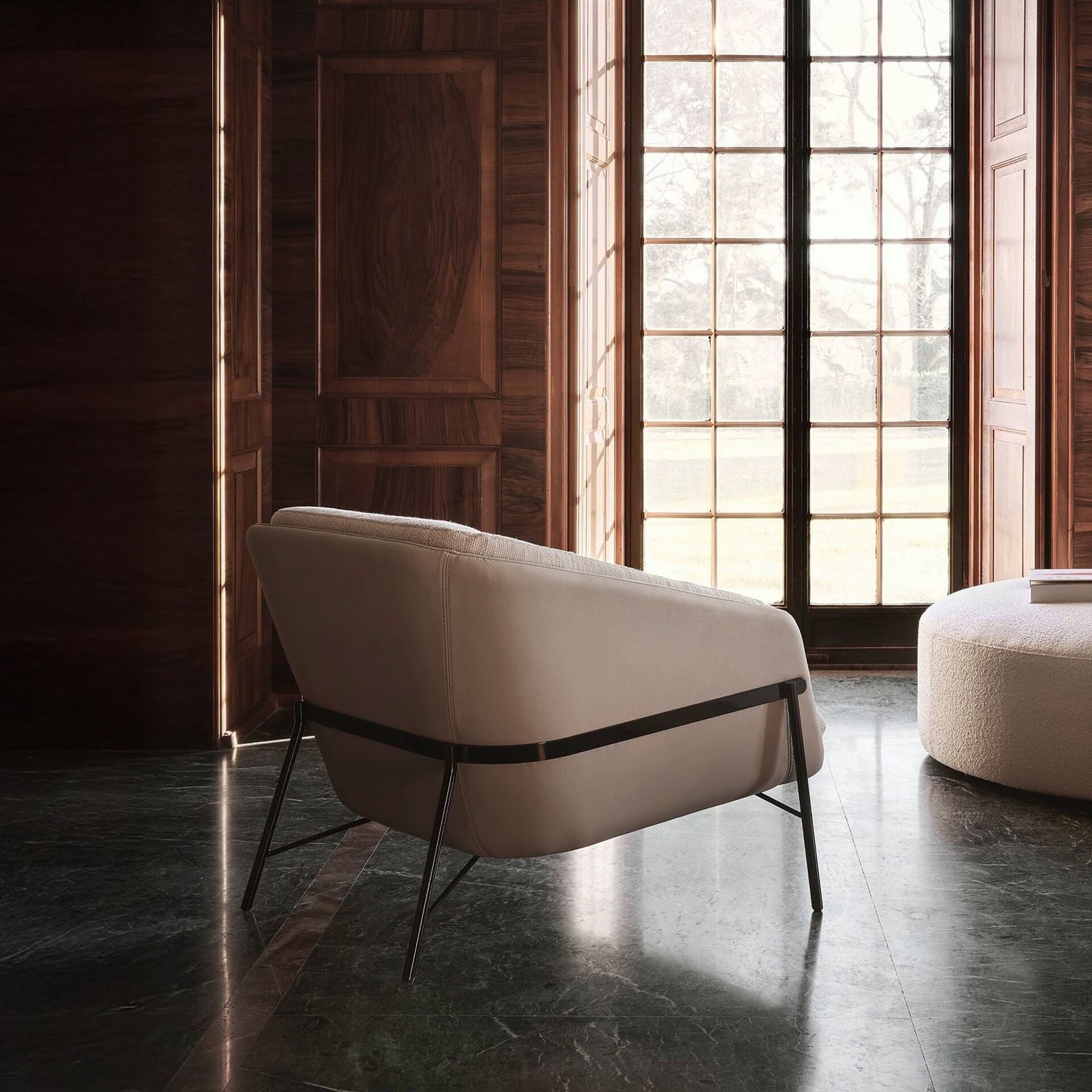 Available in a full range of Nicoline leather and fabric options with customizable stitching colors. Metal structure can be finished in Gunmetal, Antique Bronze, or Satin Brass.