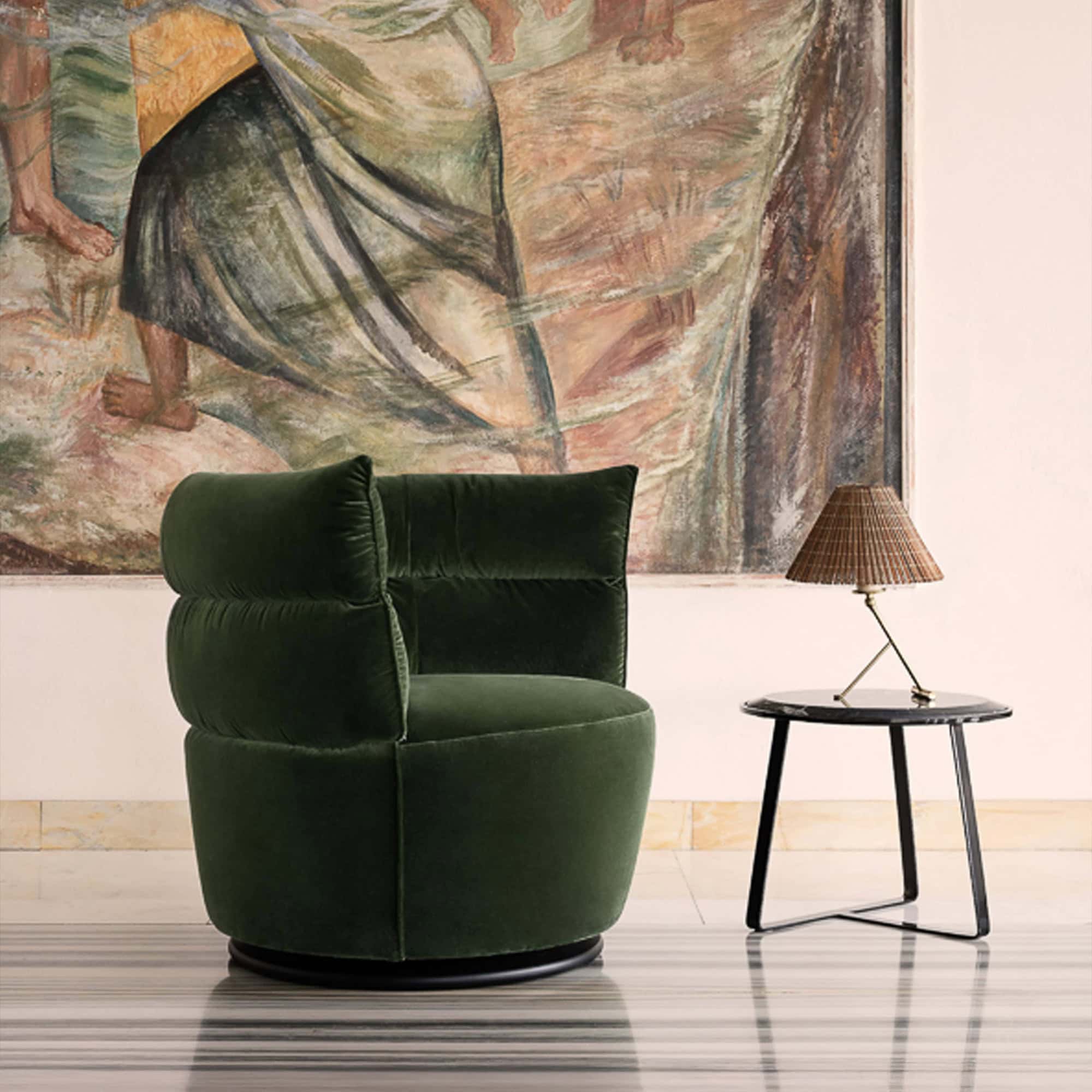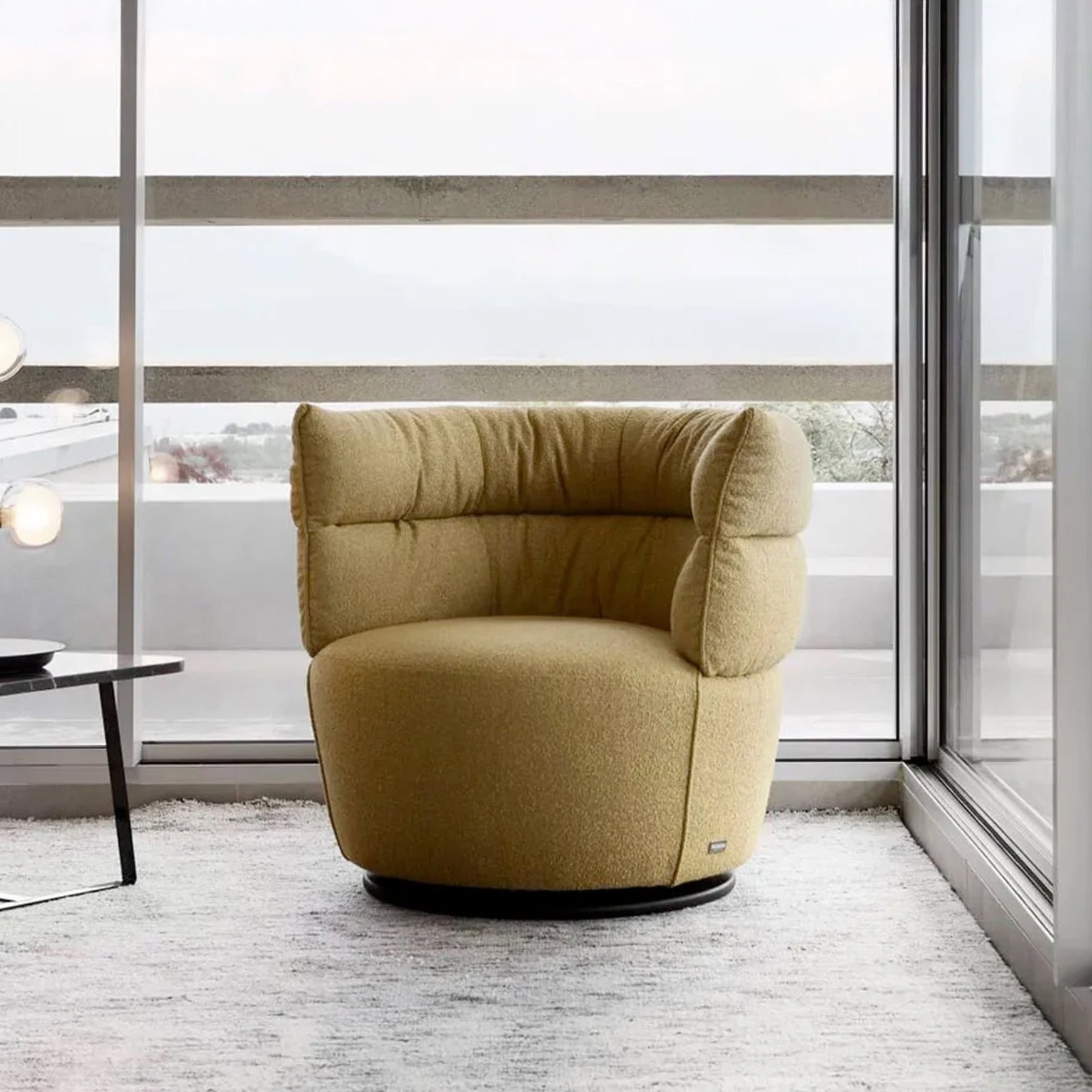 A refined balance of modern elegance and subtle comfort, the Julie Armchair brings sculptural simplicity to any living space. Its low-profile design, generous seat, and softly flared backrest make it the ideal companion for relaxed lounging or sophisticated entertaining. The distinctive black swivel base adds a touch of function and contrast, effortlessly blending into both contemporary and transitional interiors.