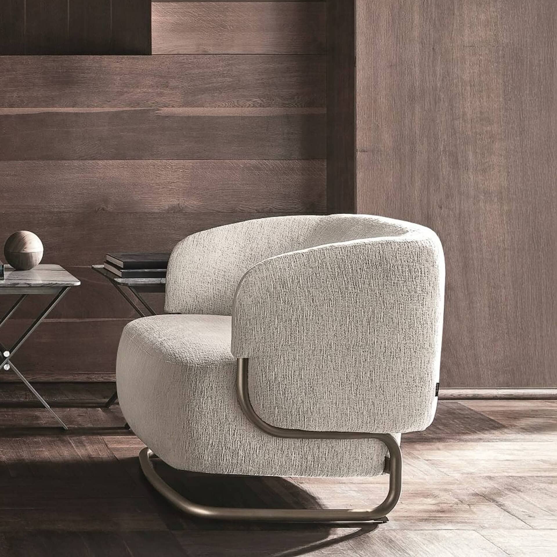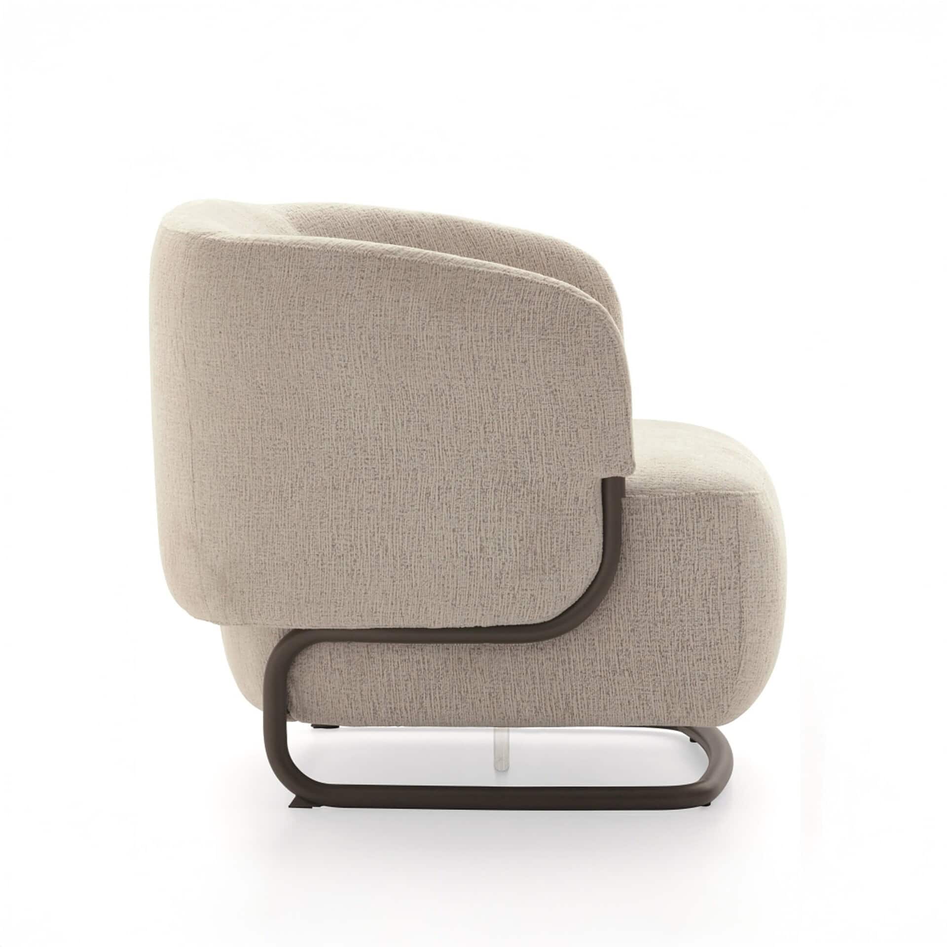 The Marabù Armchair is the perfect blend of form and function, striking a balance between softness and structure. Designed with a voluminous, cushioned seat and backrest, its enveloping form invites comfort while appearing to float effortlessly within a sleek, curved tubular metal base. This airy aesthetic, combined with its low profile and generous proportions, makes it an elegant and sculptural piece for any modern living space. The central support foot in transparent methacrylate adds to its unique visual lightness.