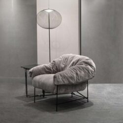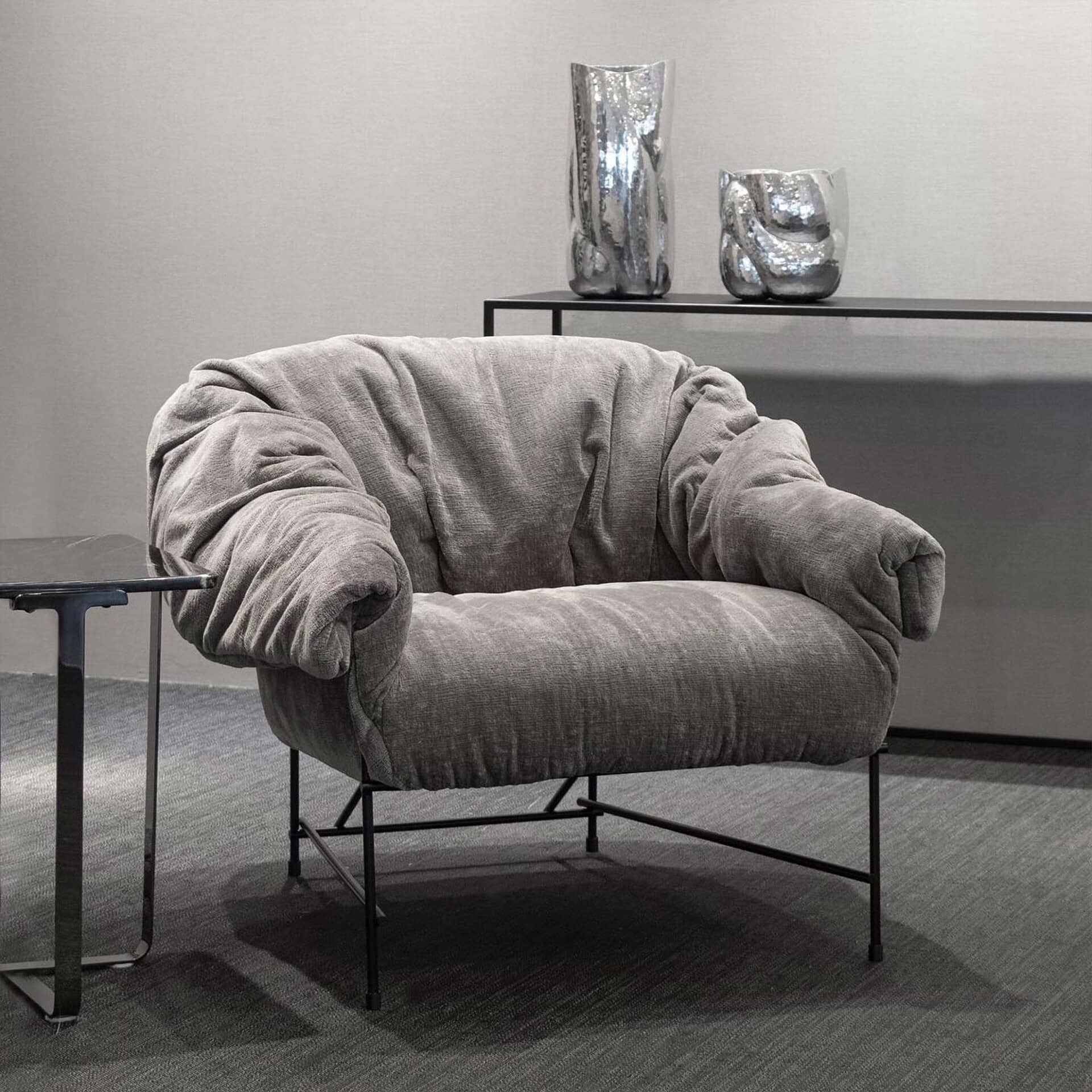 The Octavia Armchair combines comfort with modern aesthetics, featuring a unique crumpled-look upholstery that contrasts beautifully with its rigorous metal frame. This piece epitomizes casual elegance, offering a soft welcome reminiscent of a carefree gesture.