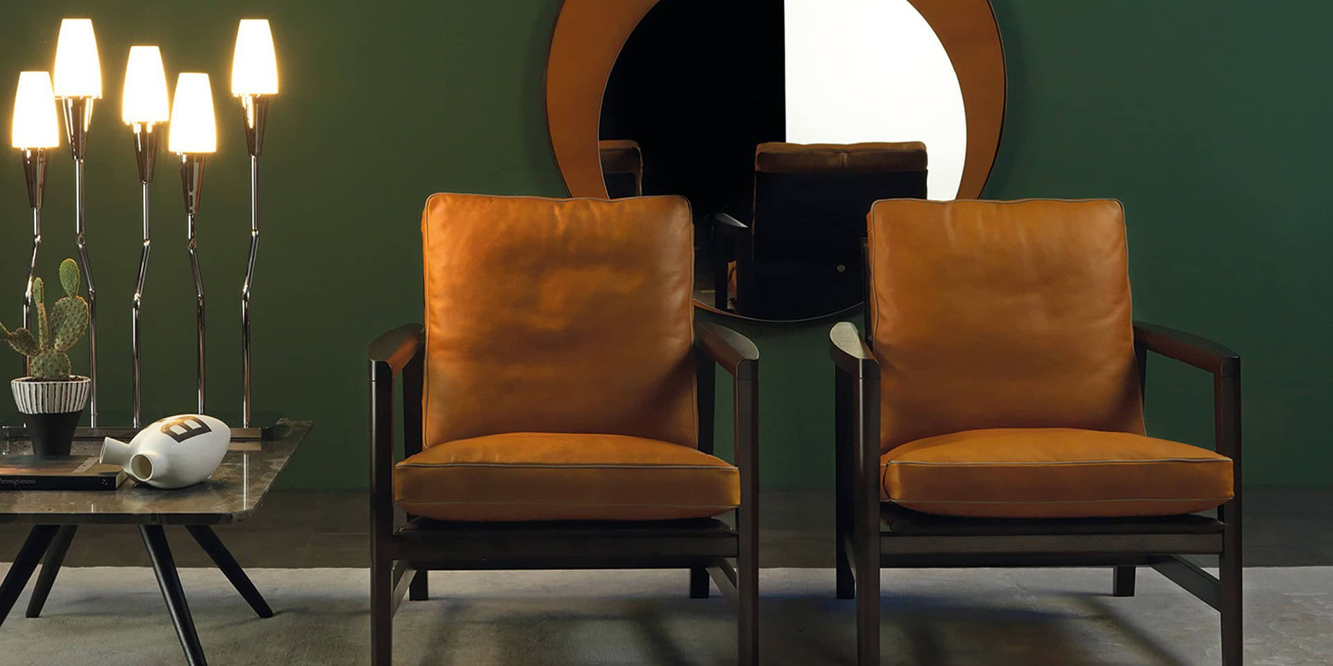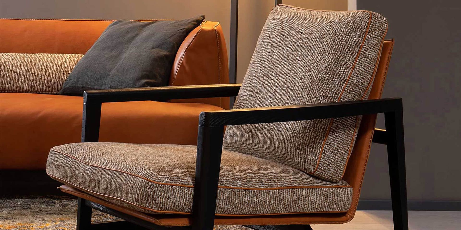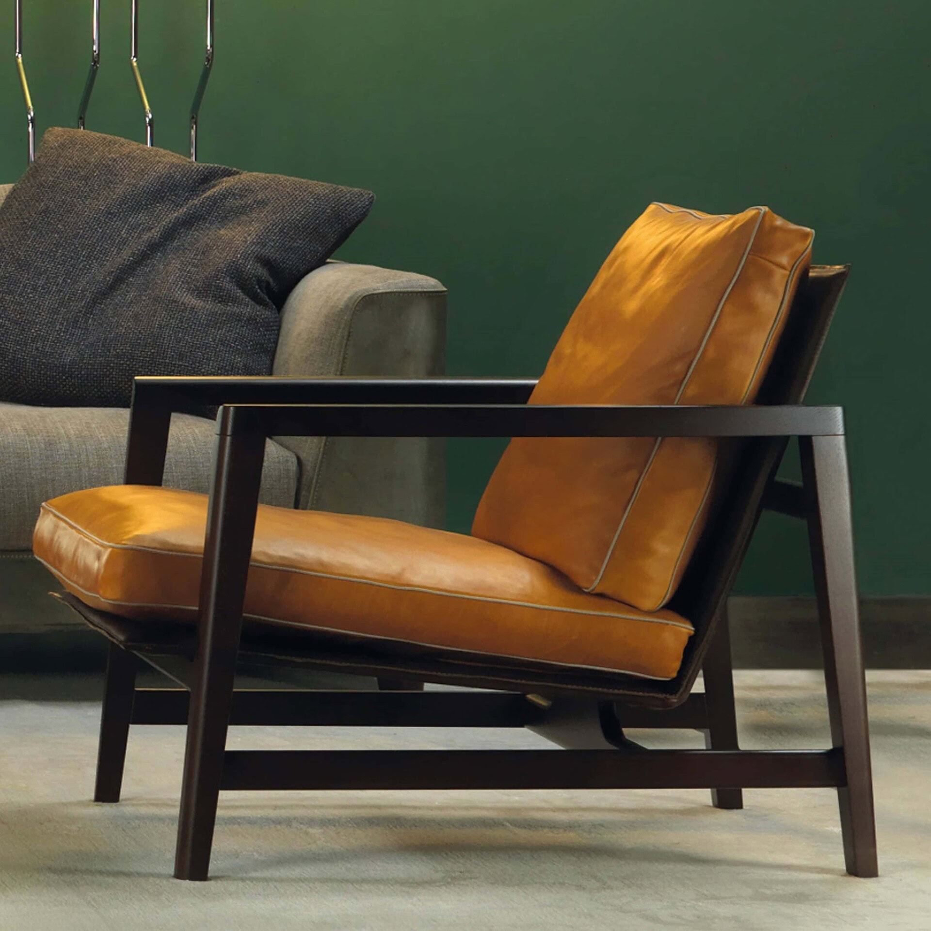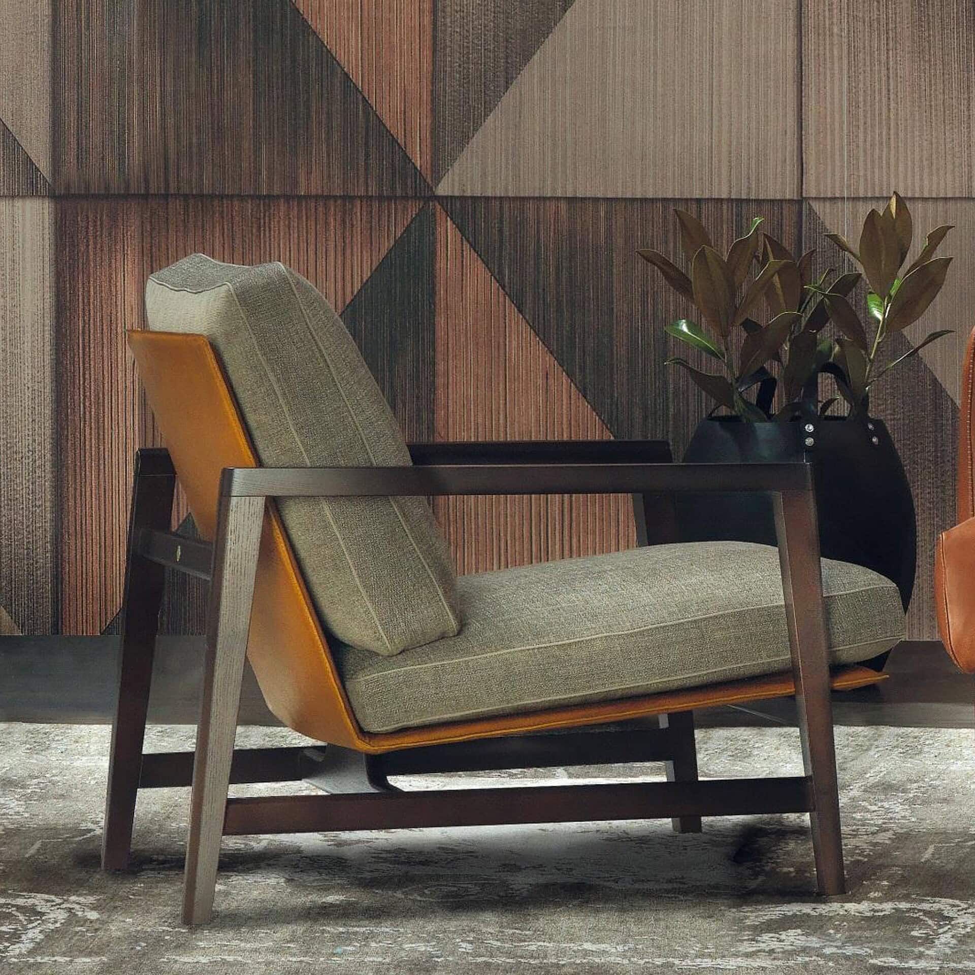 An elegant armchair with a classic Scandinavian design made of oak or Canaletto walnut. Sean contrasts well with any sofa. A metal frame supported by upholstery made of vegetable-tanned leather with a raw-cut finish supports the seat and back, which are made of fabric or leather. A cleanly designed armchair that is also intended for large hospitality and commercial spaces has great versatility thanks to the precious vegetable-tanned leather and the extraordinary fusion of materials and colors.